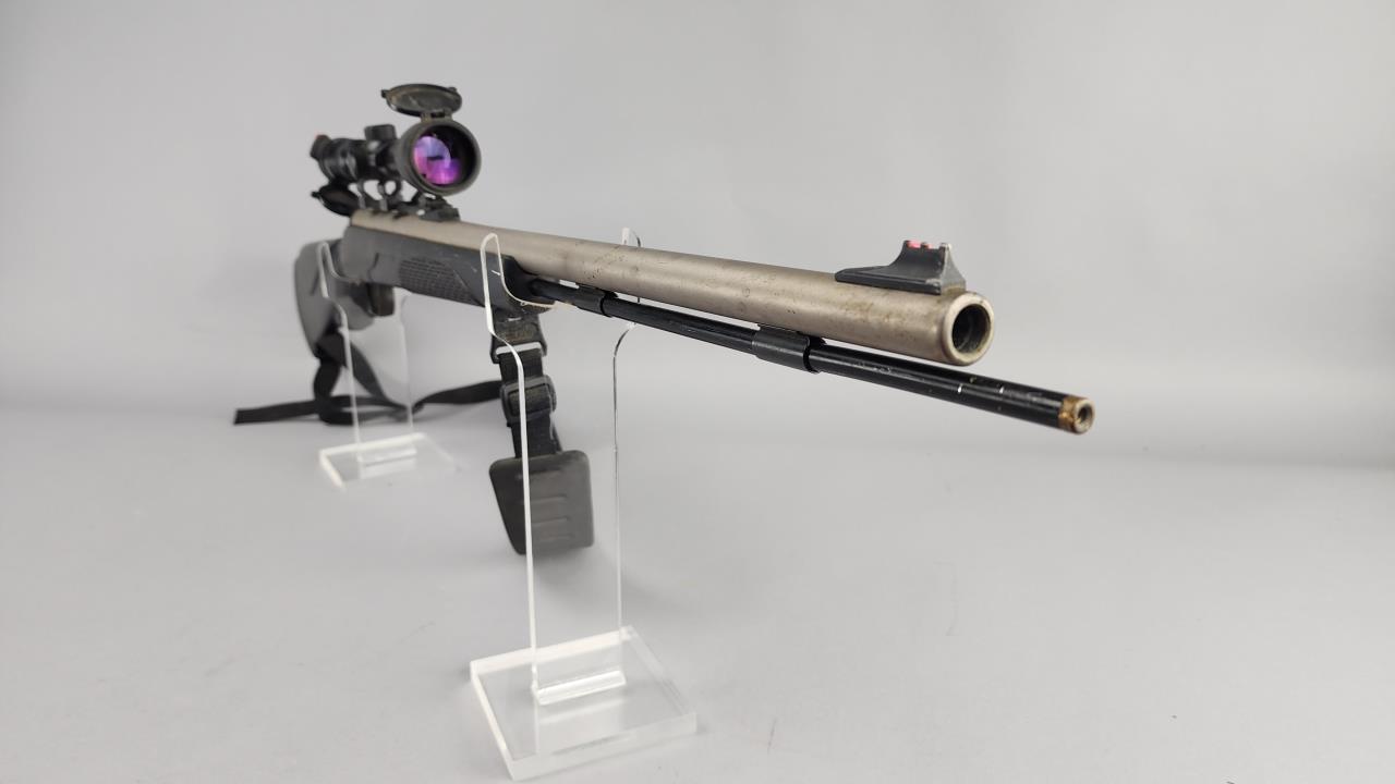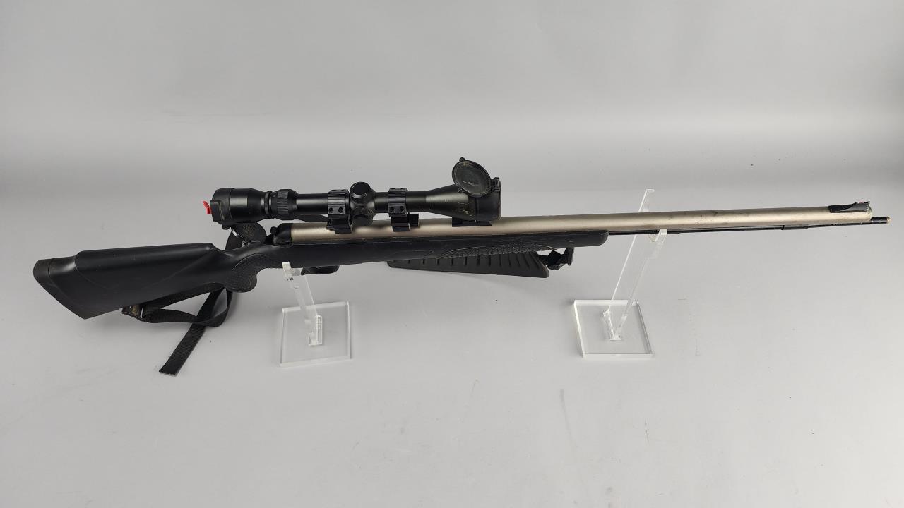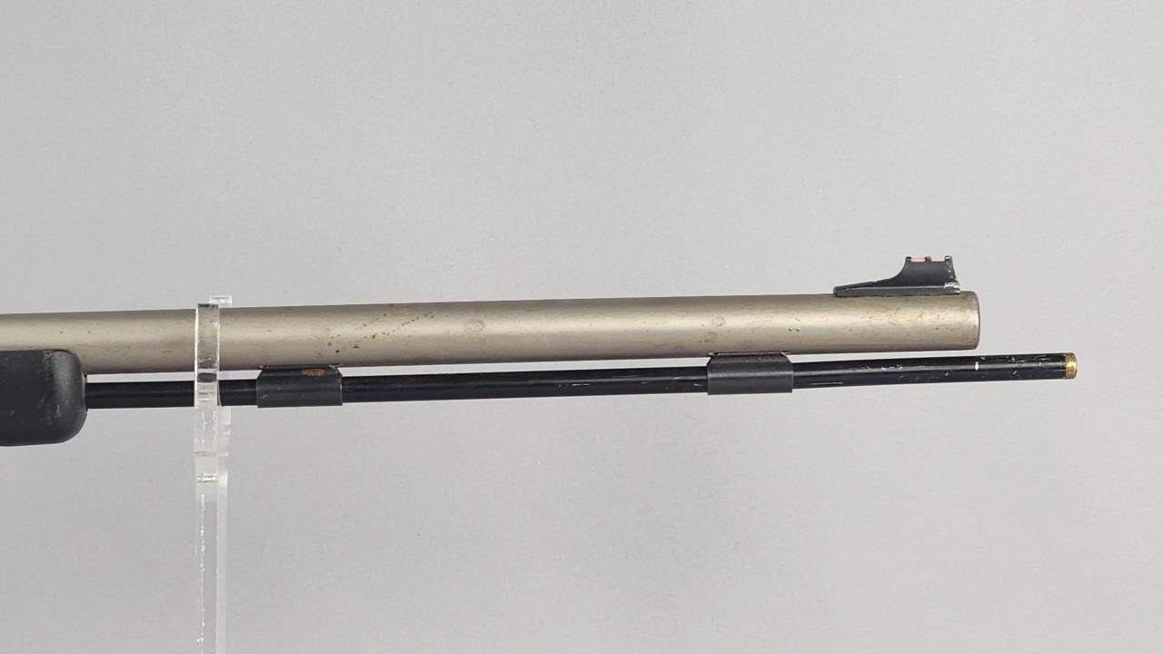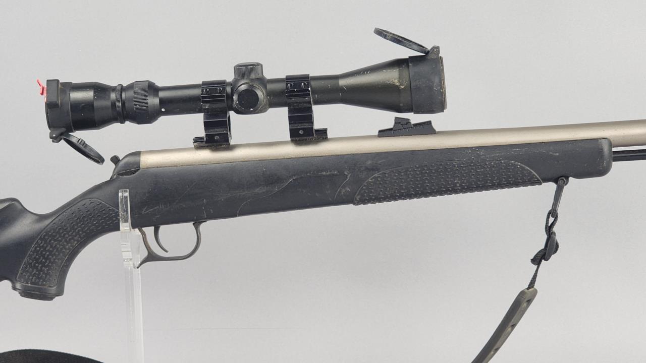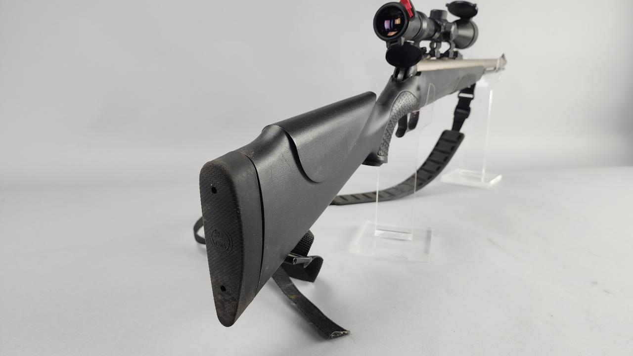 CONDITION: The rifle shows signs of use, with surface marks and light wear visible on the stainless steel barrel and synthetic stock. The molded texturing on the grip and forearm remains intact and functional. The optics on the Pine Ridge scope exhibit dust accumulation but no obvious cracking or heavy scratches. The recoil pad at the buttplate shows general wear consistent with use. The fiber optic sights are intact and functional. The rifle bore was not visible in the provided images, and functionality of the action was not tested. Overall, the rifle is in a used condition with visible signs of handling but appears complete with no major defects observed in visible components.