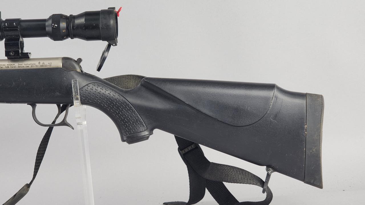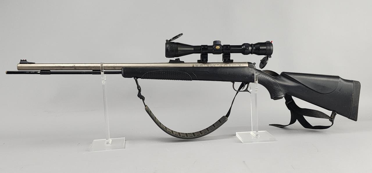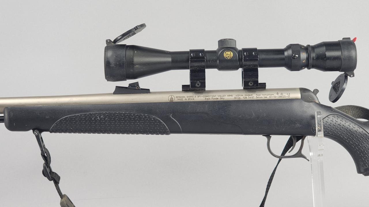 Connecticut Valley Arms Kodiak Magnum .50 caliber black powder rifle. This single-shot muzzleloading rifle is equipped with a 28-inch stainless steel barrel and features a 1:28 twist rate, ideal for black powder ammunition. The rifle is marked on the barrel with manufacturer information, including ‘Bergara Barrels BPI – Connecticut Valley Arms – Kodiak Magnum’, and ‘Made in Spain’. It is fitted with a synthetic stock in black finish, showcasing molded texturing on the grip and forearm for improved handling. The rifle includes a Pine Ridge 2.5×5 power scope mounted with black rings and covers by Butler Creek. The front sight is a red fiber optic bead, and the rear sight is an adjustable green fiber optic. The rifle also has a black nylon sling attached and a practical recoil pad at the buttplate, providing added comfort during shooting. This black powder rifle requires local pickup only due to hazmat shipping restrictions.