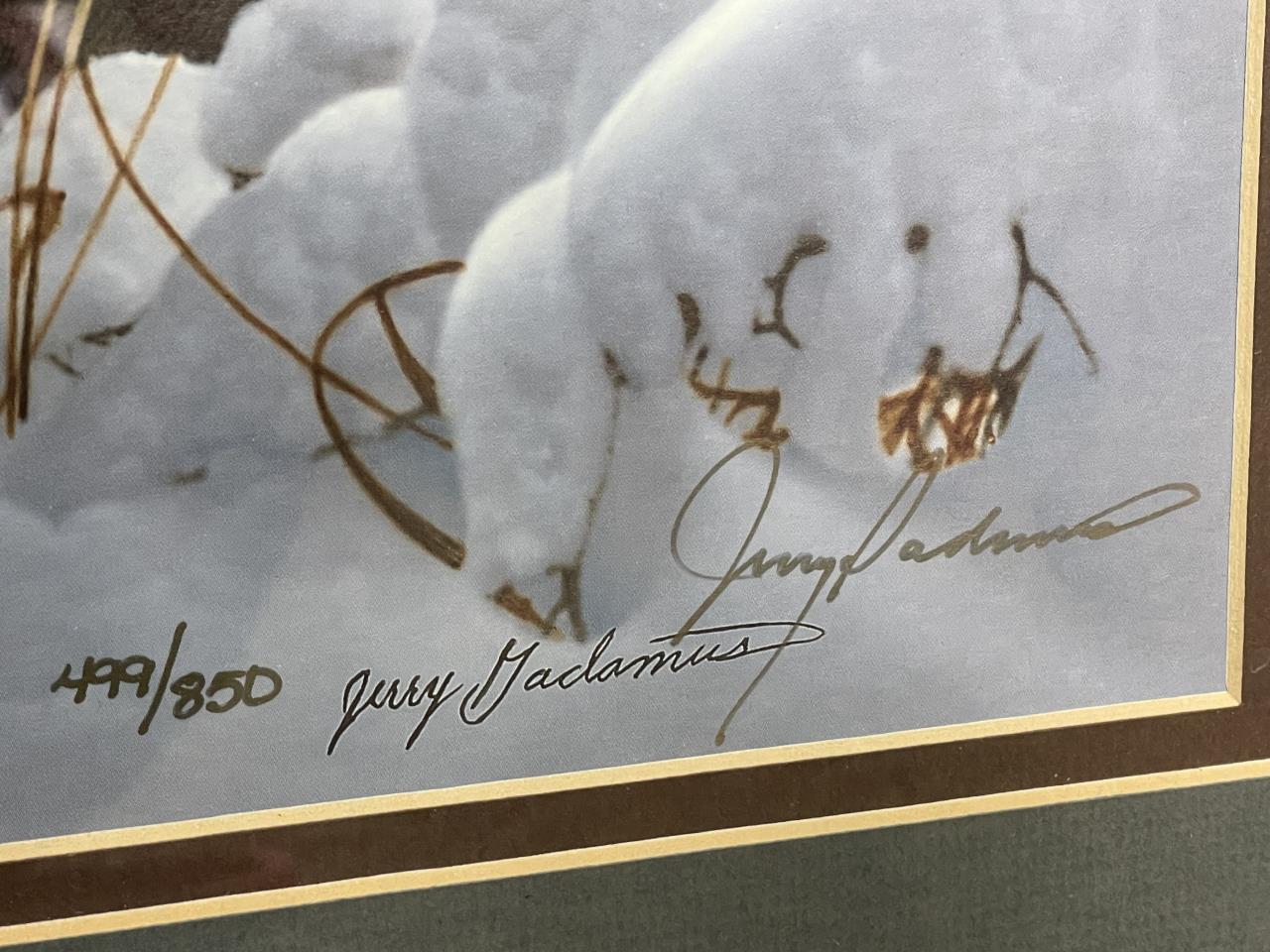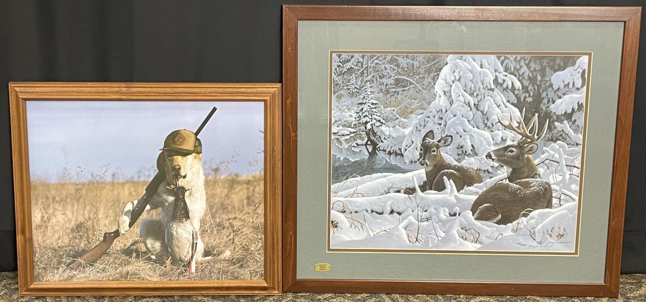 Lot includes two framed artworks featuring outdoor wildlife themes. The first is a limited edition, signed and numbered print titled ‘Winter Whitetails’ by artist Jerry Gadamus, depicting two deer in a snowy forest, numbered 499/850 and measuring 29 x 25 inches, presented in a wooden frame with a green mat. The second is a photographic print of a hunting dog holding a duck, adorned with a hunting cap and shotgun, measuring 22 1/2 x 18 1/2 inches, also within a wooden frame. Both pieces are ready to hang and exhibit classic wildlife and hunting imagery.