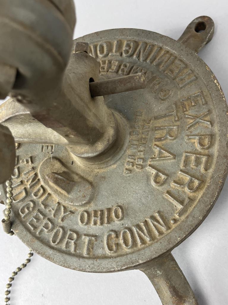 Remington Arms Expert Trap Thrower and DuPont Skeet Disc Thrower set. The Remington Arms trap thrower is marked ‘Remington Expert, Patented’ on the cast iron base, with additional stamped text indicating ‘Bridgeport, Conn.’ and ‘Findlay, Ohio, USA.’ It features a spring-loaded design, adjustable throwing arm, and chain-operated triggering mechanism. The DuPont skeet disc thrower is constructed of metal with a rustic bronze finish and prominently marked ‘DuPont’ on the main arm. Both pieces were designed for competitive or recreational shooting, offering durable, functional components for clay target practice.