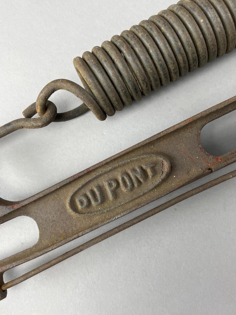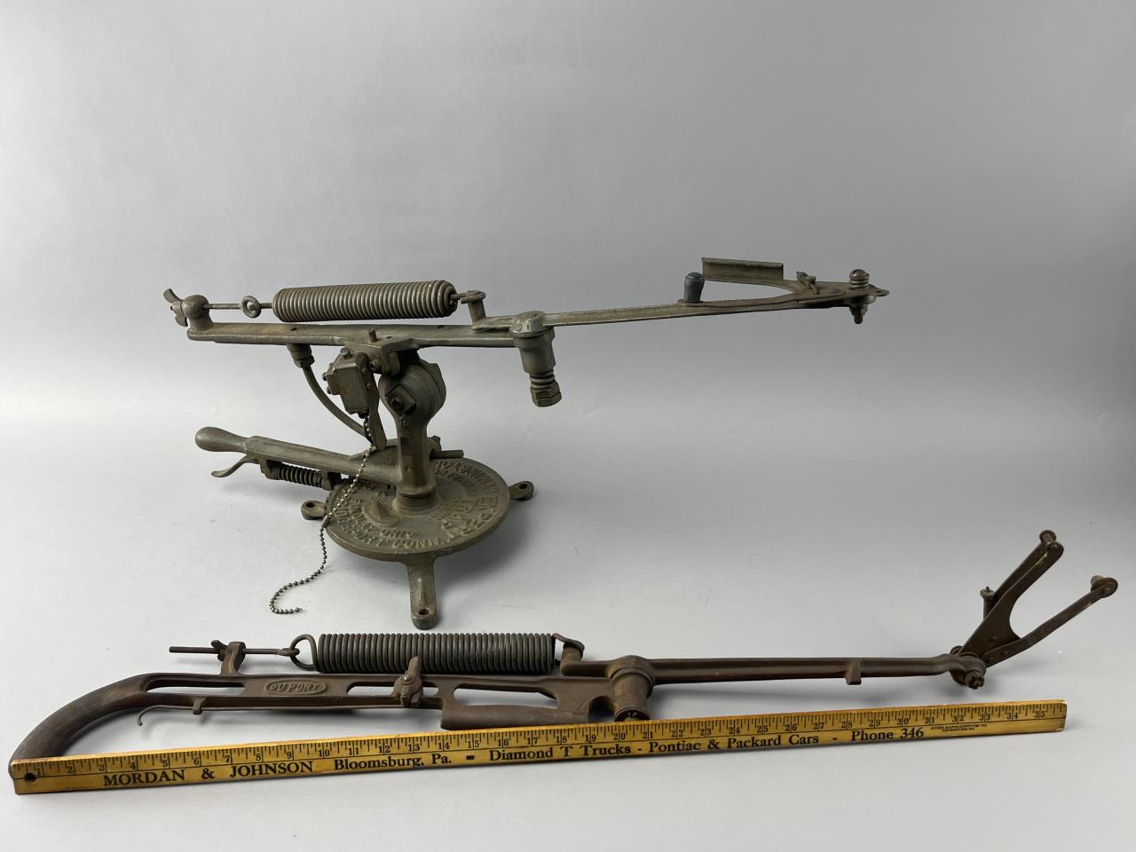 CONDITION: The Remington trap thrower exhibits surface rust, moderate pitting, and overall patina consistent with age and prior use. The spring tension appears functional, but the mechanical condition has not been tested. The DuPont skeet thrower displays similar rust and patina, with light wear on its main structural components. No missing or broken parts are noted. Both pieces show signs of previous use and storage but appear complete and structurally sound upon visual inspection.