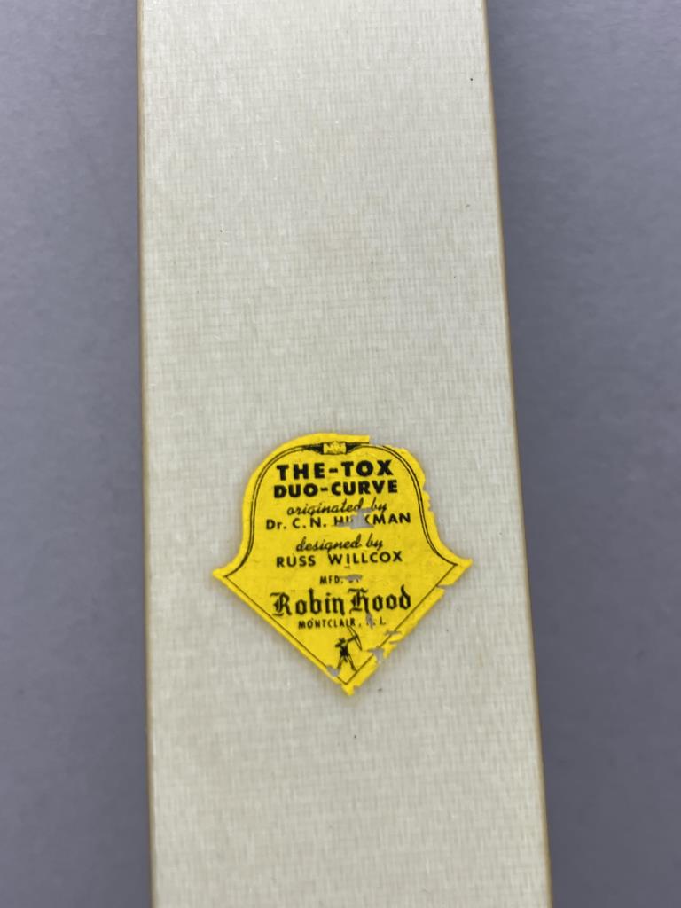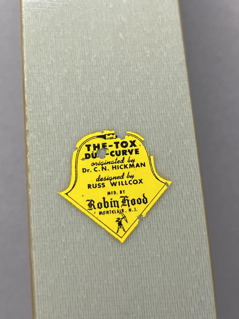 Pair of The-Tox Duo-Curve Robin Hood bows, each measuring 58 inches in length. Manufactured by Robin Hood Archery of Montclair, NJ, these traditional recurved bows were originated by Dr. C.N. Hickman and designed by Russ Willcox. The bows feature laminated wood risers with distinctive curved profiles and limbs constructed with a light-colored material. Original yellow Robin Hood Archery decals are affixed to the limbs, providing manufacturer details and preserving the vintage authenticity of these collectible bows.