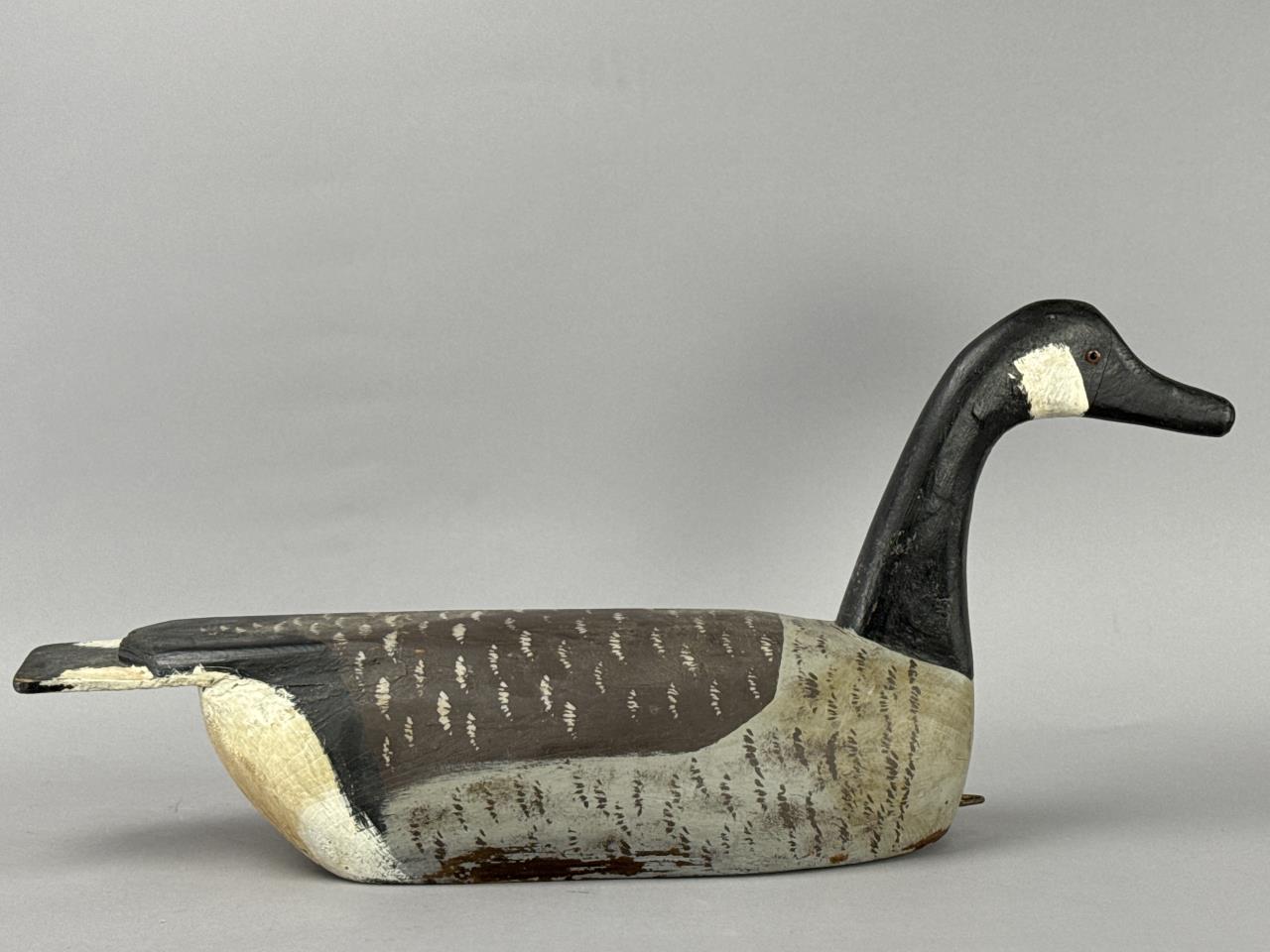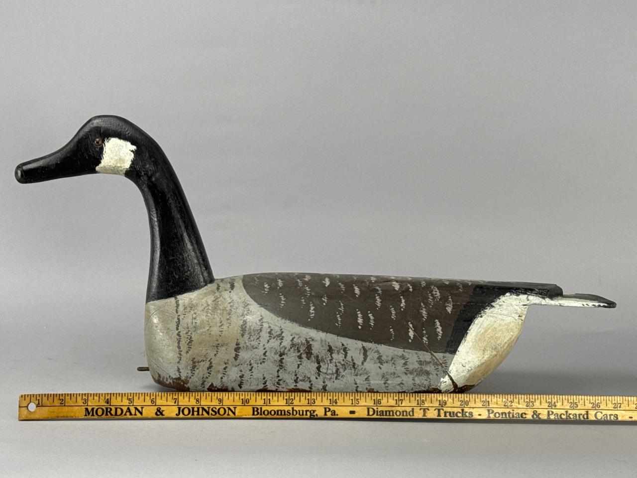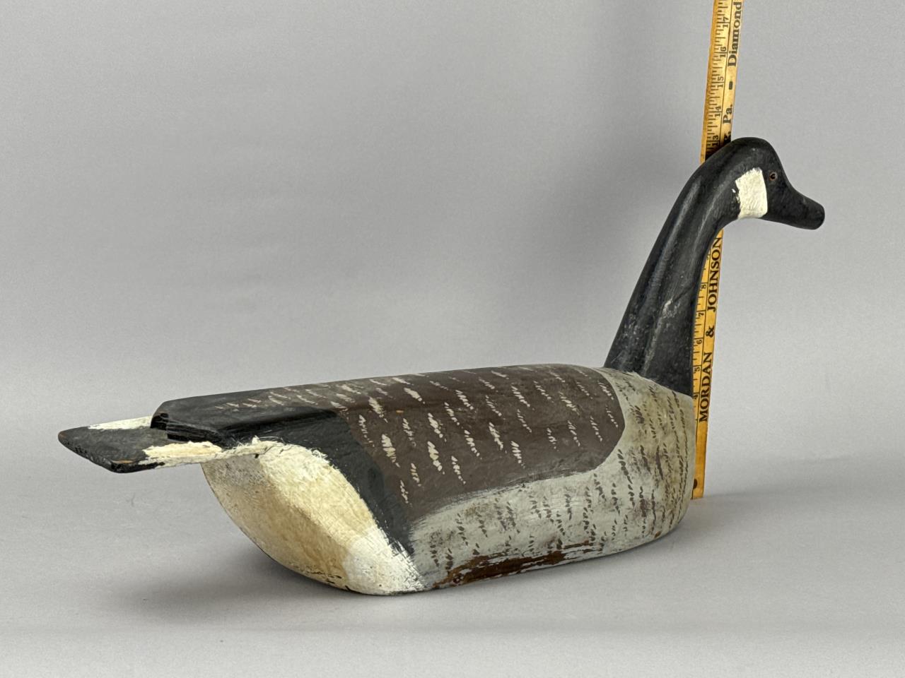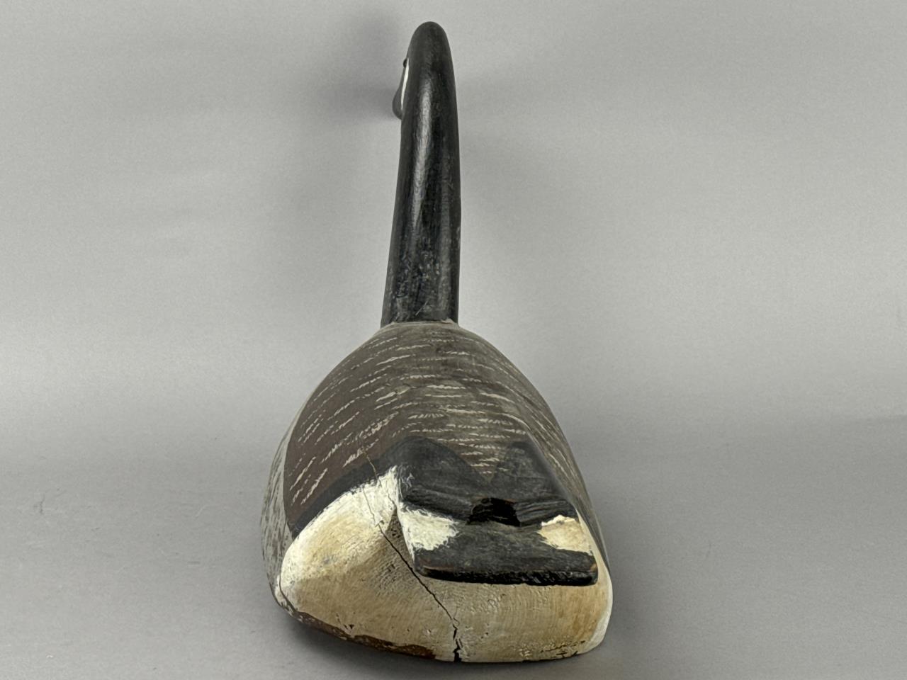 Vintage Canadian Goose decoy measuring approximately 30 inches in length. This hand-painted, hollow-bodied wooden decoy features a black head with white cheek detailing, a gray and brown body with painted feather patterns, and a rigid tail insert. The bottom of the decoy is fitted with a ballast weight for stability on water, securely attached with screws. The craftsmanship and painted details suggest use as a working decoy, possibly for hunting or decorative purposes.
