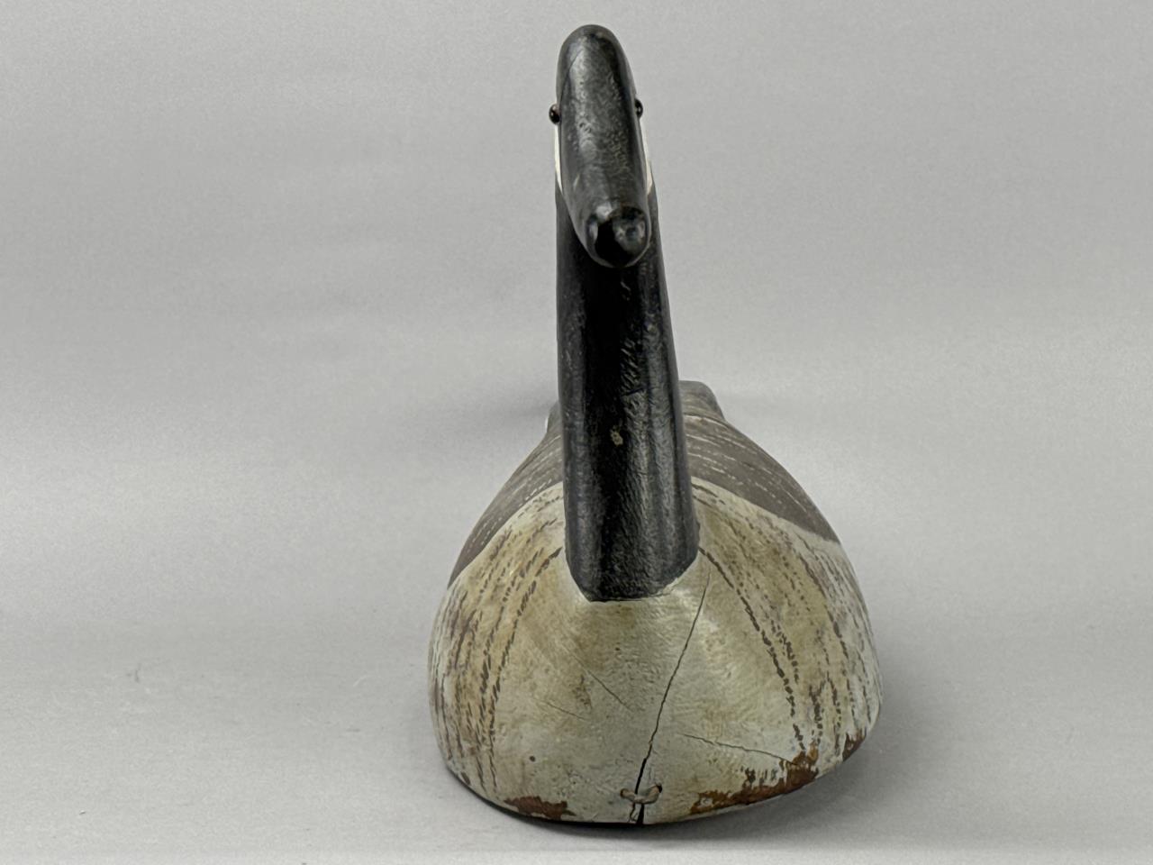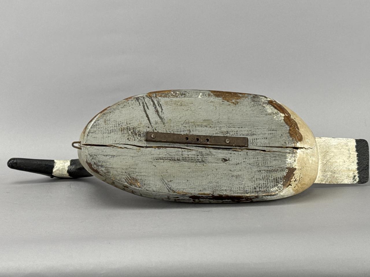 CONDITION: The decoy exhibits evident signs of use and age, including areas of paint loss, surface wear, and cracks visible along the body and underside. A notable split runs longitudinally along the base, but the structure remains intact. The paint shows moderate fading, particularly in high-contact areas. The ballast weight is securely affixed, and the overall form remains stable. No significant missing components are observed.