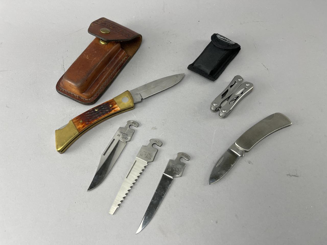 A lot of multi-function utility folding knives, including a Case XX folding knife and a Sheffield folding knife. The Case XX knife features a brass bolster, a jigged bone-style handle, and interchangeable blades. Three replacement blades are included as part of this set, with distinct cutting and sawing edges. The knife comes with its original leather sheath, marked ‘CASE XX,’ showing functional brass snap closure. The Sheffield folding knife exhibits a stainless steel construction with a minimalist design and includes its original black nylon sheath, marked ‘Sheffield.’ A compact stainless steel multi-tool with pliers, knife blade, and other fold-out tools is also included in this lot.