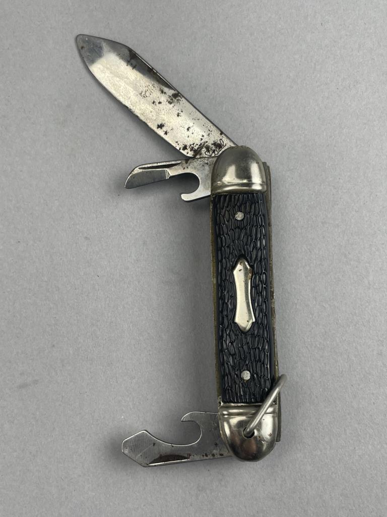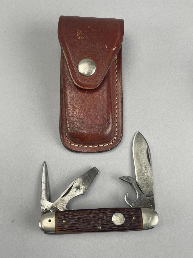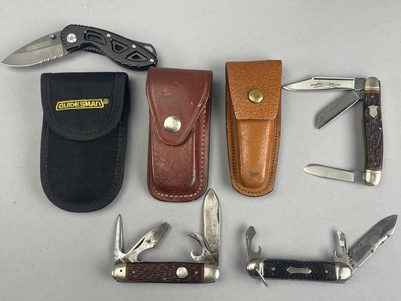 CONDITION: The Guidesman knife is in very good condition, showing minimal signs of use. The Parker Cut Co Razors Edge knife is in overall nice condition with clean blades and minimal wear on the handle. The three-bladed pocket knife displays moderate wear and patina on the blades, and the leather case associated with it shows scuffing and handling wear. The multifunction pocket knife has visible discoloration and surface rust on the blade, with general wear to the handle. Leather cases have varying degrees of handling wear, including scuffs and finish loss.
