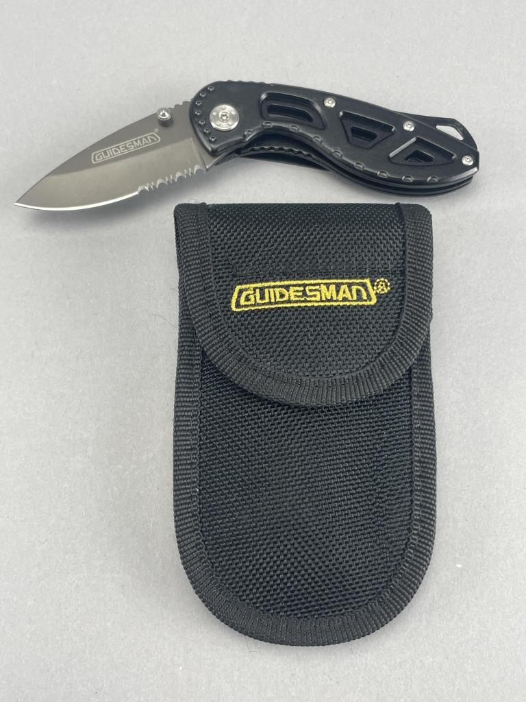 Set of four assorted knives comprising multiple brands. The set includes a Guidesman folding knife with black-coated stainless steel blade and cutout frame design, accompanied by a black nylon Guidesman-branded case. A Parker Cut Co Razors Edge folding knife with two stainless steel blades, featuring a brown jigged bone handle with an inlaid silver shield and brass pins, housed in a light brown leather case. A three-bladed pocket knife with a jigged plastic handle and nickel bolsters, appearing to be vintage, accompanied by a dark brown leather case. Lastly, a multifunction pocket knife with a textured black composite handle and nickel bolster, integrating additional tools such as a bottle and can opener. One knife is without a case.