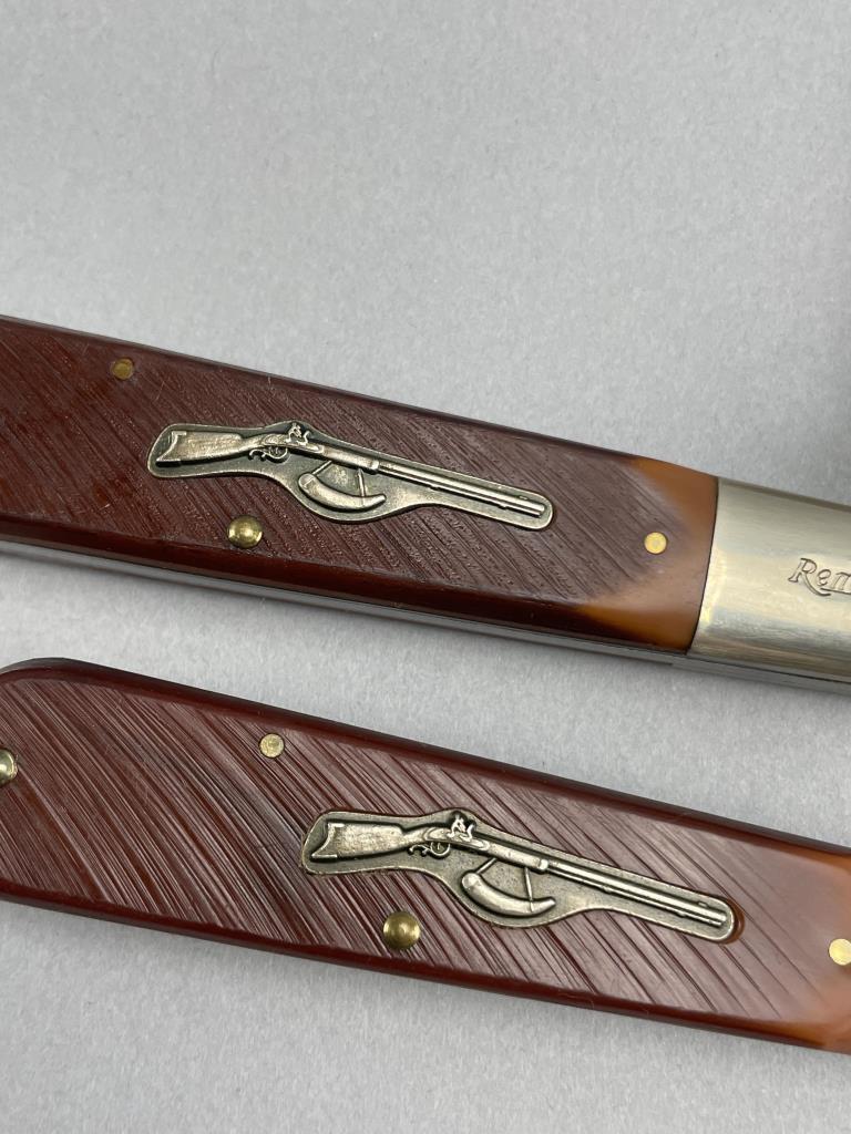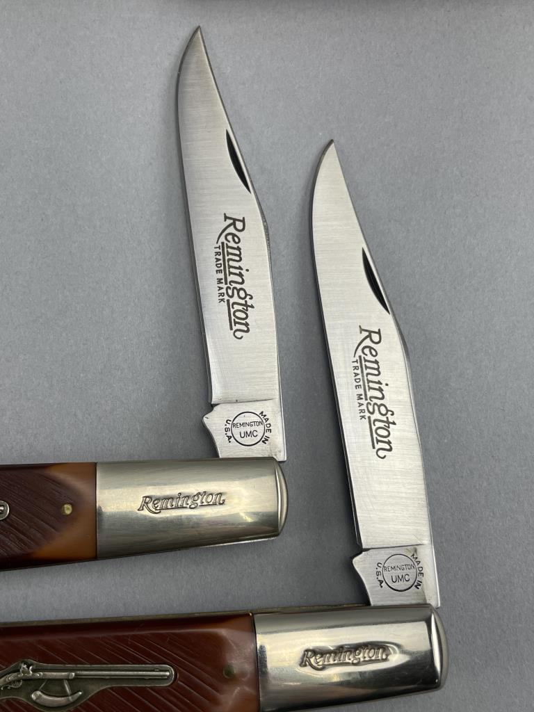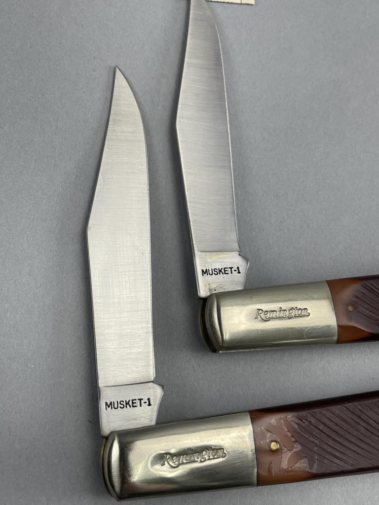 Two limited-edition Remington “Daddy Barlow” series folding knives from the Musket Knife Series, both model MUSKET-1. Each knife features a single stainless steel blade etched with “Remington Trade Mark” and the “Made in U.S.A.” logo near the ricasso. The handles are crafted from simulated jigged bone with an inset musket emblem on one side and fitted with polished nickel bolsters. Both knives are housed in their original Remington-branded boxes and include matching factory inserts detailing the series.