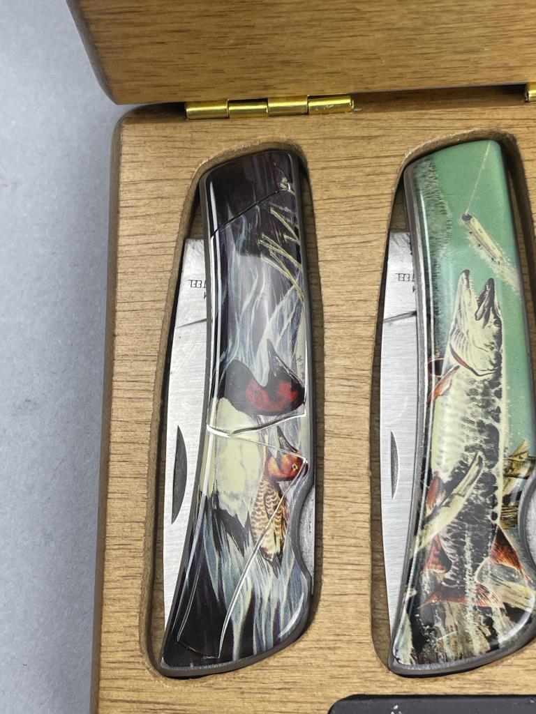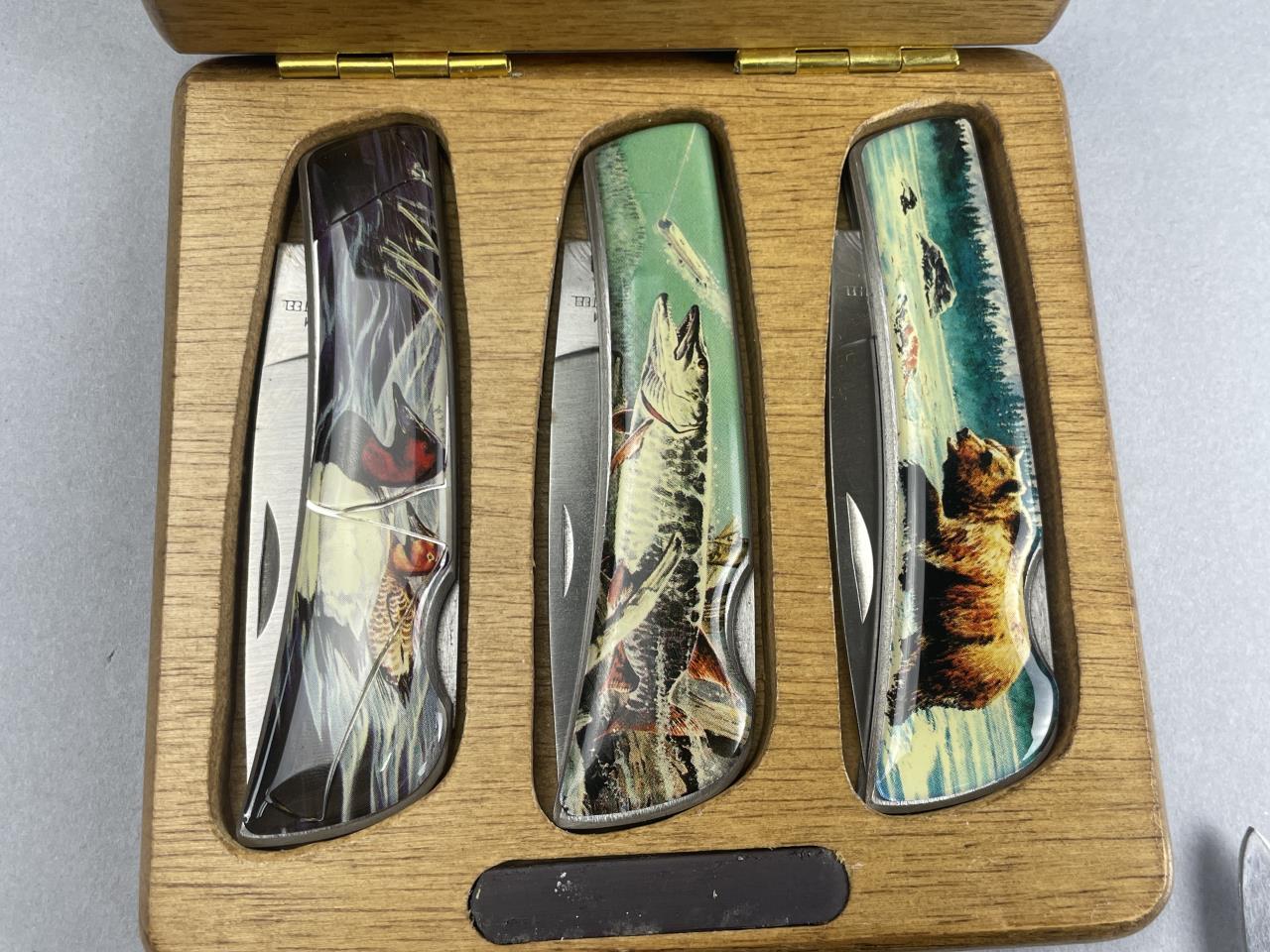 CONDITION: The knives display light handling wear consistent with previous use and storage. One of the fishing-patterned knives in the wooden box has a broken/cracked handle, as visible in the provided images. The blades and engravings otherwise appear to be in functional condition with no visible rust, chips, or major damage. The wooden presentation box shows minor surface wear, with a small area of adhesive residue on the top.