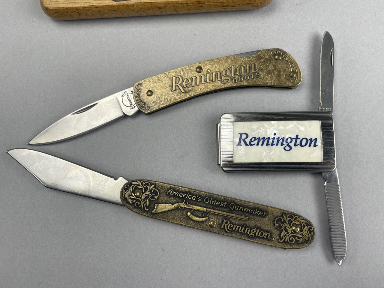 A set of three collectible Remington-branded knives and three additional fishing-themed knives housed in a wooden presentation box. The Remington knives feature engraved brass handles with decorative motifs celebrating the brand’s history, including ‘Eliphalet Remington II’ and ‘America’s Oldest Gunmaker.’ The fishing-patterned knives in the wooden box display colorful scenes of outdoor wildlife. One fishing-patterned knife in the wooden box has a visible crack in the handle. The items are attractively presented, making them suitable for display or collection.