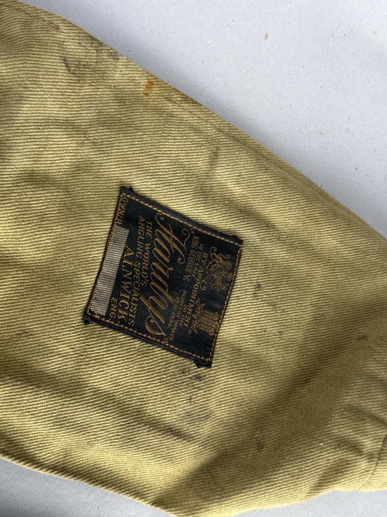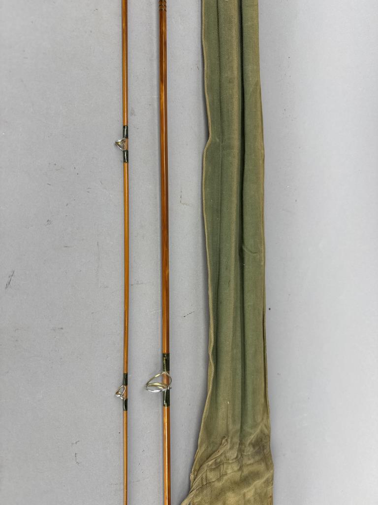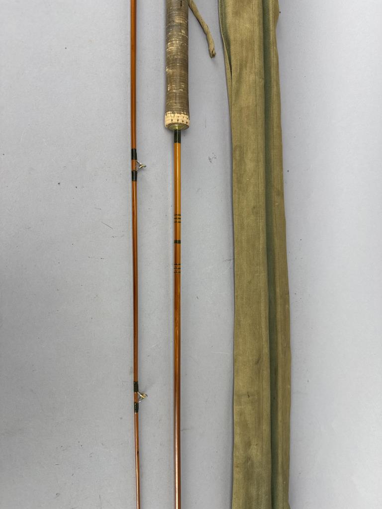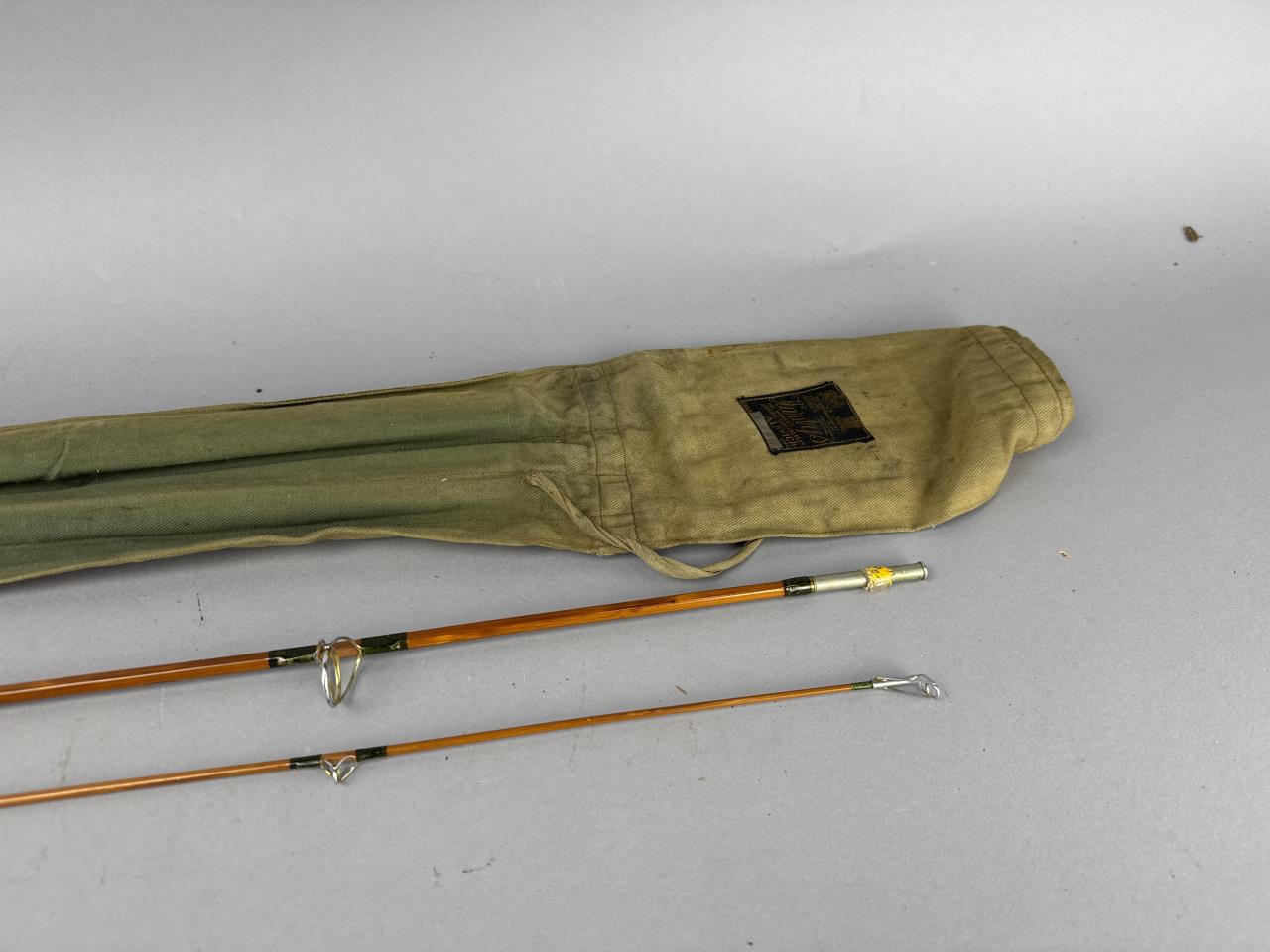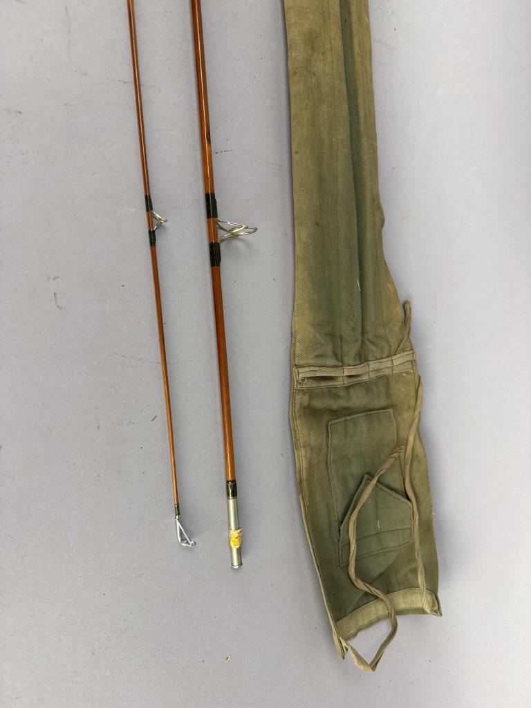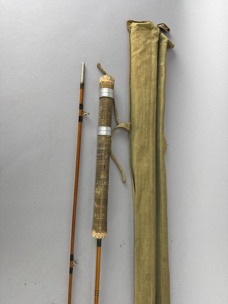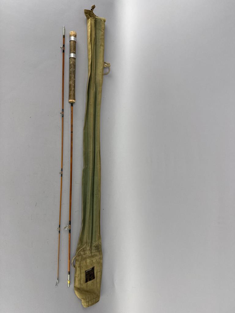 CONDITION: The fishing rod shows visible wear consistent with use, particularly on the cork grip, which has darkened and has areas of surface abrasions. The varnish on the split cane sections displays minor scuffing, but no cracks or structural damage are observed. Metal ferrules and wrapping are intact, with slight oxidation present on the metal surfaces. The accompanying canvas case shows age-related wear, including staining and loose stitching around the edges. Overall, the rod remains functional and displays well.