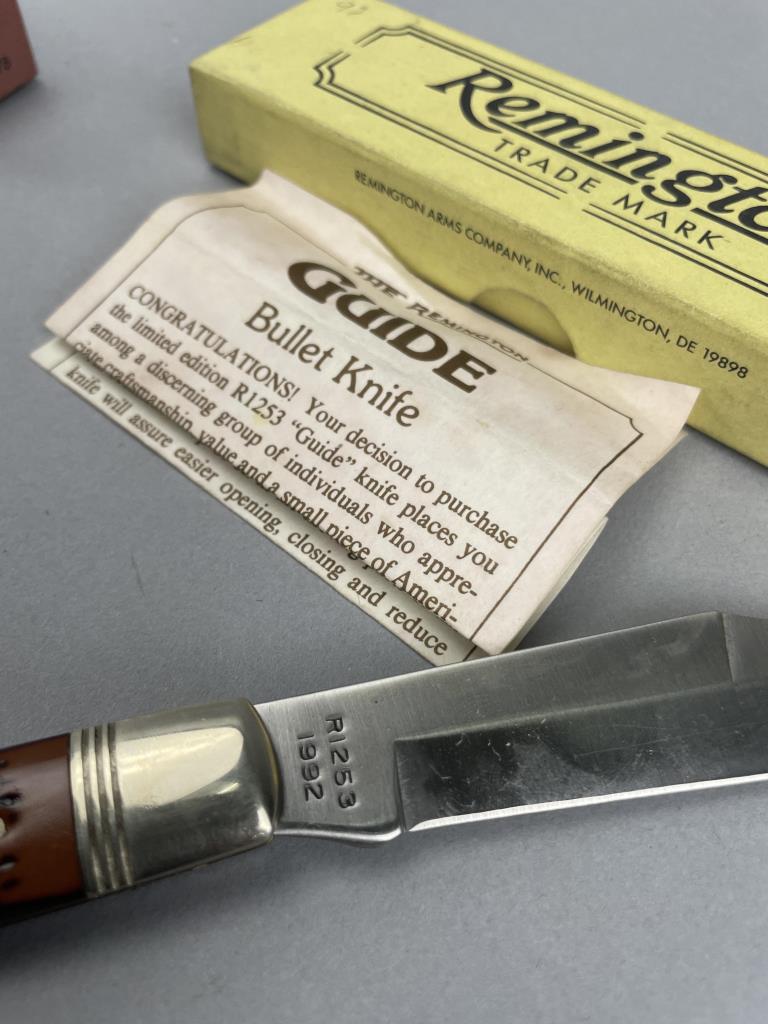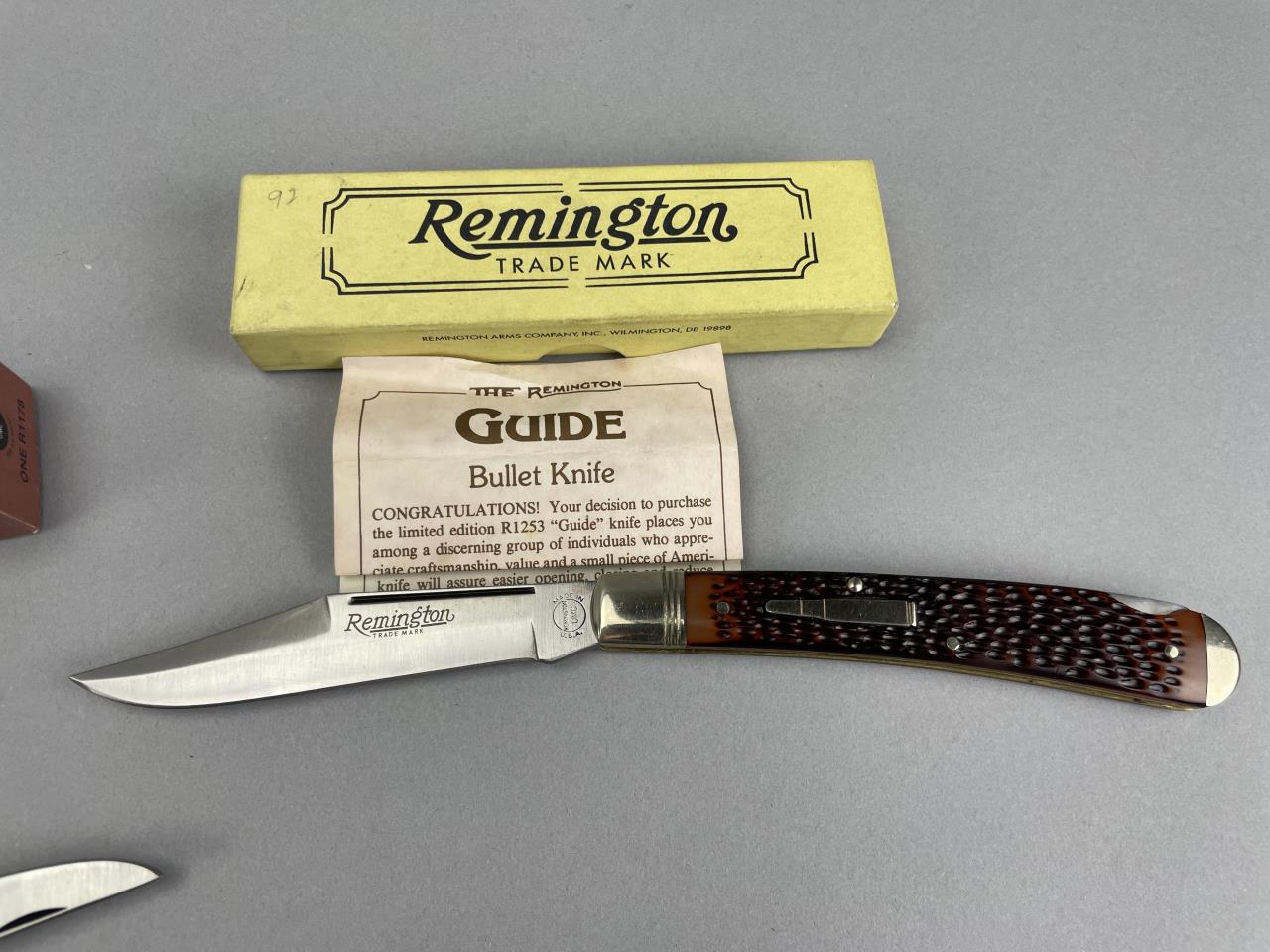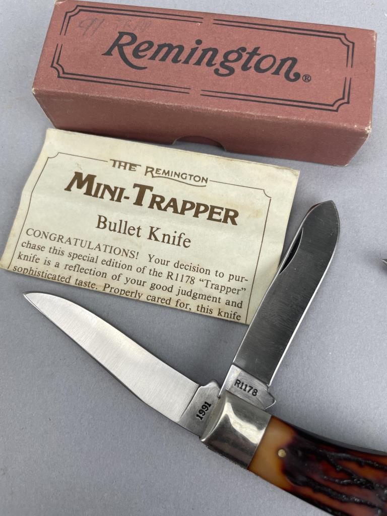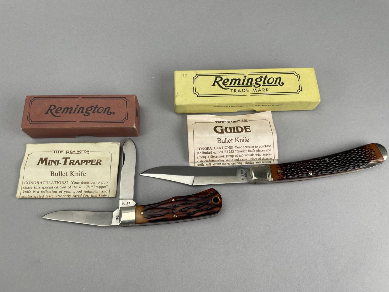1991 Remington Mini-Trapper knife, model R1178, and 1992 Remington Guide knife, model R1253, both presented in original boxes with accompanying paperwork. The Mini-Trapper features two stainless steel blades stamped with the model number and year (1991) and showcases jigged bone-style synthetic handles accented with nickel silver bolsters. The Guide knife displays a single stainless steel blade marked with the model number and year (1992), also fitted with jigged bone-style synthetic handles and nickel silver bolsters. Both knives are collectible limited editions by Remington, retaining their period-appropriate presentation.