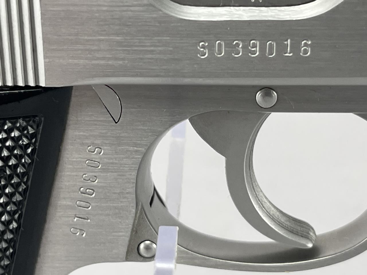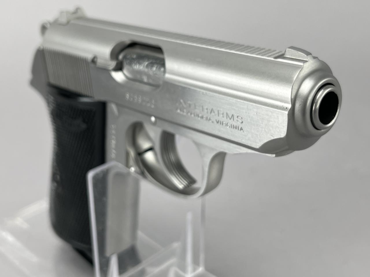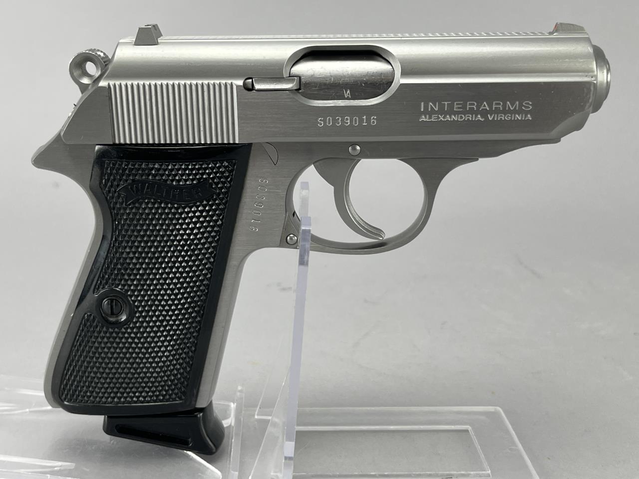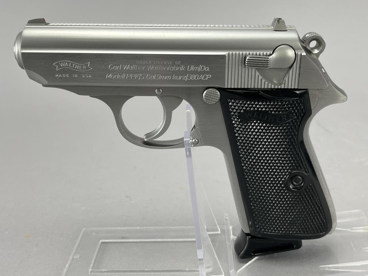 Walther PPK/S semi-automatic pistol, chambered in .380 ACP, serial number S039016. Manufactured under license from Carl Walther Waffenfabrik, Ulm, Germany, and marked ‘Made in USA’ by Interarms, Alexandria, Virginia. Features a 3.25-inch barrel, alloy stainless steel finish, black checkered polymer grips with ‘Walther’ logo, fixed low-profile sights, and a grooved slide top with rear serrations. The markings include ‘Modell PPK/S Cal. 9mm kurz/.380 ACP’ and serial stamped on the slide and frame. Includes one detachable magazine and a soft carry case marked ‘PA.’ This firearm requires a background check before transfer.