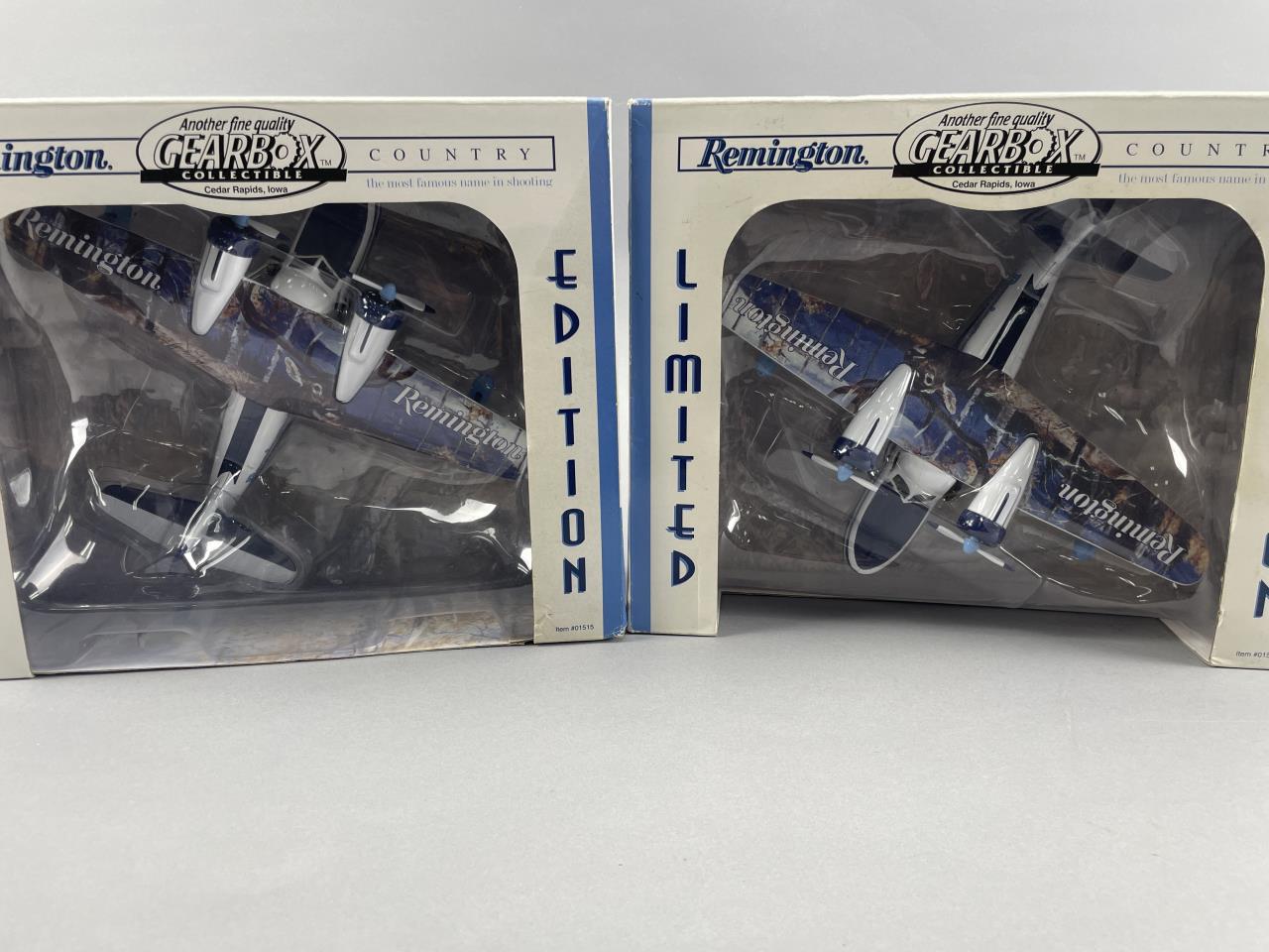 Pair of limited-edition Remington-branded airplane-shaped collectible piggy banks by Gearbox Collectibles. Both items are presented in their original packaging and feature detailed designs on the top of their wings, including the Remington logo. Each bank is modeled in the shape of a Grumman Goose airplane with classic blue and white color schemes and intricate trim work for an authentic aesthetic. Packaging indicates ‘Gearbox Country Collectibles, Cedar Rapids, Iowa,’ further highlighting the item’s special edition pedigree.
