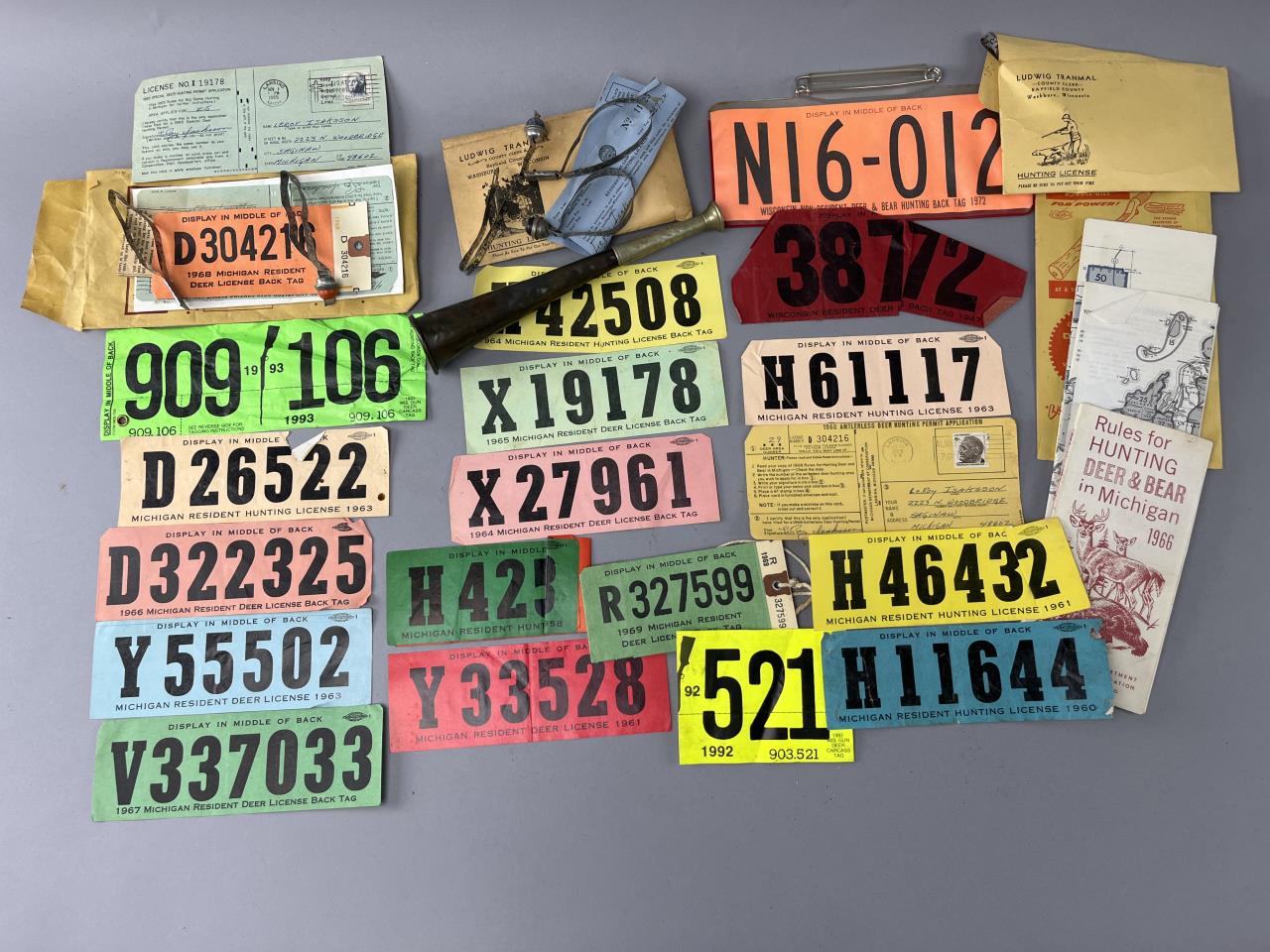 Henry Keat & Son hunting horn, crafted from brass with visible patina indicative of use and age. The horn features a tapered body and a flared bell, with maker’s marks stamped on the surface that read “HENRY KEAT & SON, 105 MATTHEWS PLACE”. Accompanying this piece is a collection of vintage hunting licenses and tags, primarily from Michigan, with dated examples ranging from 1960 to 1993. The licenses include both deer and bear permits, along with related hunting guidelines, providing a historical glimpse into mid-20th-century hunting regulation and documentation.