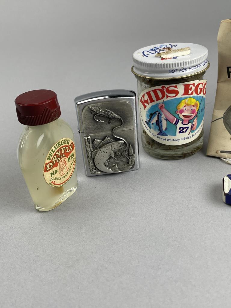 CONDITION: The Compac Fury spin-casting reel box shows wear, including scuffs, edge wear, and small tears. The instruction manual displays wrinkling and discoloration due to age. The Pflueger Dry Fly Oil bottle is intact, showing some residue in the liquid. The metal lighter has no visible dents but does exhibit light surface wear. The ‘Kid’s Eggs’ jar appears intact with label discoloration and possible contents deterioration. Both the J. Higgins and Pflueger sinker containers show wear and signs of use, with scuffed surfaces and light rusting. The clear tube and its contents, including a float and line, appear intact but show handling wear consistent with age. Overall, the items are in used condition, retaining displayable appeal despite wear.