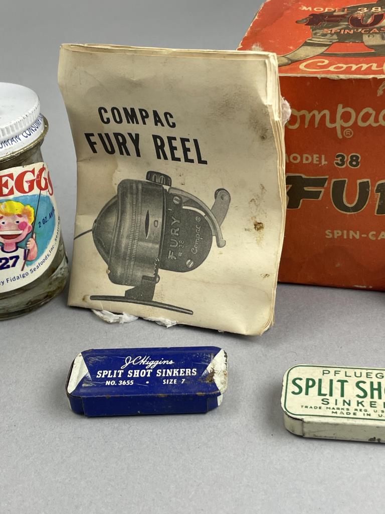 An assorted collection of vintage fishing accessories, including a Compac Model 38 Fury spin-casting reel with its original box, an instruction manual, and a spare part marked ‘Fury 38 Compac.’ The lot also includes a small bottle of Pflueger Dry Fly Oil No. 879, a unique embossed metal lighter featuring a fish motif, a jar of ‘Kid’s Eggs’ salmon fish bait marked 2 oz., J. Higgins Split Shot Sinkers No. 3655 in size 7 (in original packaging), a Pflueger Split Shot Sinkers tin, and a clear tube containing an additional float and line. This grouping highlights classic angling tools and accessories ideal for enthusiasts or collectors.