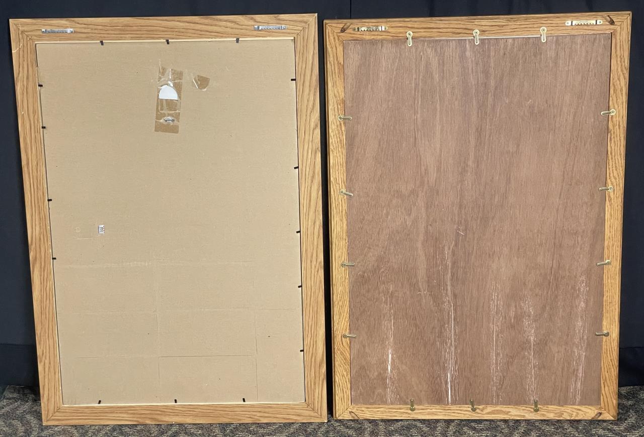 CONDITION: Both posters and frames are in good overall condition. The posters exhibit no visible tears or creases and retain their original color vibrancy. The wooden frames show minor handling wear but are structurally sound without visible damage. The backing on one frame shows an area with taped repairs. Ready for display.