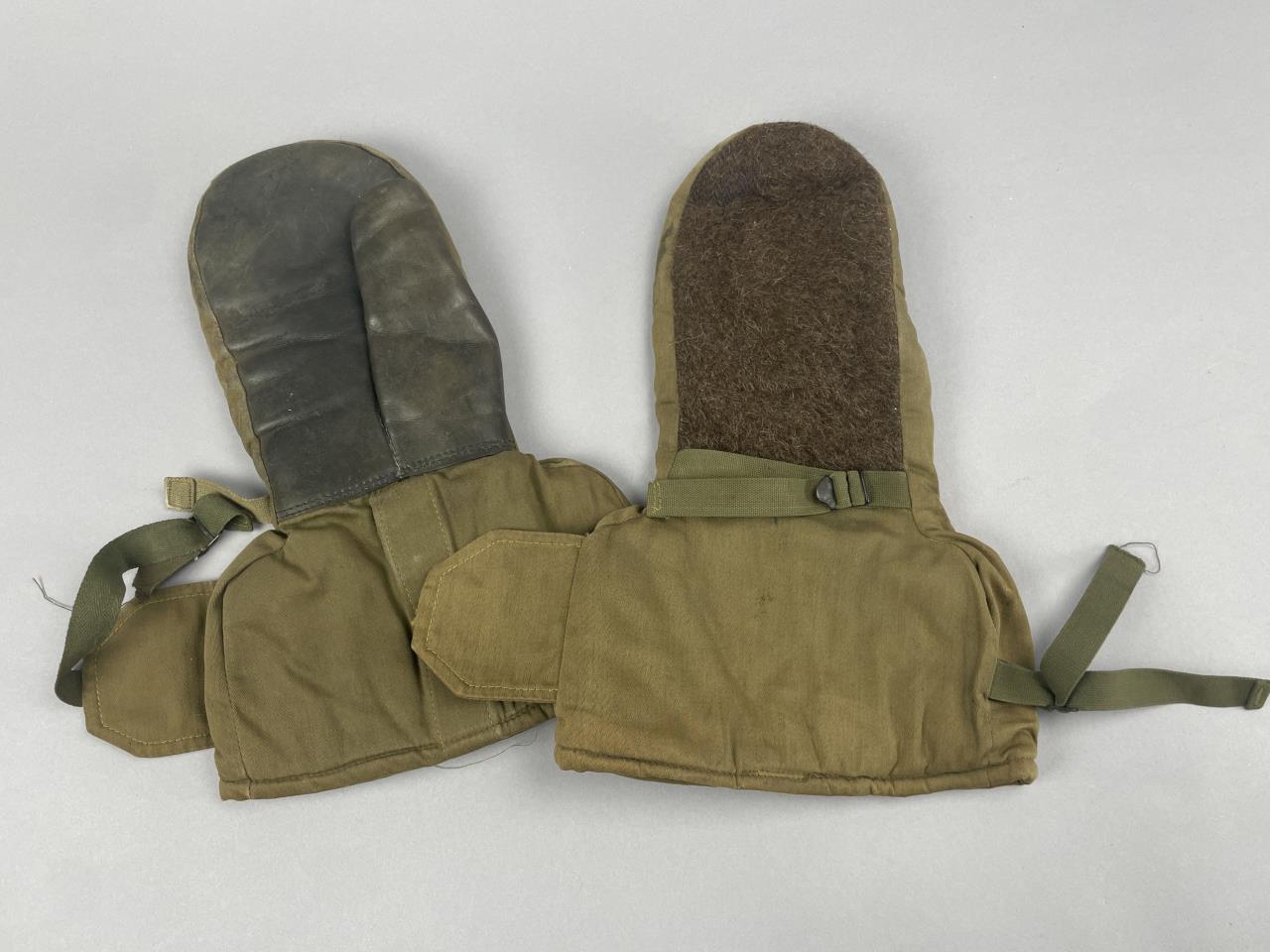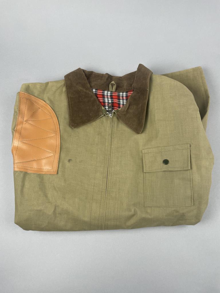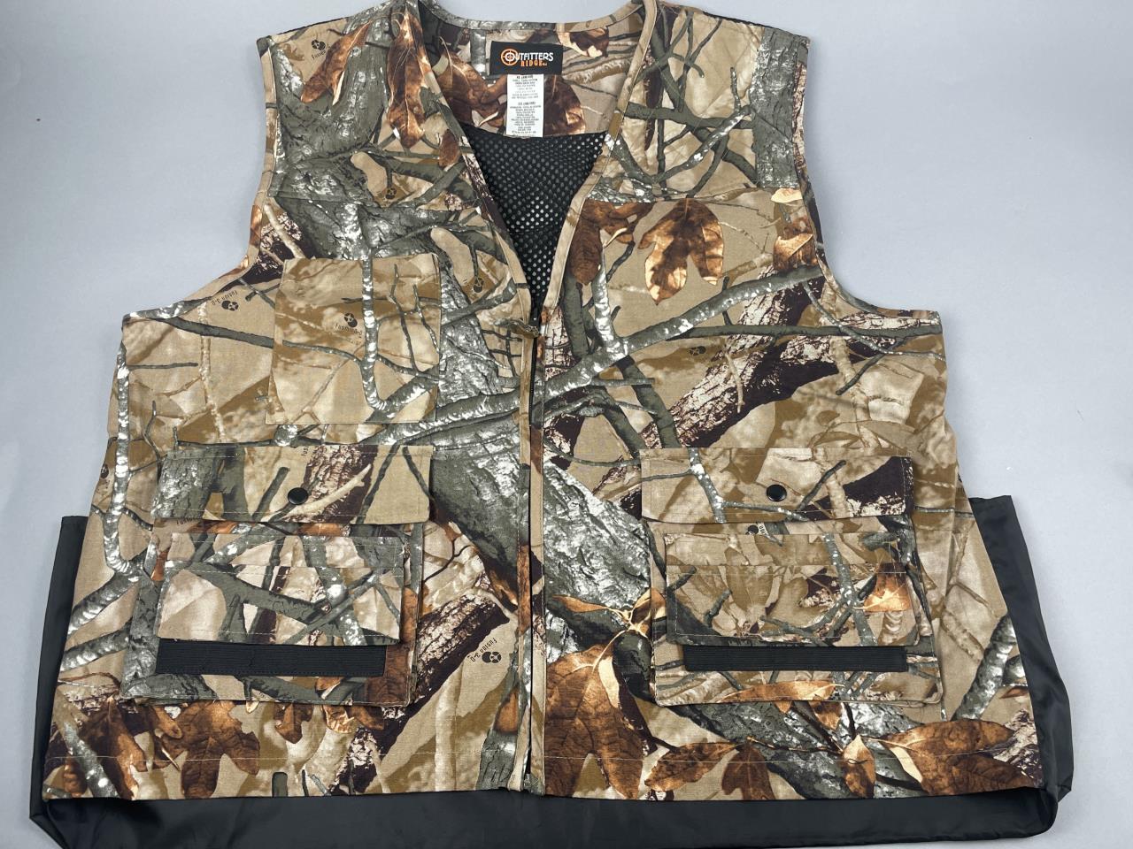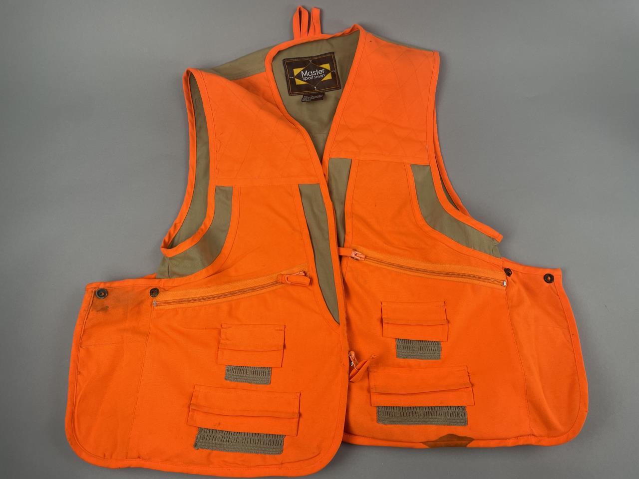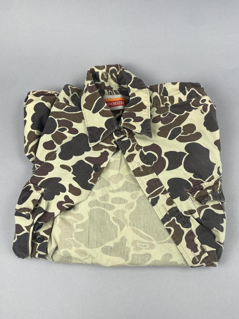 CONDITION: Overall, the items show light to moderate wear consistent with usage. The camouflage vest shows light signs of use with no visible tears or significant stains. The blaze orange vest presents moderate wear, including minor discoloration near the bottom edge. Both long-sleeve shirts are intact; the green camo shirt has no visible damage, and the heavy-duty olive shirt has slight staining on the lower front and overall signs of wear. The gloves display evident usage with scuffing on the leather portions, minor wear to the wool insulation, and slight soiling on the fabric portions. All items appear functional and free of major damage.