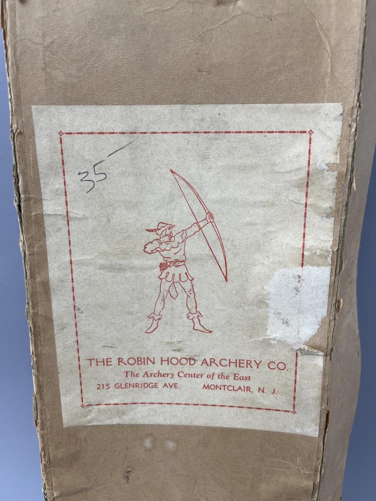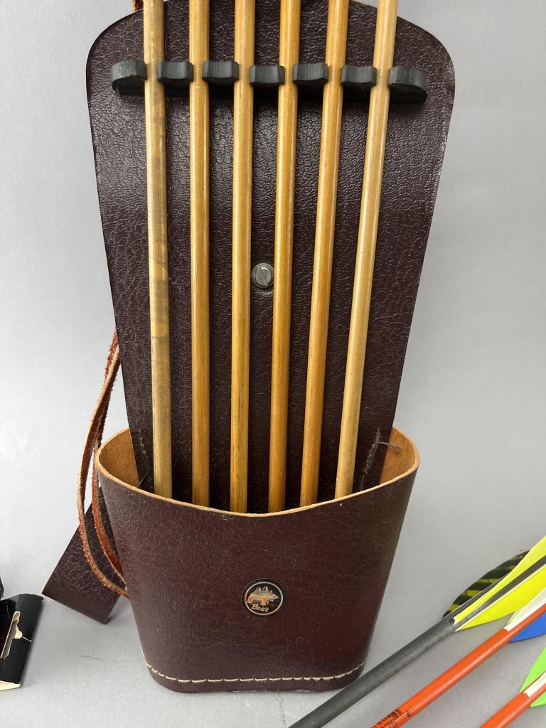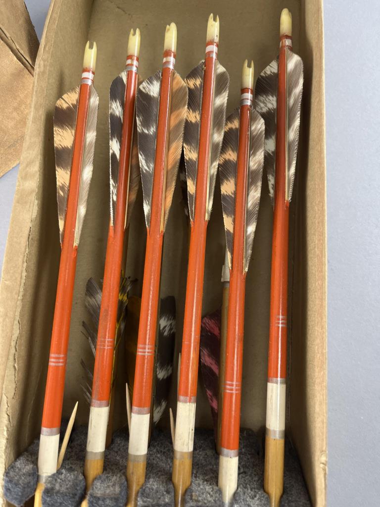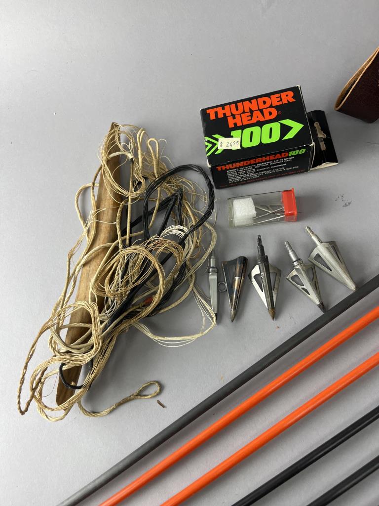 CONDITION: The arrows exhibit varying degrees of wear, with some showing minor scuffing to shafts and fletching. The quiver remains in good condition with light handling marks on the leather. The Thunderhead broadheads are clean and appear unused. The bowstrings are in an unstrung state but show no visible signs of damage or fraying. The Robin Hood Archery Co. box shows noticeable wear, including edge tearing and discoloration, consistent with age and storage. Overall, components are in a functional and collectible condition, suitable for use or display.