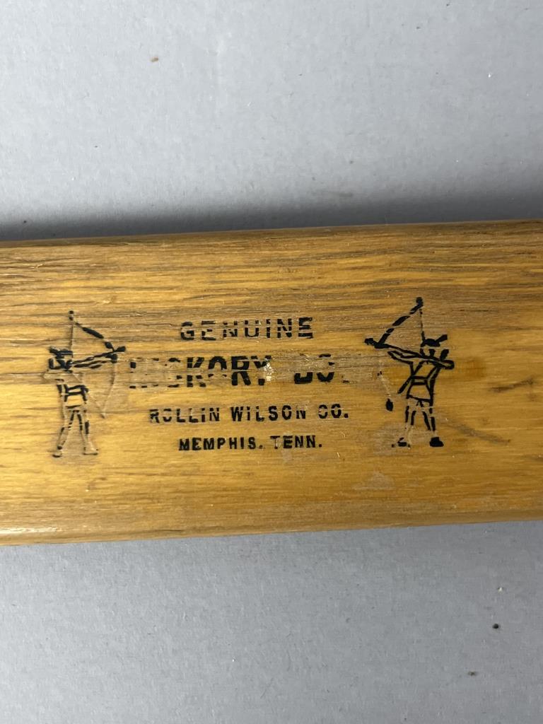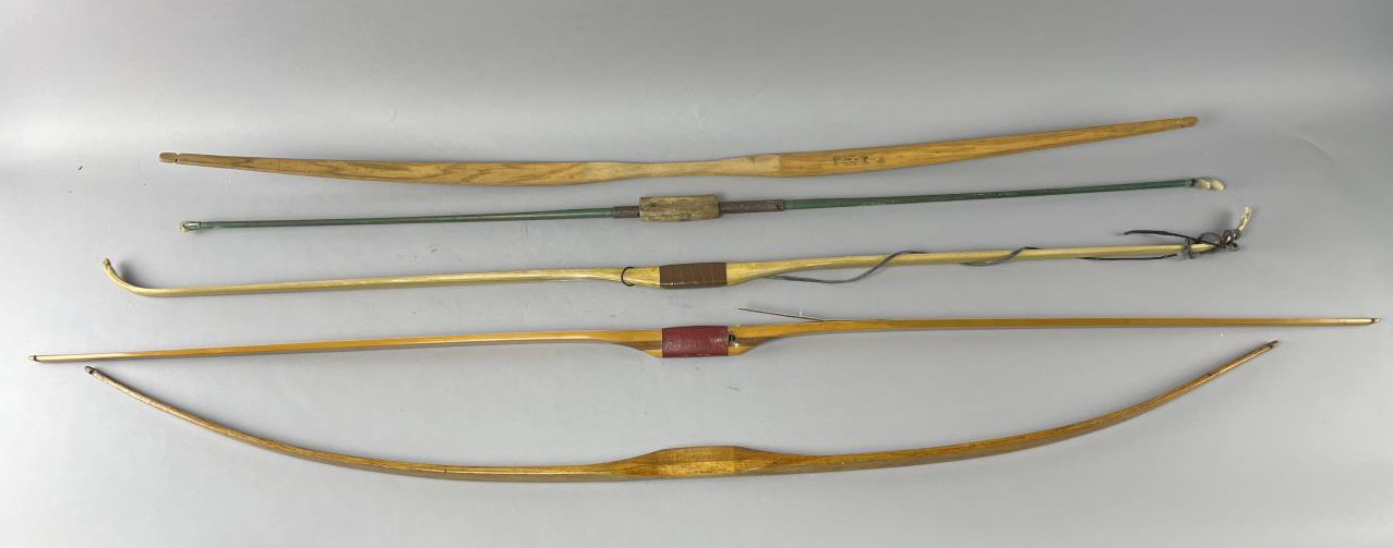 Group of five assorted bows, including a longbow marked ‘Genuine Hickory Bow, Rollin Wilson Co., Memphis, Tenn.’ with a length of 65 inches. The other bows vary in style and materials, with some featuring fiberglass construction and leather-wrapped grips. One bow includes a distinctive green painted finish. Each bow demonstrates traditional craftsmanship and is suitable for display or collection.