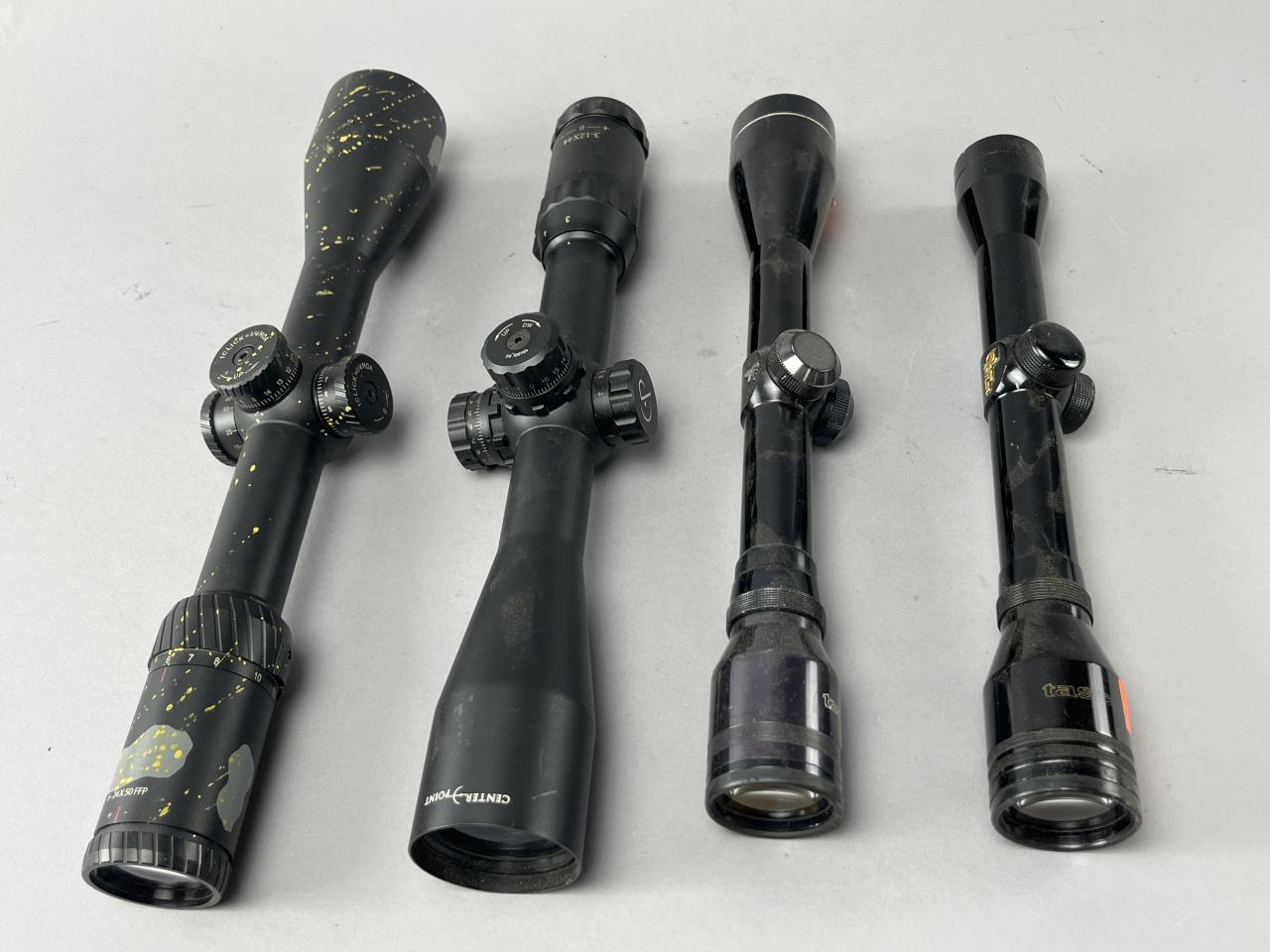 Lot of four long-range rifle scopes, including one Cabela’s 6-24×50 FFP model with a black matte finish and yellow speckled pattern, one CenterPoint scope with a black matte finish, and two Tasco scopes with gloss black finishes. Each scope features adjustable turrets and variable magnification (if applicable). Logos and markings for each brand are visible on the scopes’ barrels or bells, confirming their respective manufacturers. A versatile collection suitable for a variety of firearm applications.