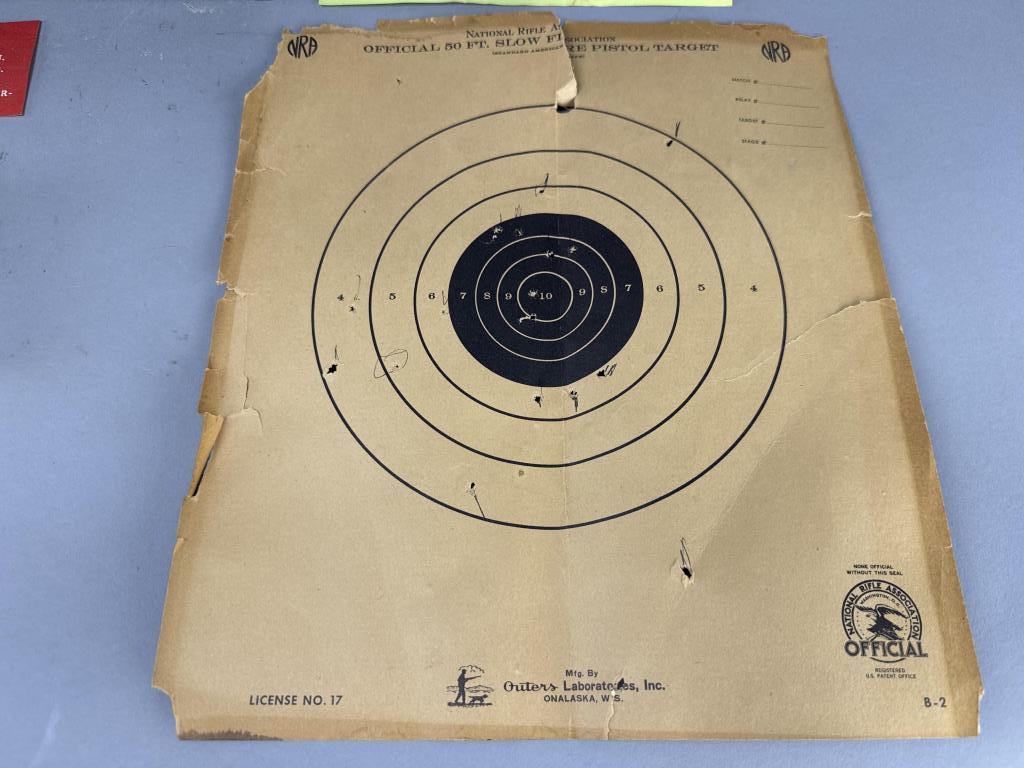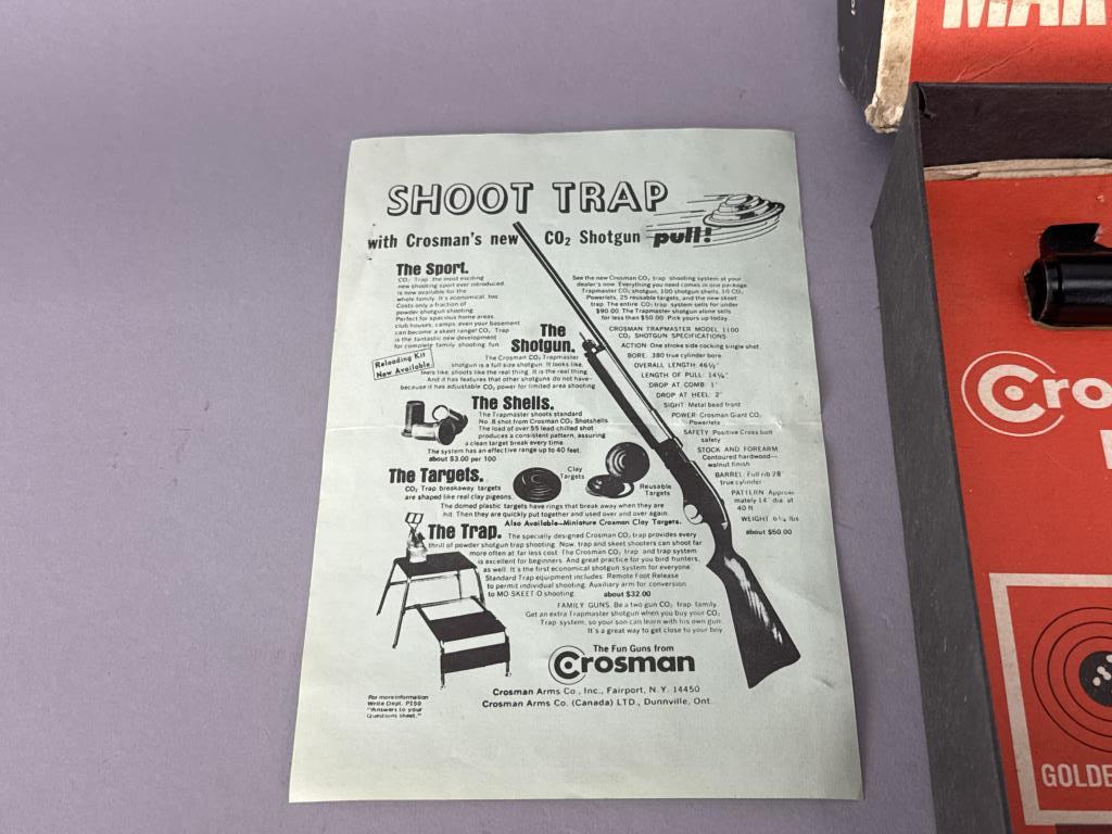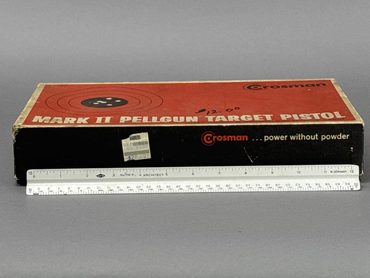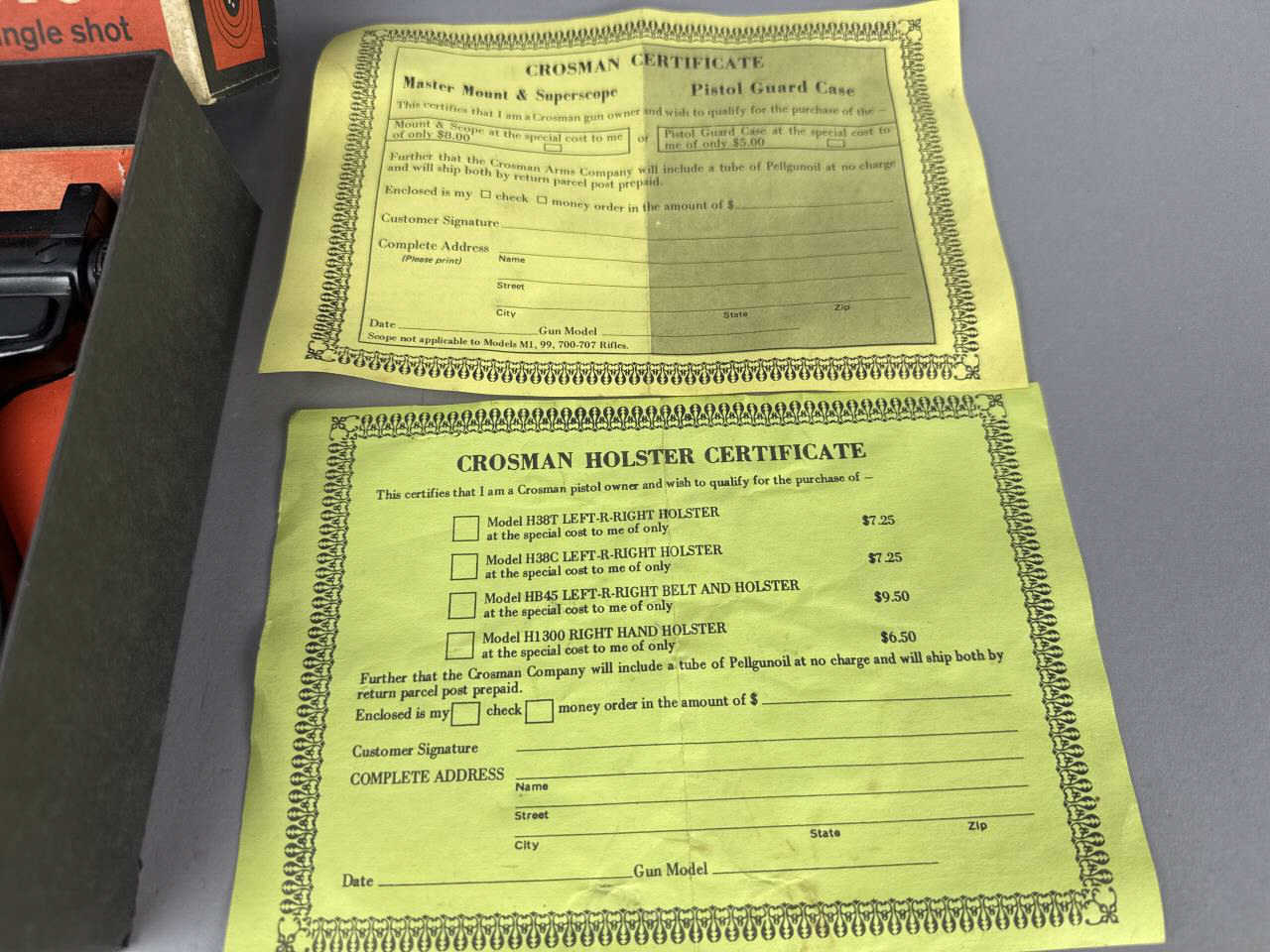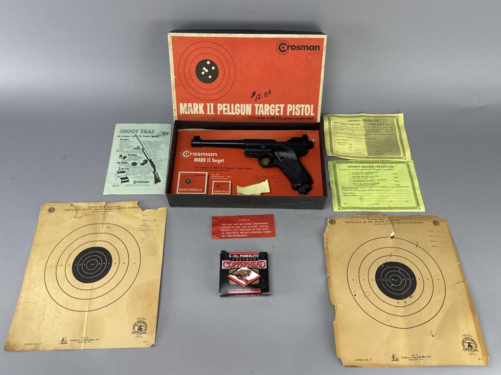 CONDITION: This Crosman Mark II Pellgun Target Pistol shows moderate wear on the finish, consistent with normal use. Scattered handling marks are visible on the exterior, particularly around the grips and the barrel. Mechanically, the trigger action and CO2 chamber appear intact, though functionality has not been tested. The included original box displays wear along edges, creases, and split corners. Vintage target sheets exhibit noticeable signs of use and aging, including creases, tears, and previous markings. The accompanying documentation is aged but legible. Overall, the condition is representative of a well-preserved collectible with visible use.