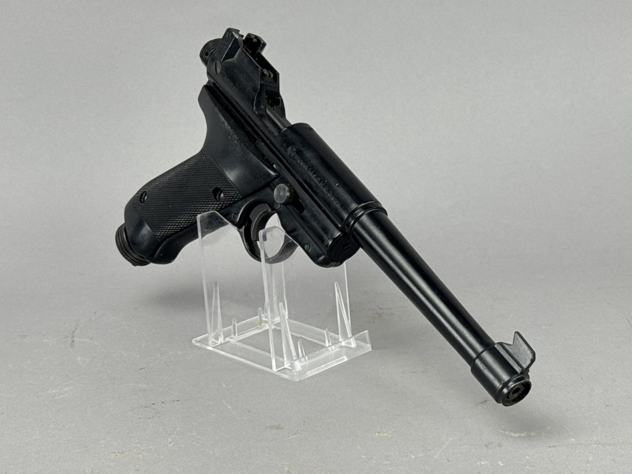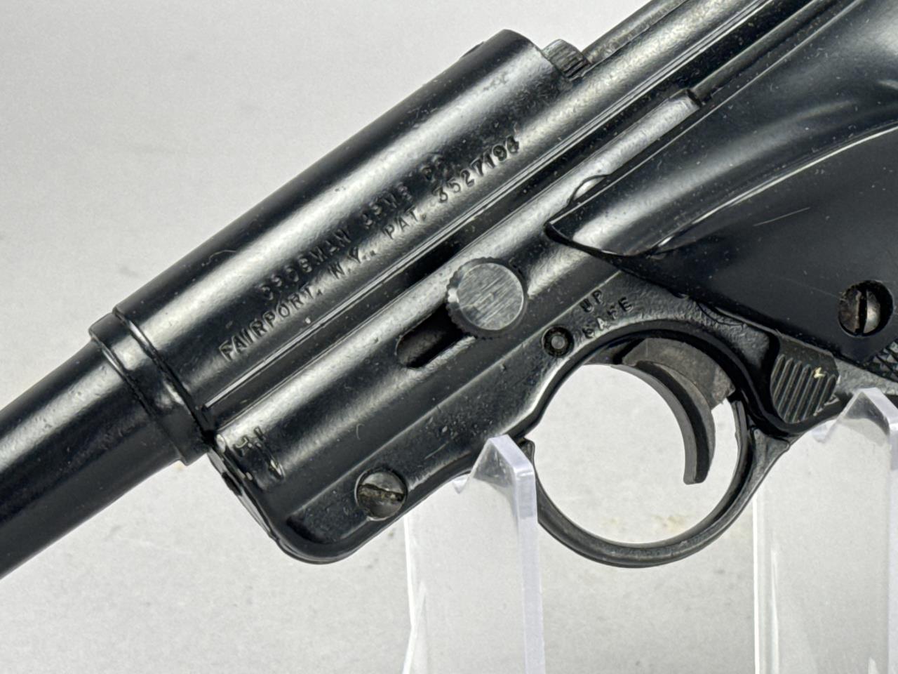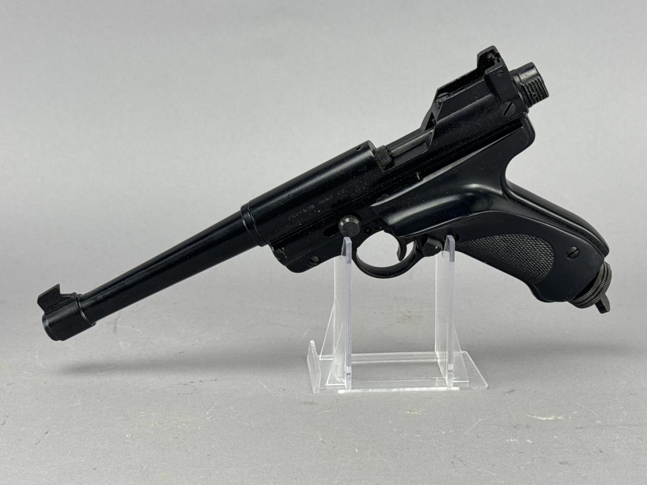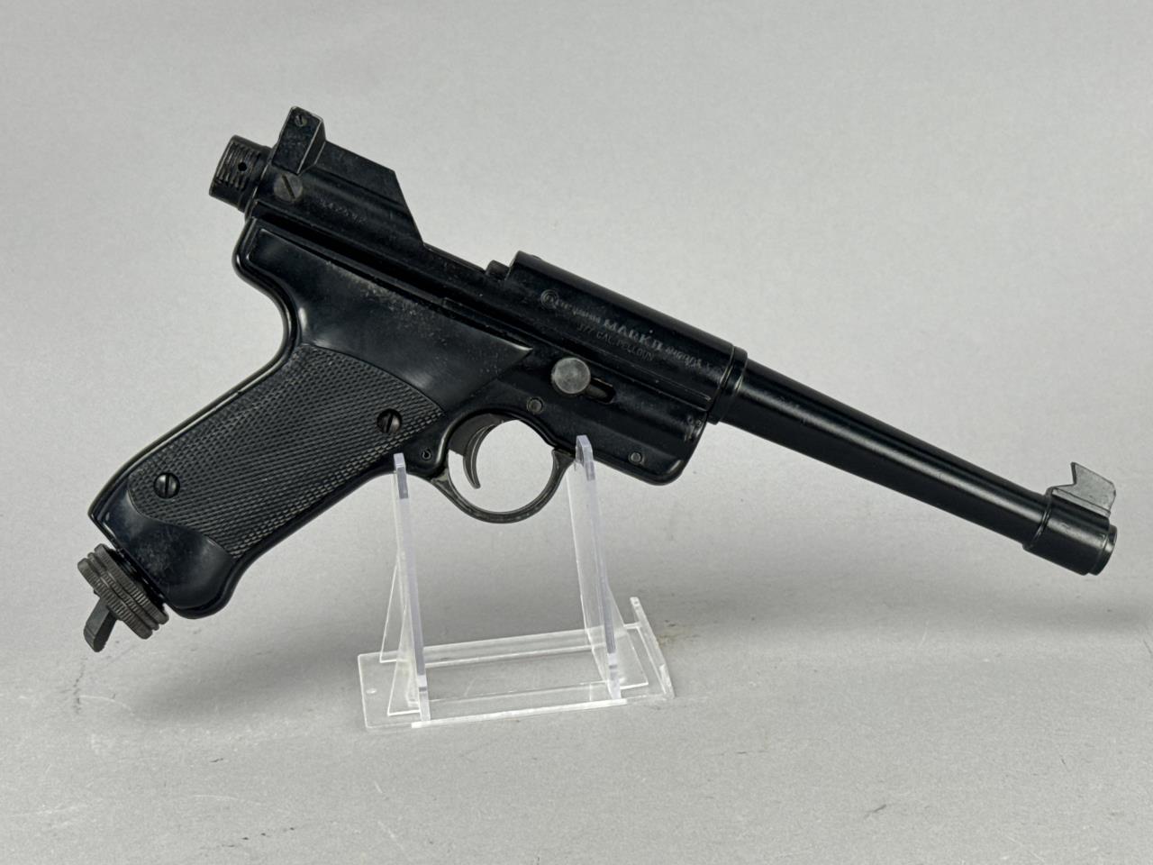 CONDITION: This Crosman Mark II Pellgun Target Pistol shows moderate wear on the finish, consistent with normal use. Scattered handling marks are visible on the exterior, particularly around the grips and the barrel. Mechanically, the trigger action and CO2 chamber appear intact, though functionality has not been tested. The included original box displays wear along edges, creases, and split corners. Vintage target sheets exhibit noticeable signs of use and aging, including creases, tears, and previous markings. The accompanying documentation is aged but legible. Overall, the condition is representative of a well-preserved collectible with visible use.