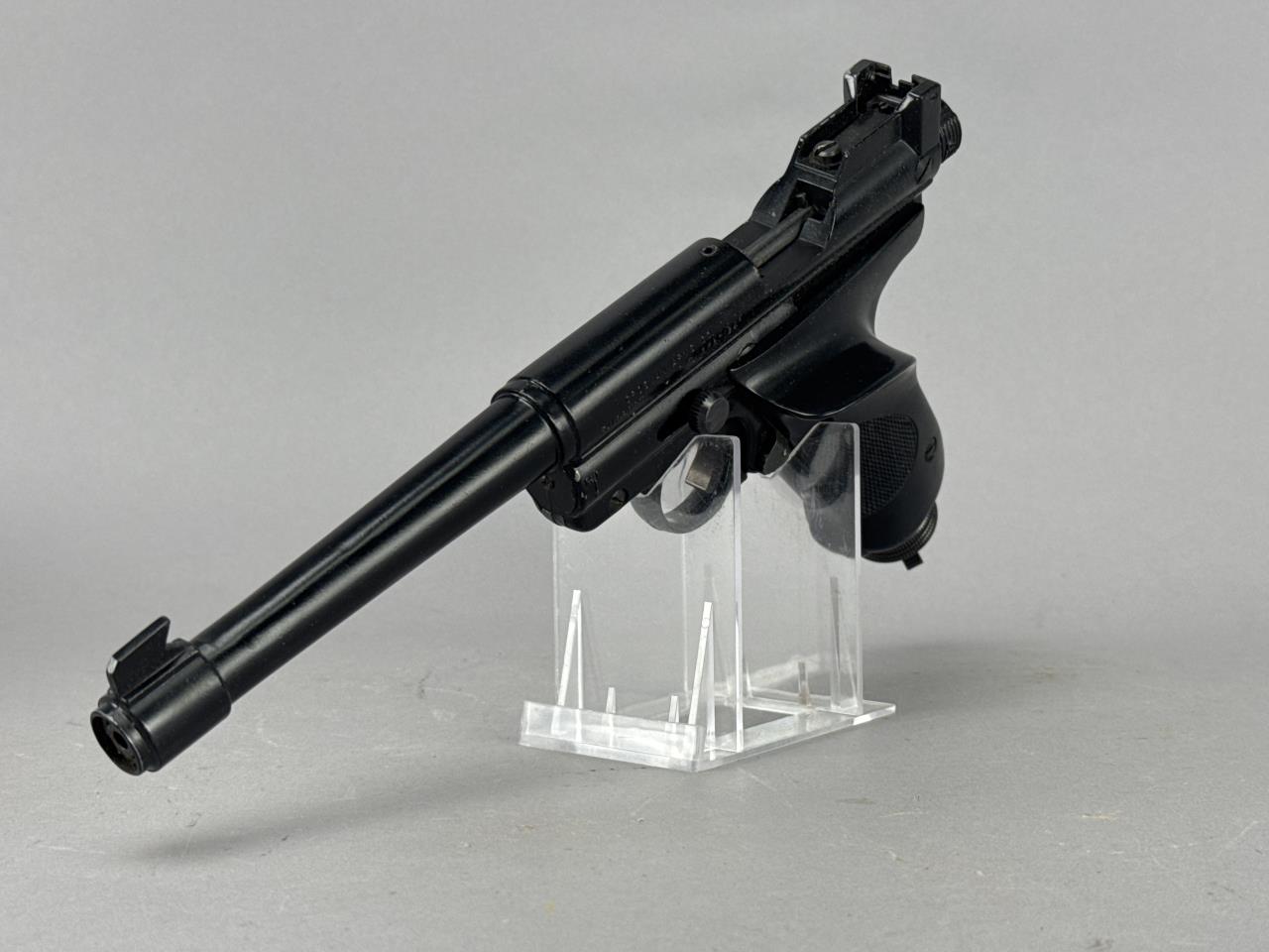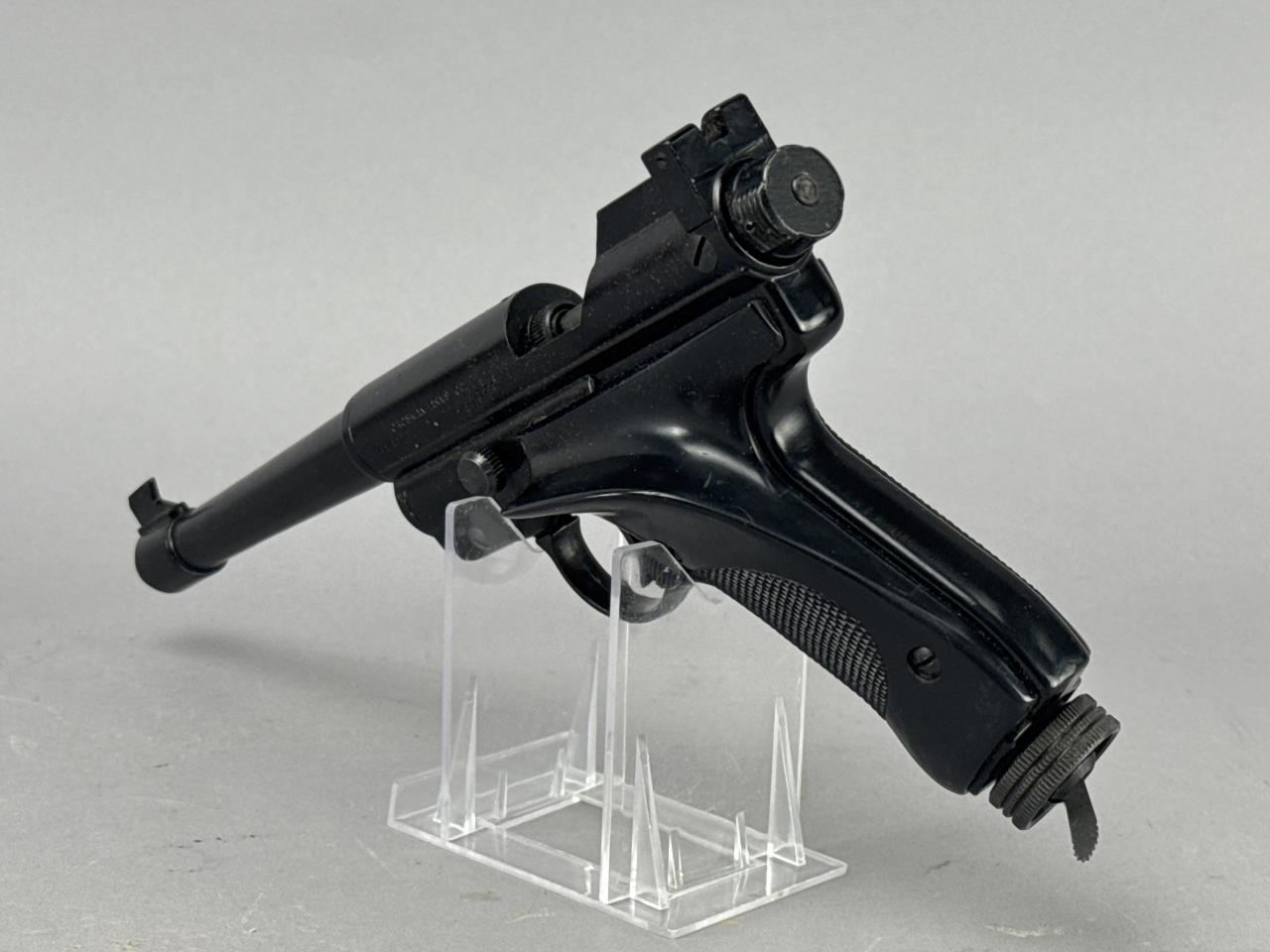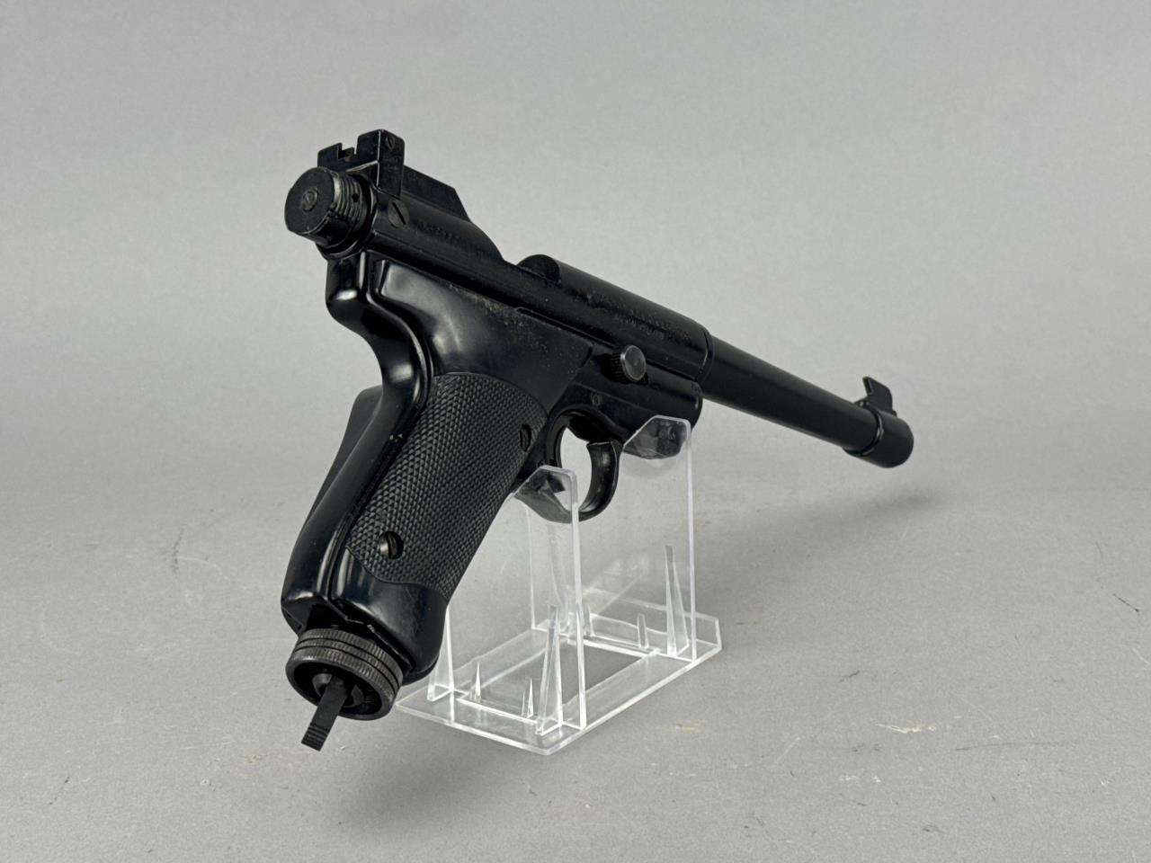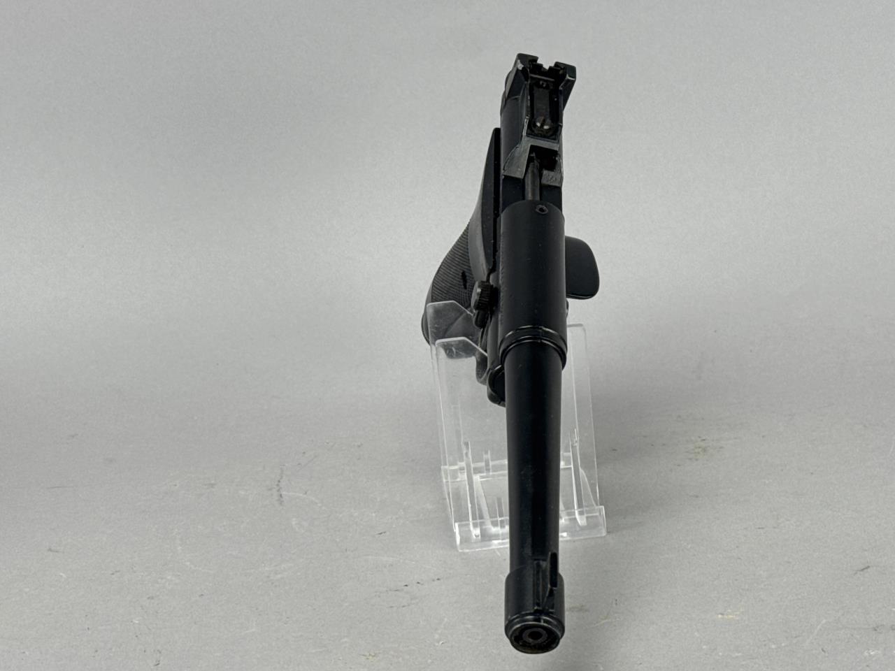 CONDITION: This Crosman Mark II Pellgun Target Pistol shows moderate wear on the finish, consistent with normal use. Scattered handling marks are visible on the exterior, particularly around the grips and the barrel. Mechanically, the trigger action and CO2 chamber appear intact, though functionality has not been tested. The included original box displays wear along edges, creases, and split corners. Vintage target sheets exhibit noticeable signs of use and aging, including creases, tears, and previous markings. The accompanying documentation is aged but legible. Overall, the condition is representative of a well-preserved collectible with visible use.