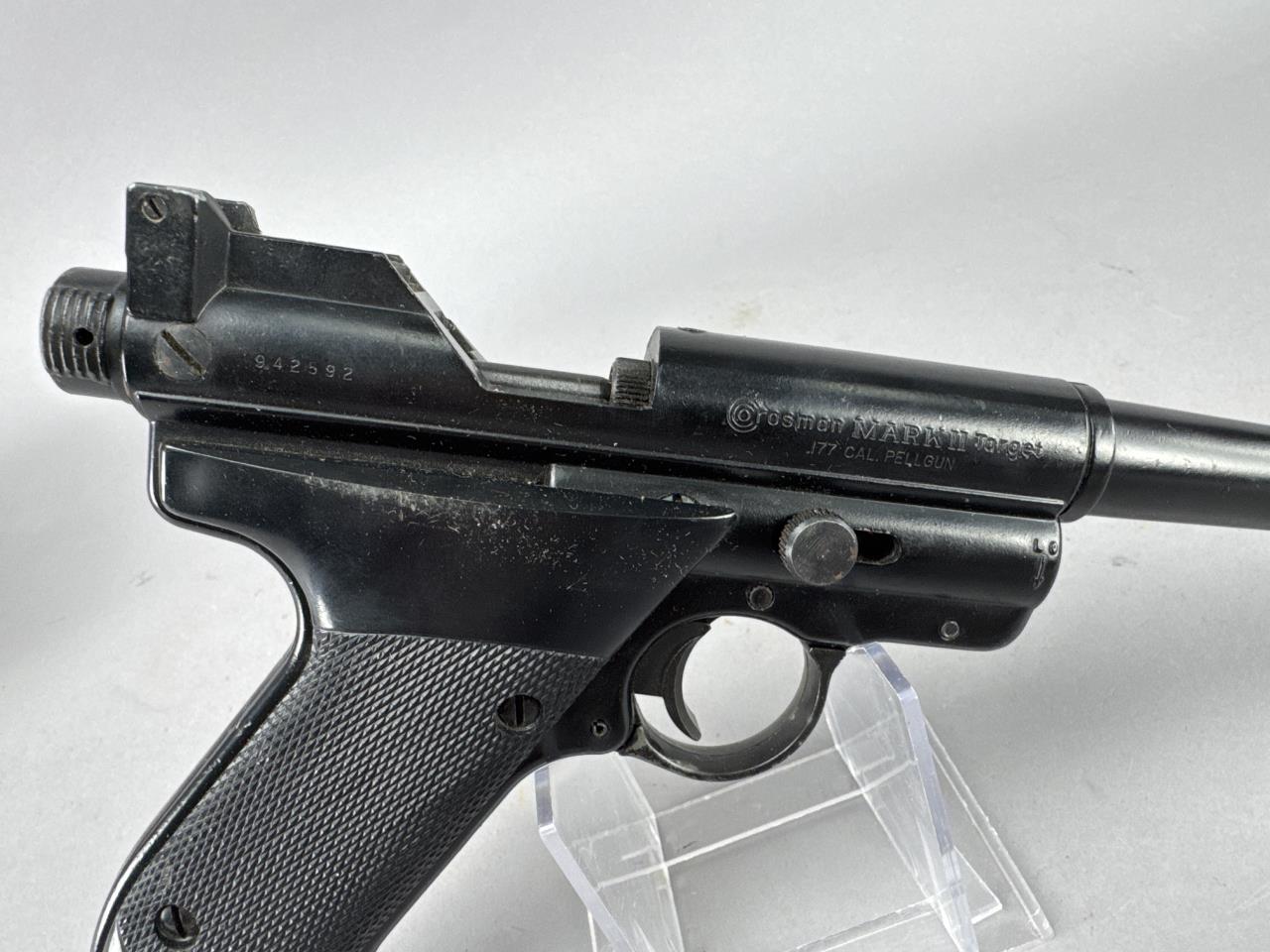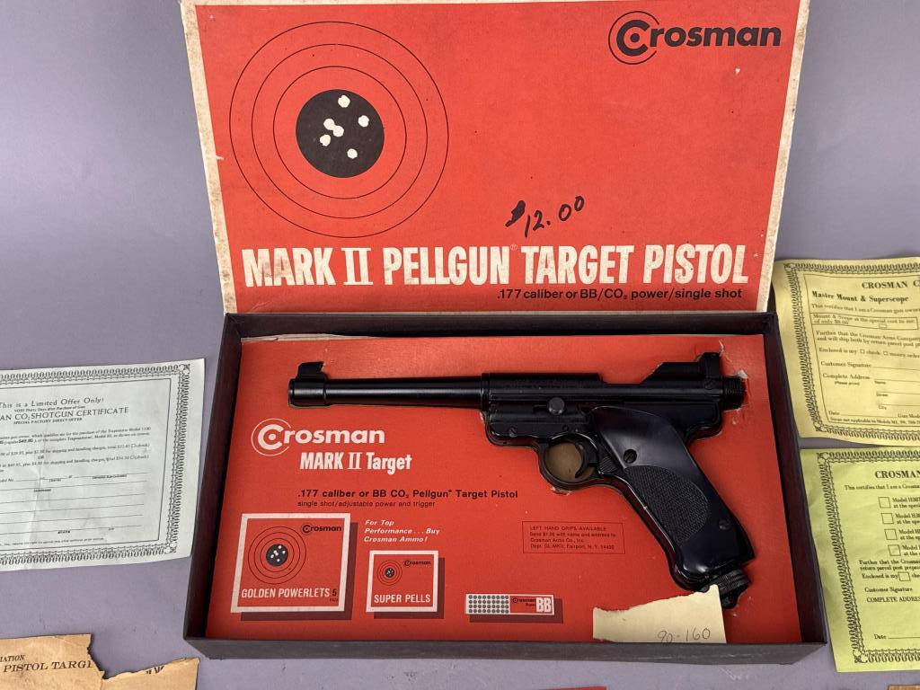 Crosman Mark II Pellgun Target Pistol, chambered in .177 caliber for BB or CO2 power single-shot operation. Serial number 942592. Features an adjustable single-action trigger and fixed front sight paired with rear elevation adjustment. Constructed with a black finish and textured grips for a secure hold. Includes original box and accompanying documentation, along with Crosman branded accessories such as Copperhead CO2 cartridges and vintage target sheets. Manufactured by Crosman Arms Co., Fairport, NY.