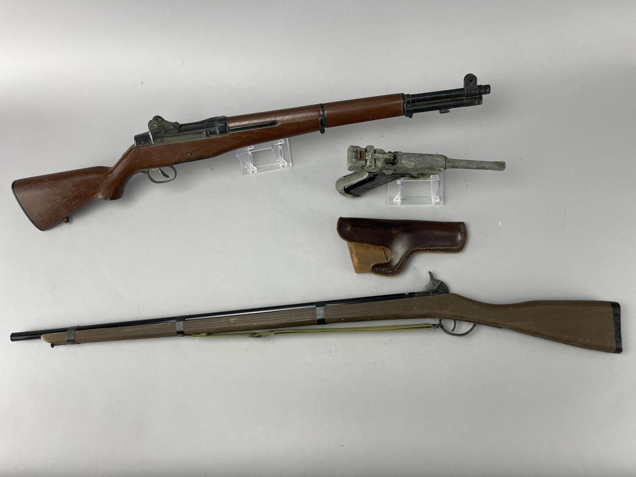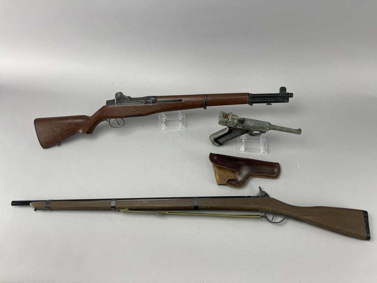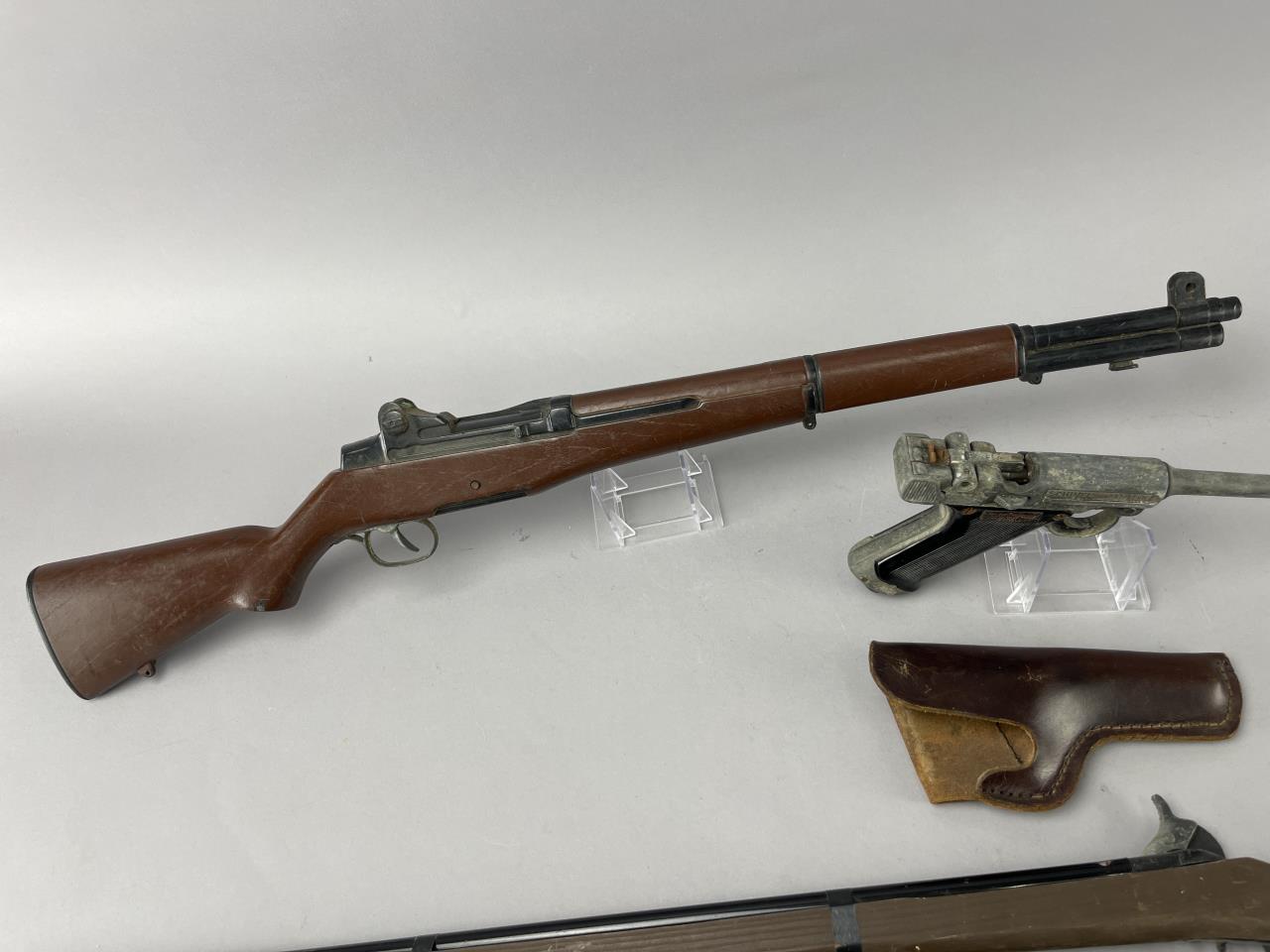 CONDITION: The Schimel air pistol shows moderate oxidation and handling wear. Partial original finish remains, with scratches and visible surface corrosion. The Marx toy gun exhibits scuffs and abrasions typical of use, with the plastic material intact and no significant structural issues. The wooden toy rifle shows significant wear to the painted finish, with minor dings and scratches on the wood stock. No major cracks or repairs are evident on any item. The included leather holster has moderate wear and superficial cracking from age.
