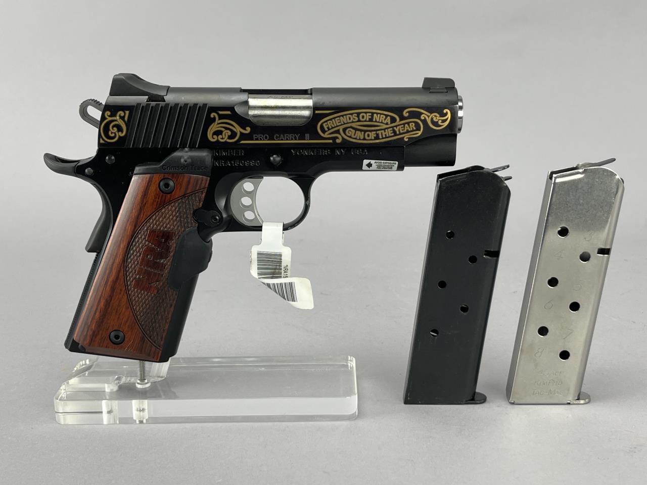 Kimber Pro Carry II semi-automatic pistol chambered in .45 ACP. This limited-edition model was the Friends of the NRA Gun of the Year in 2015. Featuring a blued finish with gold decorative scrollwork and ‘Friends of the NRA Gun of the Year’ embellishment, this pistol has a 4-inch barrel and a walnut grip panel with ‘NRA’ carved accents. Includes two magazines, one blued and one stainless steel, and a factory box with associated documentation. Serial number NRA150990. Background check required.