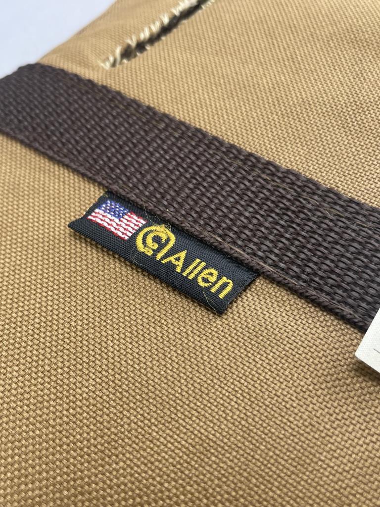 Two rifle cases, one by Allen, made of cloth and leather construction. The tan case is marked with the Allen brand tag and includes brown webbing handles. The second case is olive-green with brown leather reinforcement at the muzzle end and green webbing handles. Both cases feature zippers for secure closure.