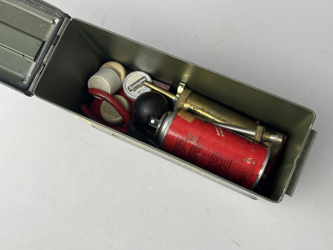 CONDITION: The ammunition box shows moderate surface wear consistent with its age and prior use, including scattered scratches, areas of paint loss, and visible remnants of old adhesive labels. The handwritten markings are legible but exhibit some fading. The contents of the cleaning kit, including the lubricant can and other tools, are visibly used but intact. Cleaning patches appear discolored from prior use. The hinged lid opens and closes securely, with no functional issues noted.