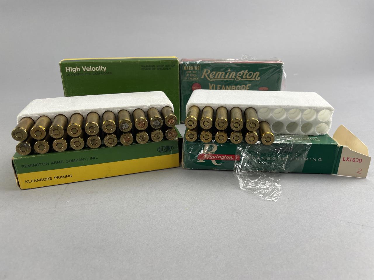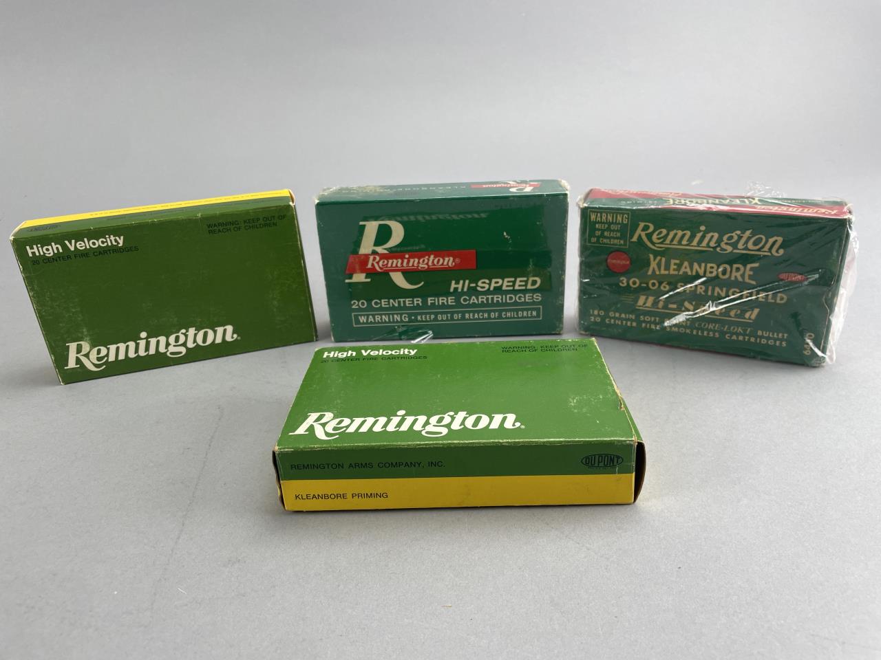 Four boxes of Remington .30-06 Springfield rifle ammunition, including two full boxes of Remington High Velocity 180-grain soft point centerfire cartridges, one partial box of Remington Hi-Speed .30-06 cartridges, and one empty Remington Hi-Speed box. The full boxes are sealed, while the partial box contains 11 cartridges with no visible defects.