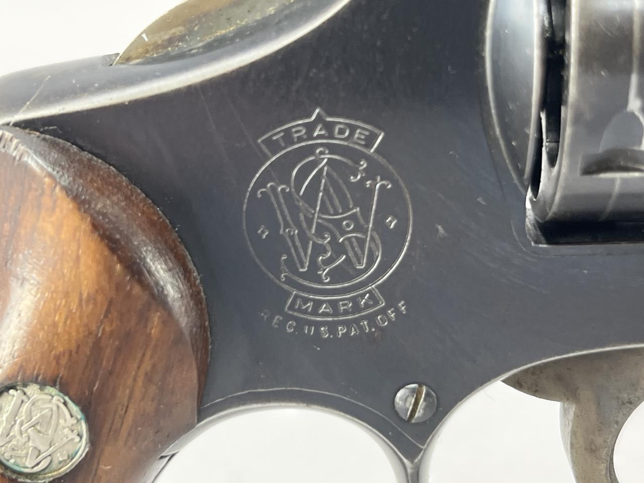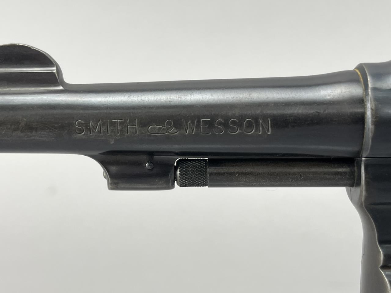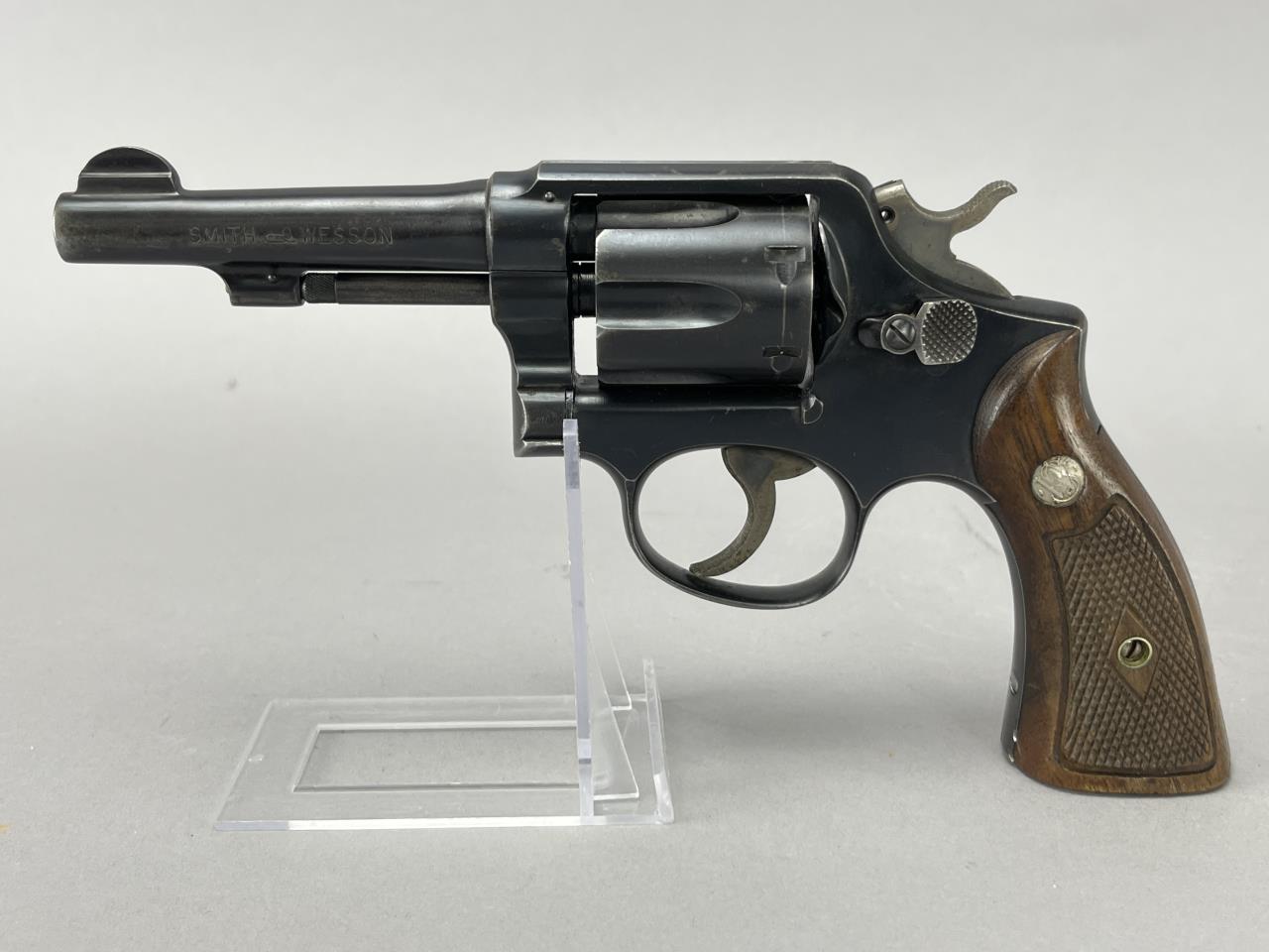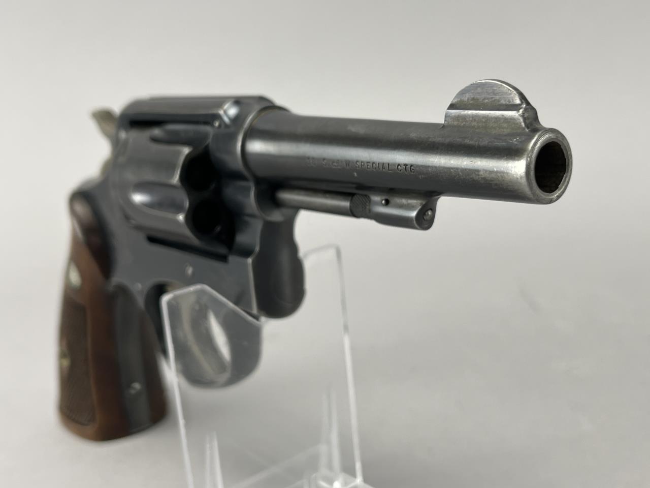 CONDITION: The revolver exhibits moderate handling and holster wear, with thinning of the blued finish on high points of the barrel, cylinder, and frame. The grips show light wear consistent with use but are free from cracks or chips. Some light scratching is present on the cylinder face. The barrel and cylinder bores appear clean, with visible rifling. The action cycles smoothly, and the lockup is sound. The overall wear is typical for a firearm of this vintage but suggests it has been well-maintained.