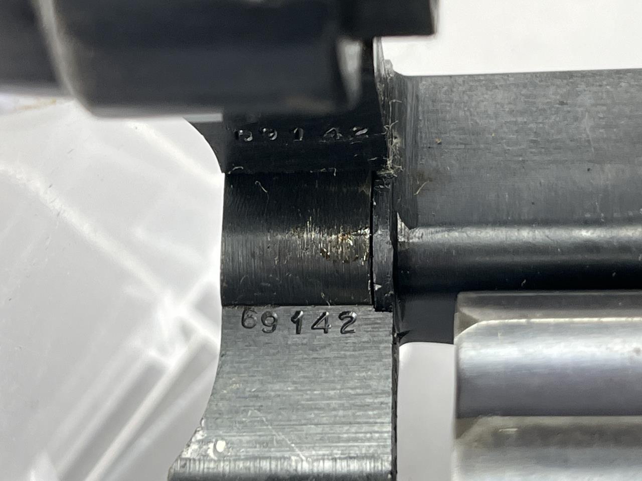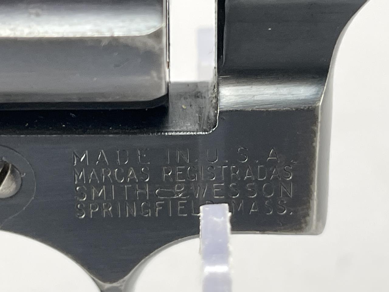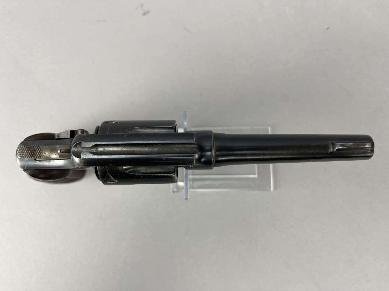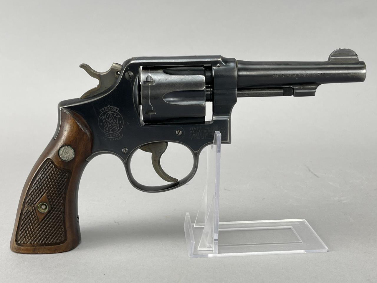 CONDITION: The revolver exhibits moderate handling and holster wear, with thinning of the blued finish on high points of the barrel, cylinder, and frame. The grips show light wear consistent with use but are free from cracks or chips. Some light scratching is present on the cylinder face. The barrel and cylinder bores appear clean, with visible rifling. The action cycles smoothly, and the lockup is sound. The overall wear is typical for a firearm of this vintage but suggests it has been well-maintained.