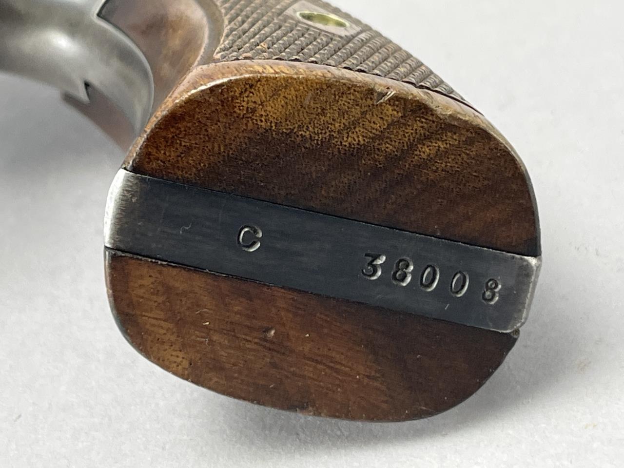 Smith & Wesson M&P .38 Special revolver, serial number C38008, manufactured circa 1948-1951. This double-action revolver features a 4-inch barrel, blued finish, and a six-shot cylinder. The left side of the barrel is marked “38 S.&W. SPECIAL CTG,” while the right side is marked “SMITH & WESSON.” The frame bears the Smith & Wesson trademark logo and is marked “MADE IN U.S.A., MARCAS REGISTRADAS, SMITH & WESSON, SPRINGFIELD, MASS.” The wooden grips display checkering and are enhanced with silver Smith & Wesson medallions. Standard front blade sight and fixed rear notch sight.