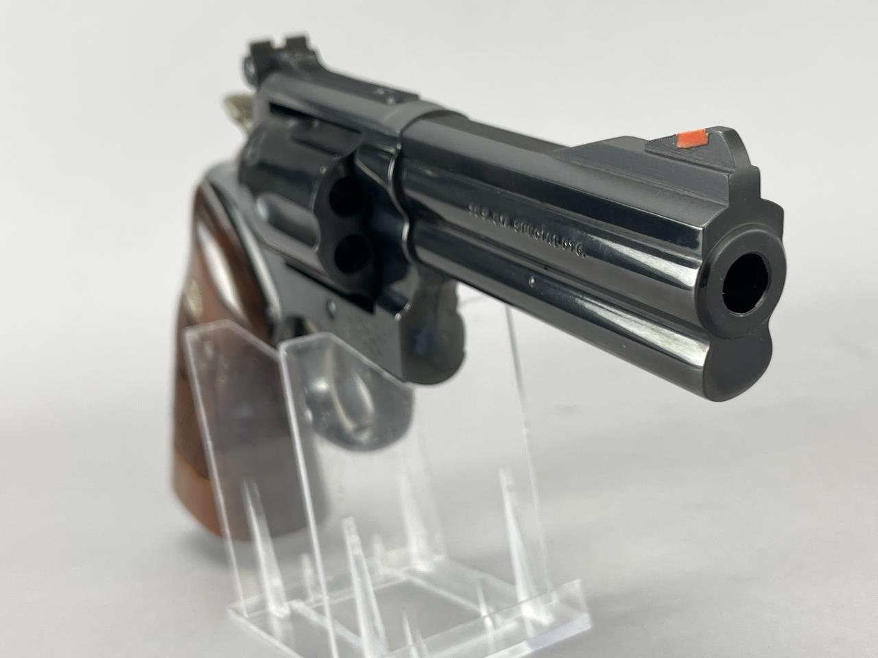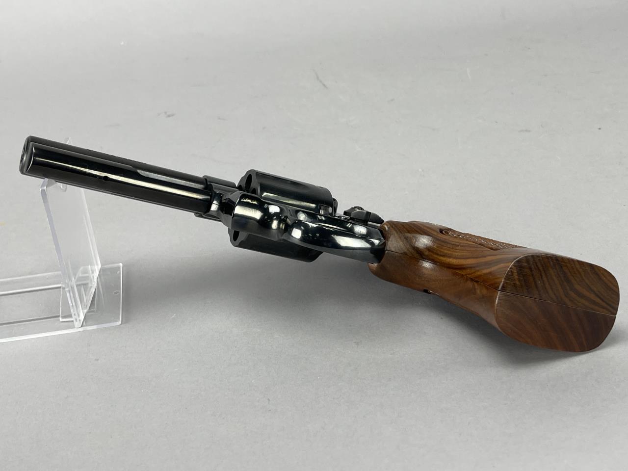 CONDITION: This revolver shows minimal signs of handling and appears to be in near-pristine condition. The blued finish is uniform and retains its factory luster. The walnut grips are free of notable wear, with sharp checkering and a smooth finish. The bore exhibits crisp rifling with no visible defects, indicating minimal or no use. The action cycles smoothly, and the lockup is tight and secure. The factory box shows minor wear from storage, primarily along the corners, but remains structurally sound. Overall, an exceptionally well-preserved example.