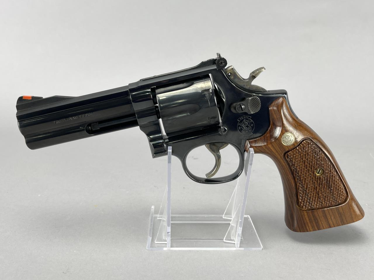 Smith & Wesson Model 586-5 L-frame revolver chambered in .38 Special. This revolver is a scarce Brazilian contract variant produced circa 1993, with a limited release to the U.S. commercial market. It features a blued finish, a 4.25-inch barrel with a red ramp front sight and an adjustable rear sight, and a six-round cylinder. The revolver is equipped with factory smooth walnut target grips adorned with gold-tone Smith & Wesson medallions. The serial number, BPY7979, is marked on the frame. The original factory box, warranty papers, and associated packaging are included.