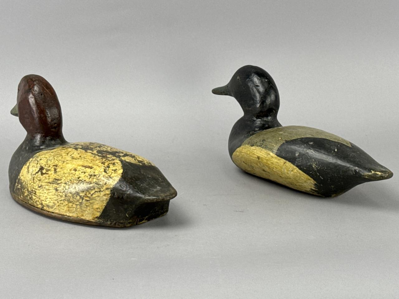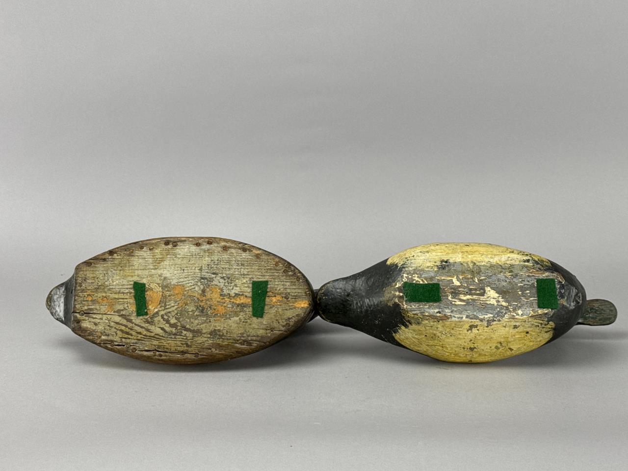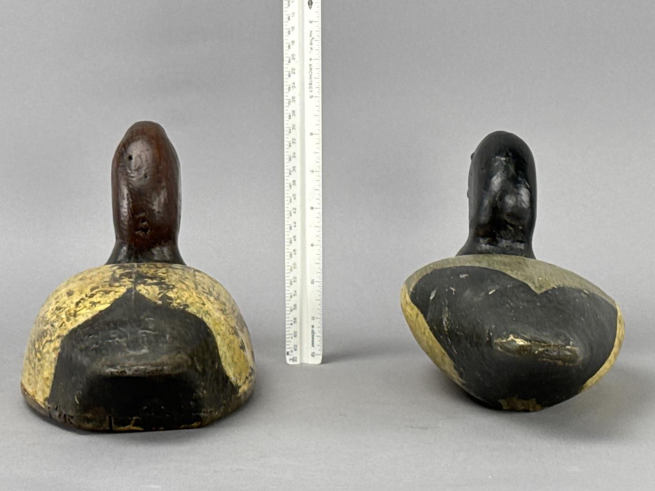 CONDITION: The decoys display visible wear consistent with age and use, including chipping, surface cracking, and paint loss primarily on the body and bottom edges. Minor scuffing and dents are present on the heads and bills. No visible structural damage or breaks were detected, and the felt pads remain intact on the bases. Overall, these decoys are in good structural condition, retaining their charm and hand-crafted authenticity.