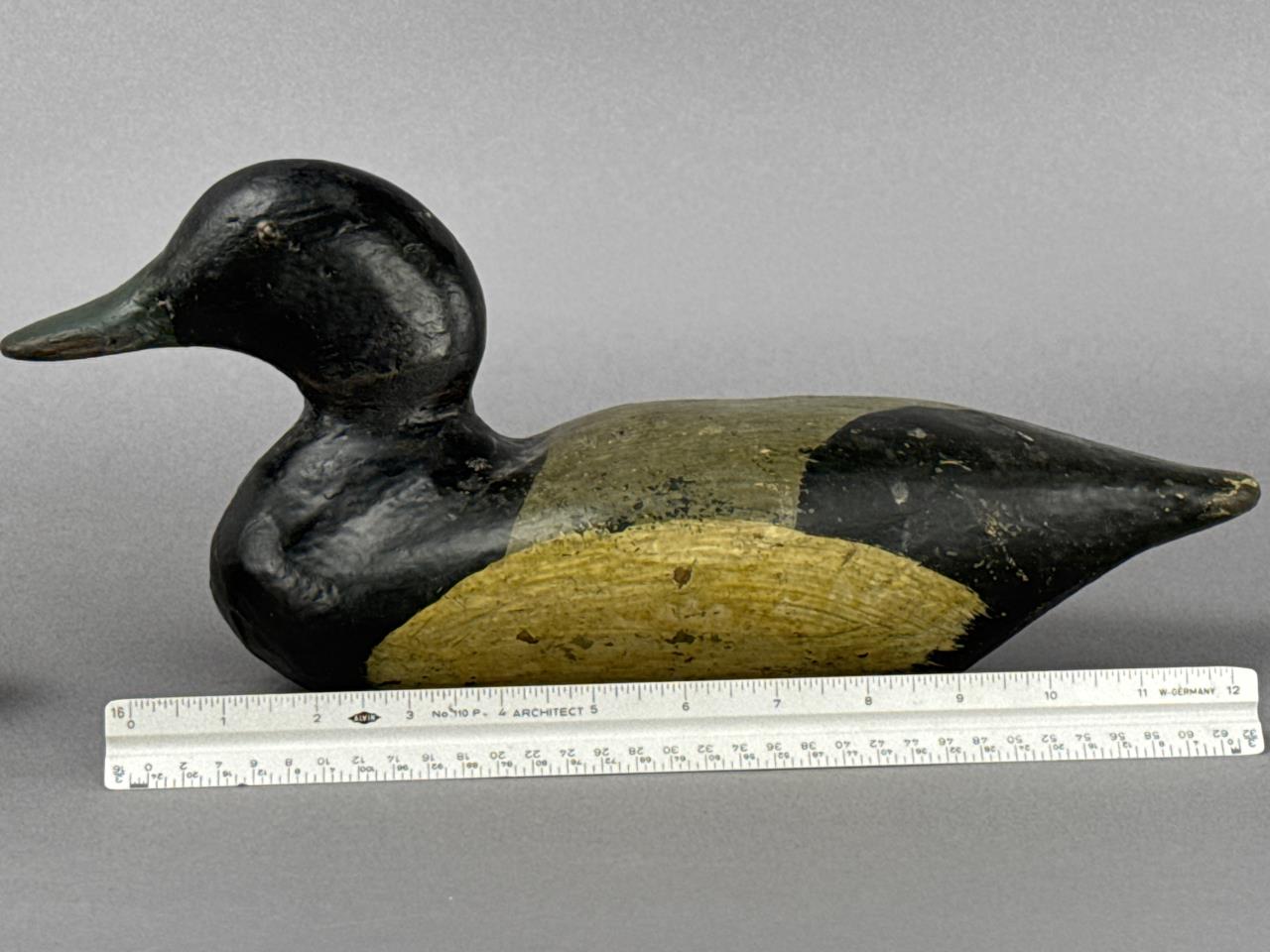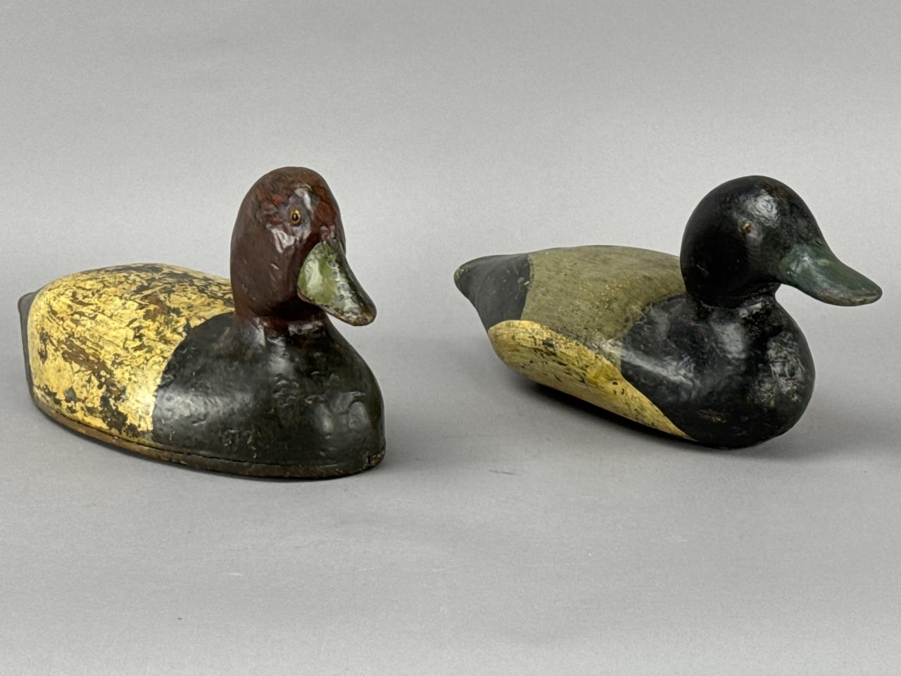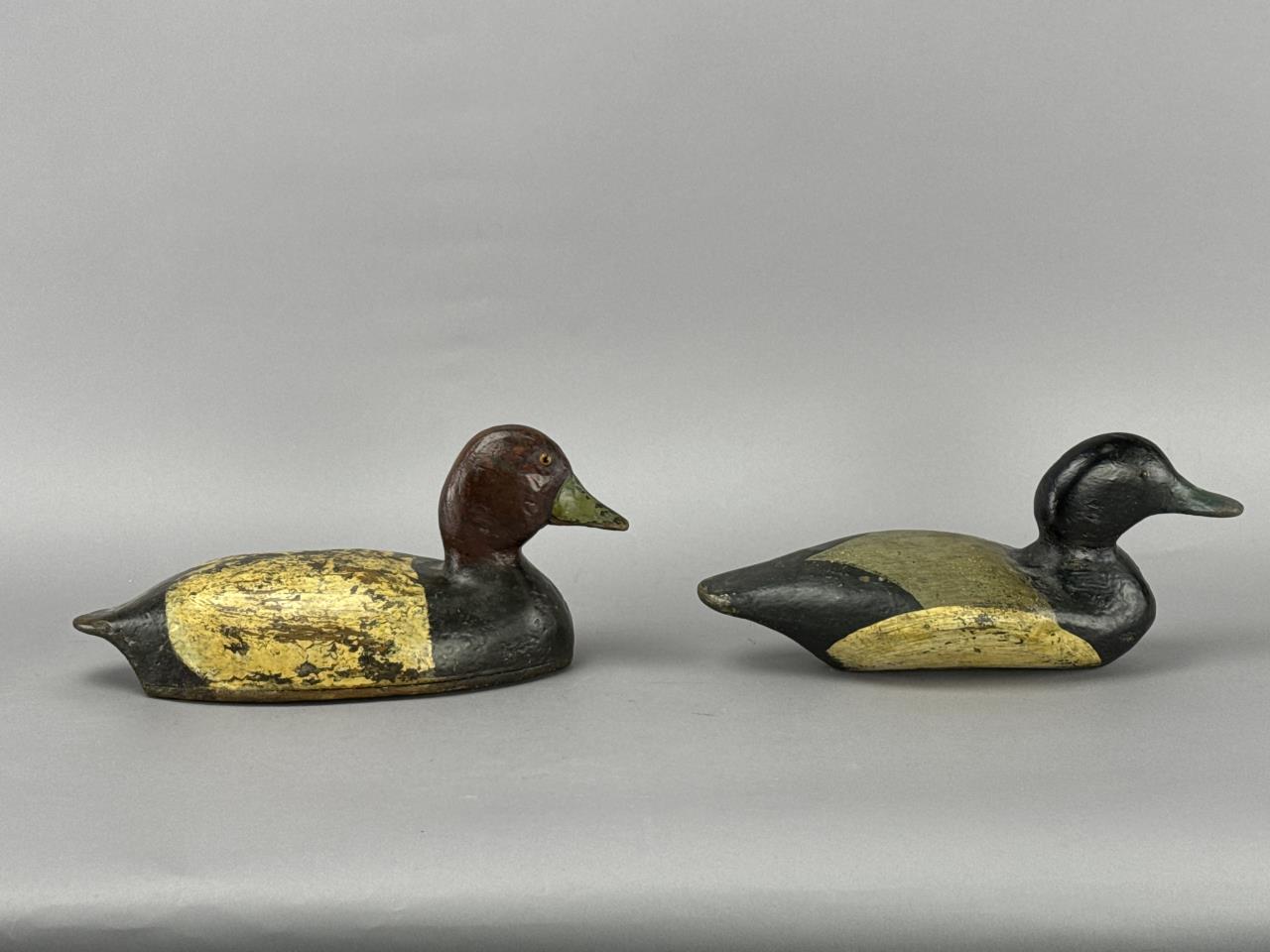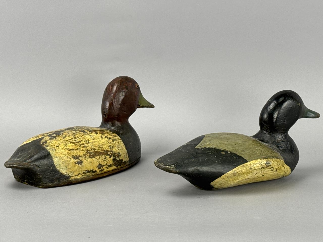 CONDITION: The decoys display visible wear consistent with age and use, including chipping, surface cracking, and paint loss primarily on the body and bottom edges. Minor scuffing and dents are present on the heads and bills. No visible structural damage or breaks were detected, and the felt pads remain intact on the bases. Overall, these decoys are in good structural condition, retaining their charm and hand-crafted authenticity.