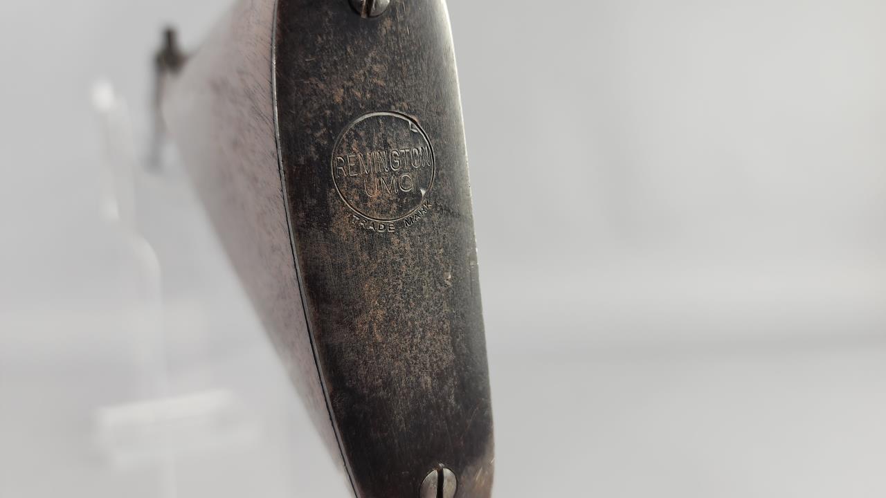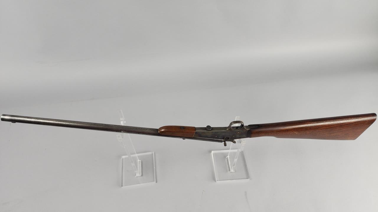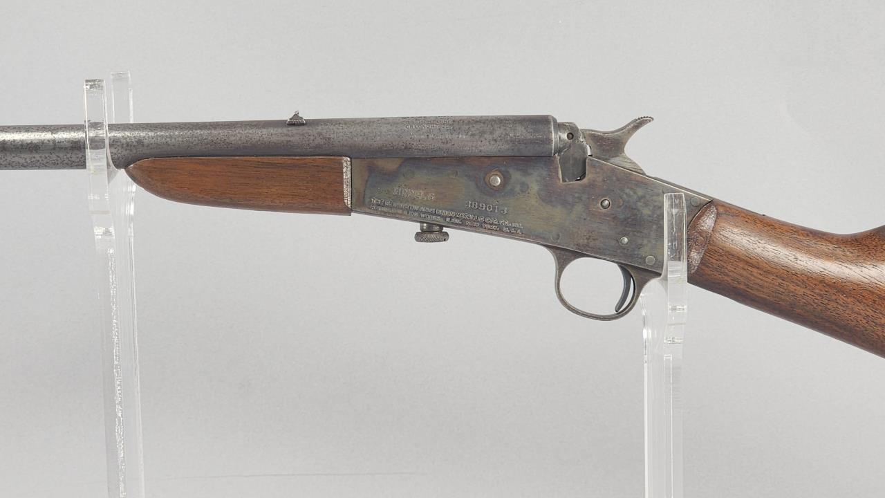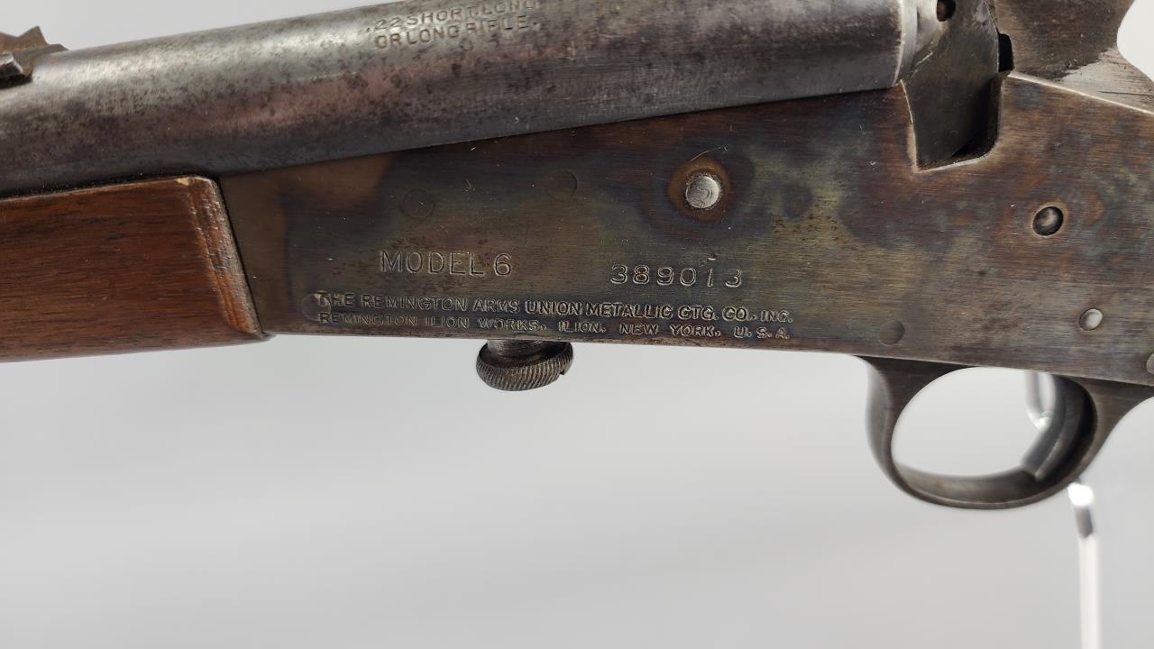 Remington Model 6, .22 caliber single-shot rifle, serial number 389013. Manufactured by Remington Arms Company in Ilion, New York. Chambered for .22 Short, Long, or Long Rifle cartridges, this rifle features a 20.25-inch round steel barrel and a straight-grip walnut stock with matching walnut forearm. The receiver exhibits a case-hardened finish, while the barrel shows a blued finish that has experienced wear. The rifle is equipped with a fixed blade front sight and a notch rear sight. The buttplate is marked “REMINGTON UMC TRADEMARK.” This is a falling block, single-shot rifle, a design emphasizing simplicity and reliability. Background check required.