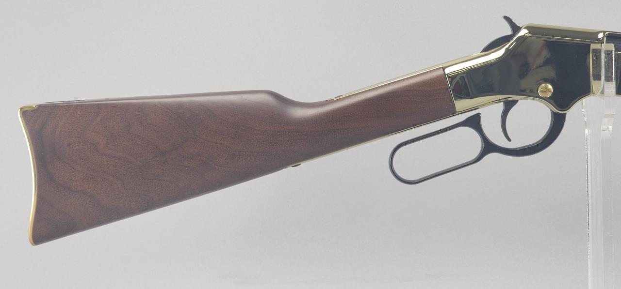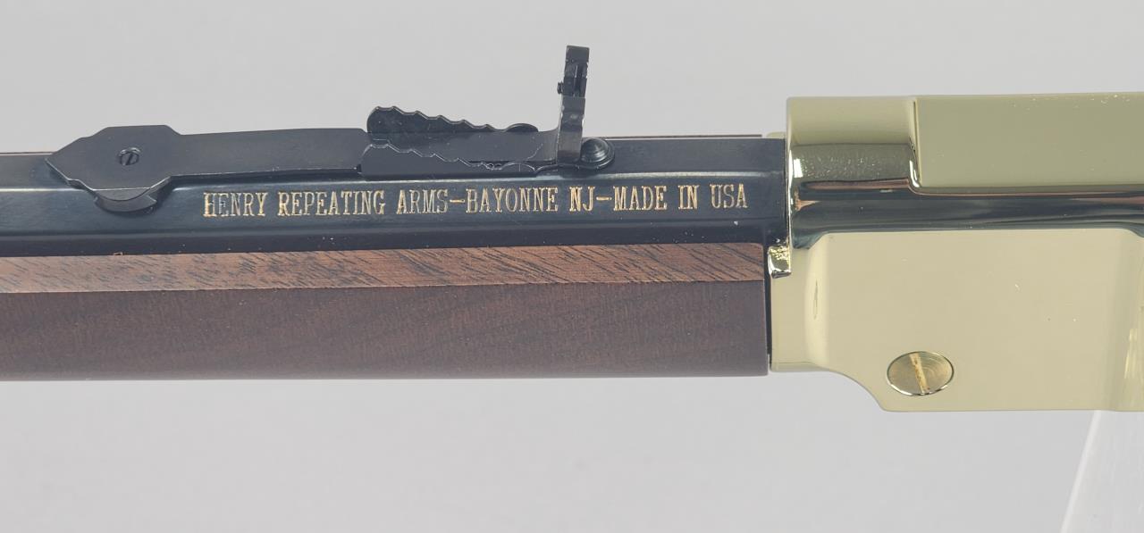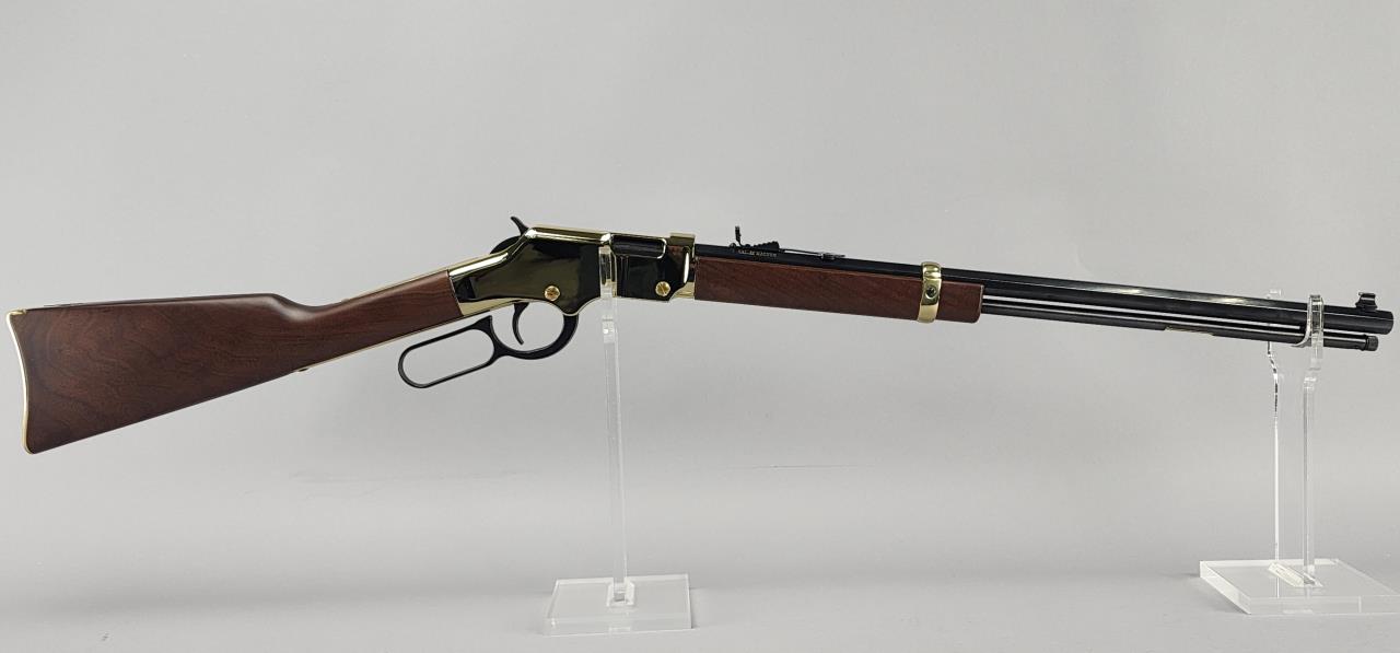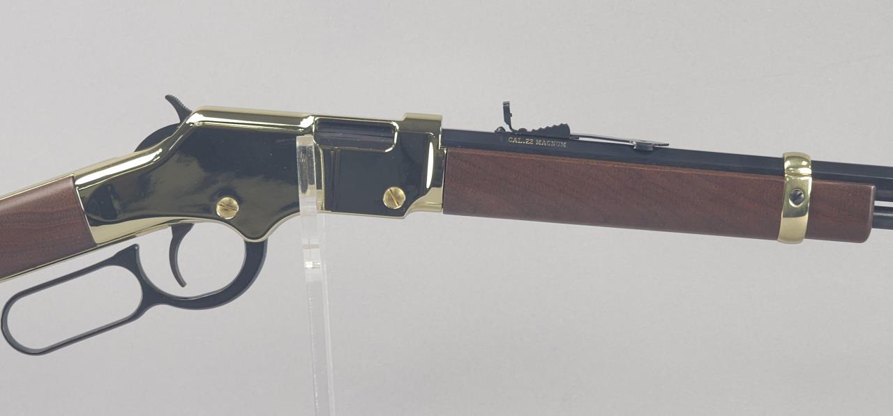 Henry Model H004M lever-action rifle chambered in .22 WMR. Featuring a 20.5-inch octagonal blued barrel and a brass-plated receiver with a polished finish. The rifle is fitted with a straight-grip wooden stock and matching forearm, both exhibiting a rich, smooth finish. Serial number GB177120M. Equipped with an adjustable semi-buckhorn rear sight and a brass blade front sight. The barrel is marked “Cal .22 Magnum,” and the top tang bears the inscription “HENRY REPEATING ARMS—BAYONNE NJ—MADE IN USA.” This visually striking lever-action rifle showcases quality craftsmanship and is known for its reliable performance and classic styling.