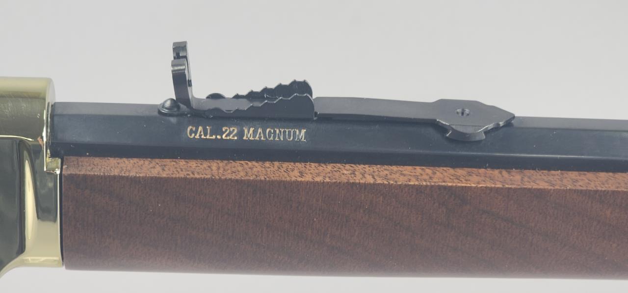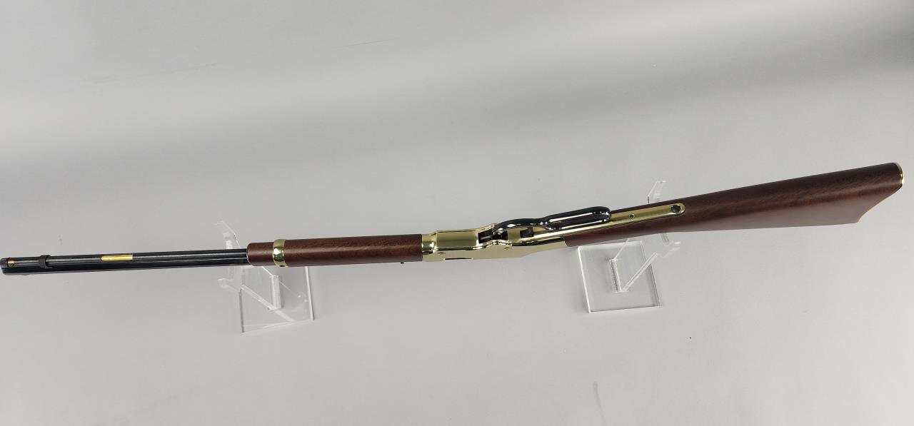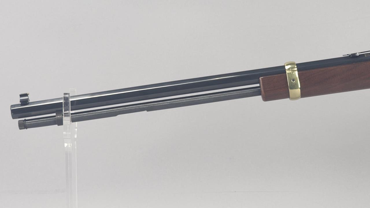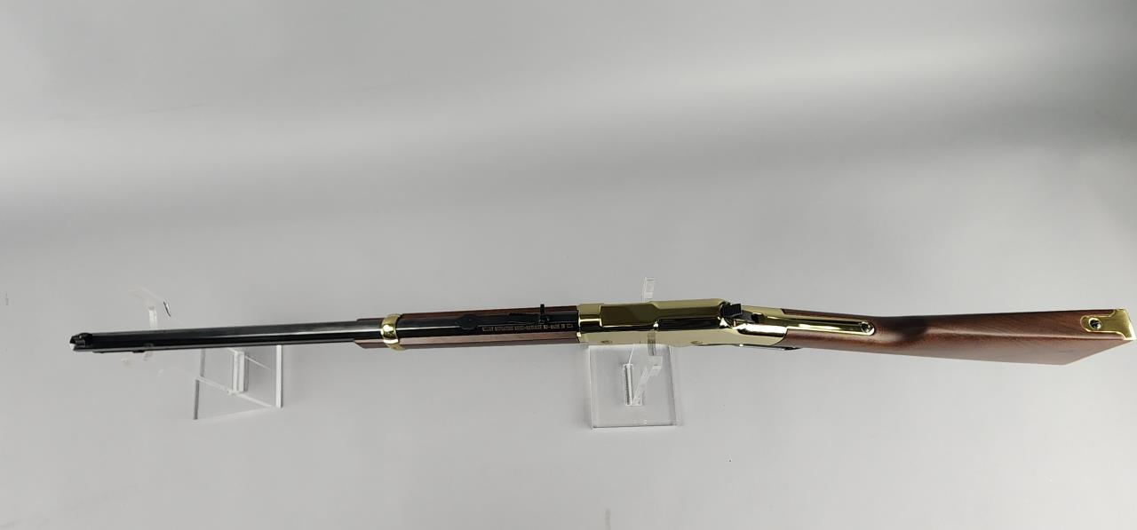 CONDITION: The rifle shows minimal signs of handling wear, with the brass-plated receiver and furniture maintaining a glossy finish. The blued barrel and magazine tube are largely free of blemishes, with light handling marks visible under close examination. The wooden stock and forearm are in excellent condition without noticeable cracks, chips, or major scratches. The action functions smoothly, and the adjustable sights are intact and functional. Bore condition is bright with well-defined rifling.