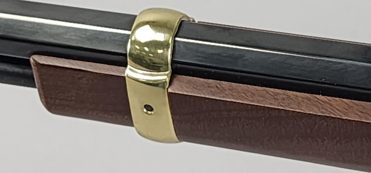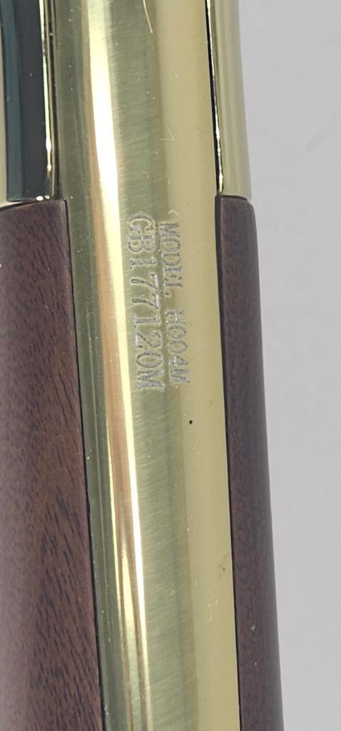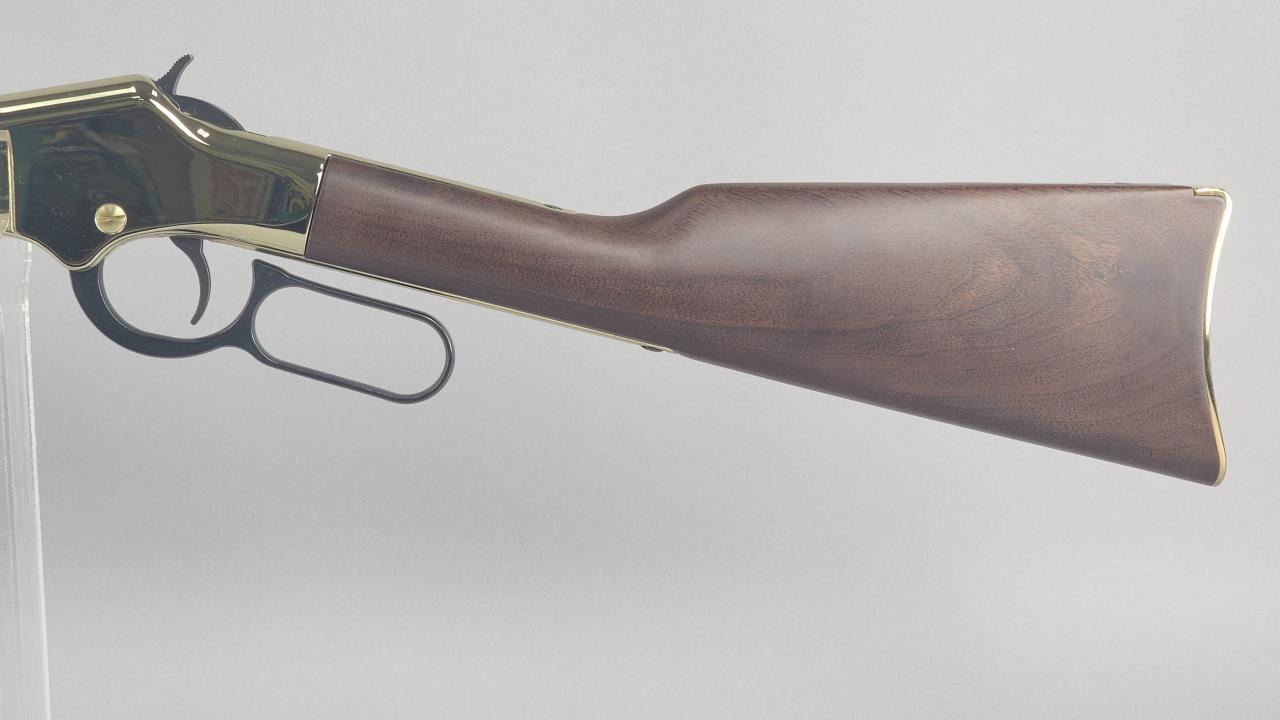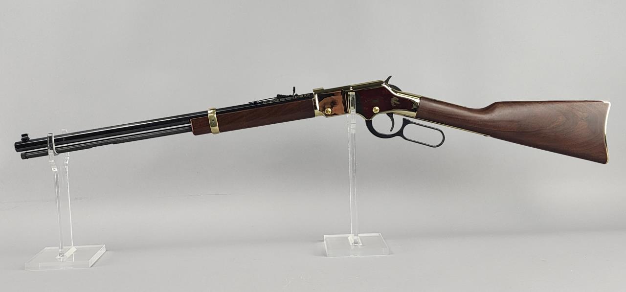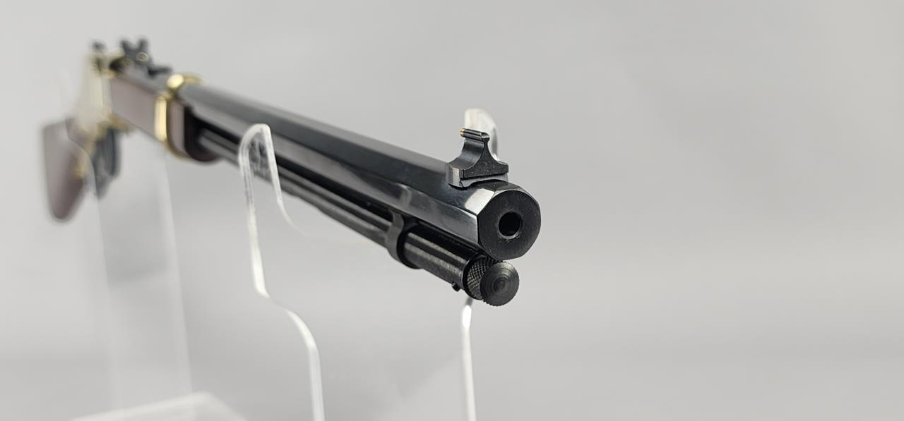 CONDITION: The rifle shows minimal signs of handling wear, with the brass-plated receiver and furniture maintaining a glossy finish. The blued barrel and magazine tube are largely free of blemishes, with light handling marks visible under close examination. The wooden stock and forearm are in excellent condition without noticeable cracks, chips, or major scratches. The action functions smoothly, and the adjustable sights are intact and functional. Bore condition is bright with well-defined rifling.