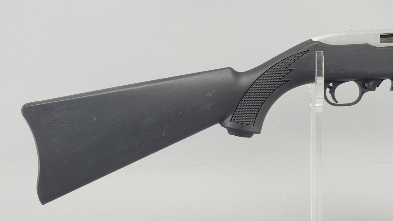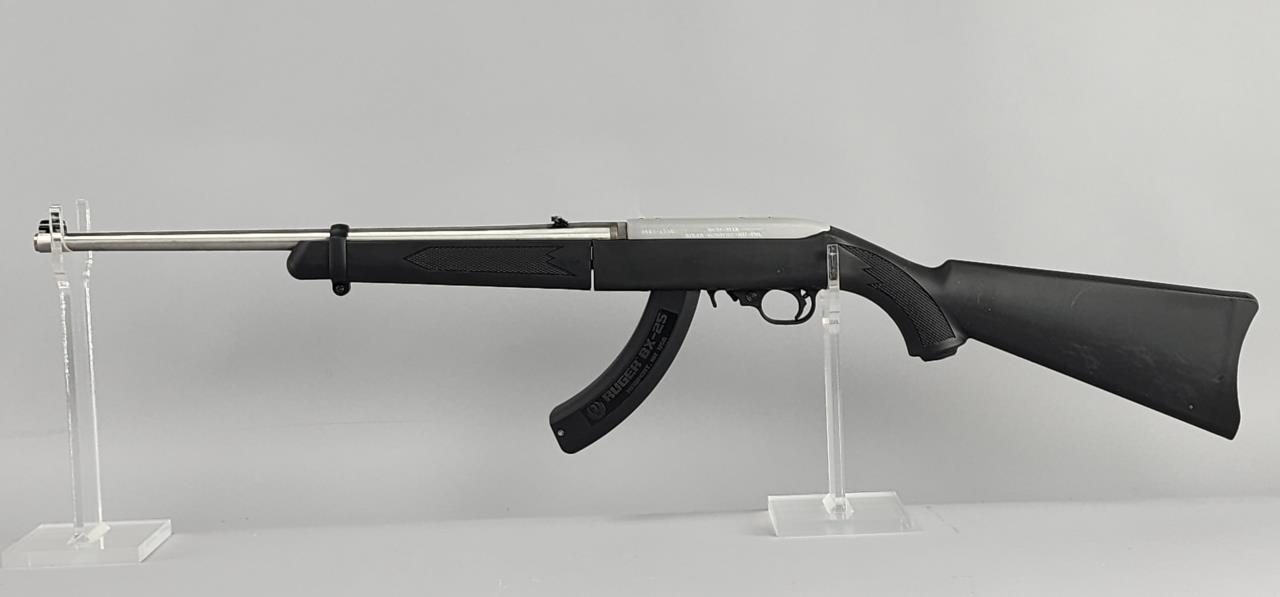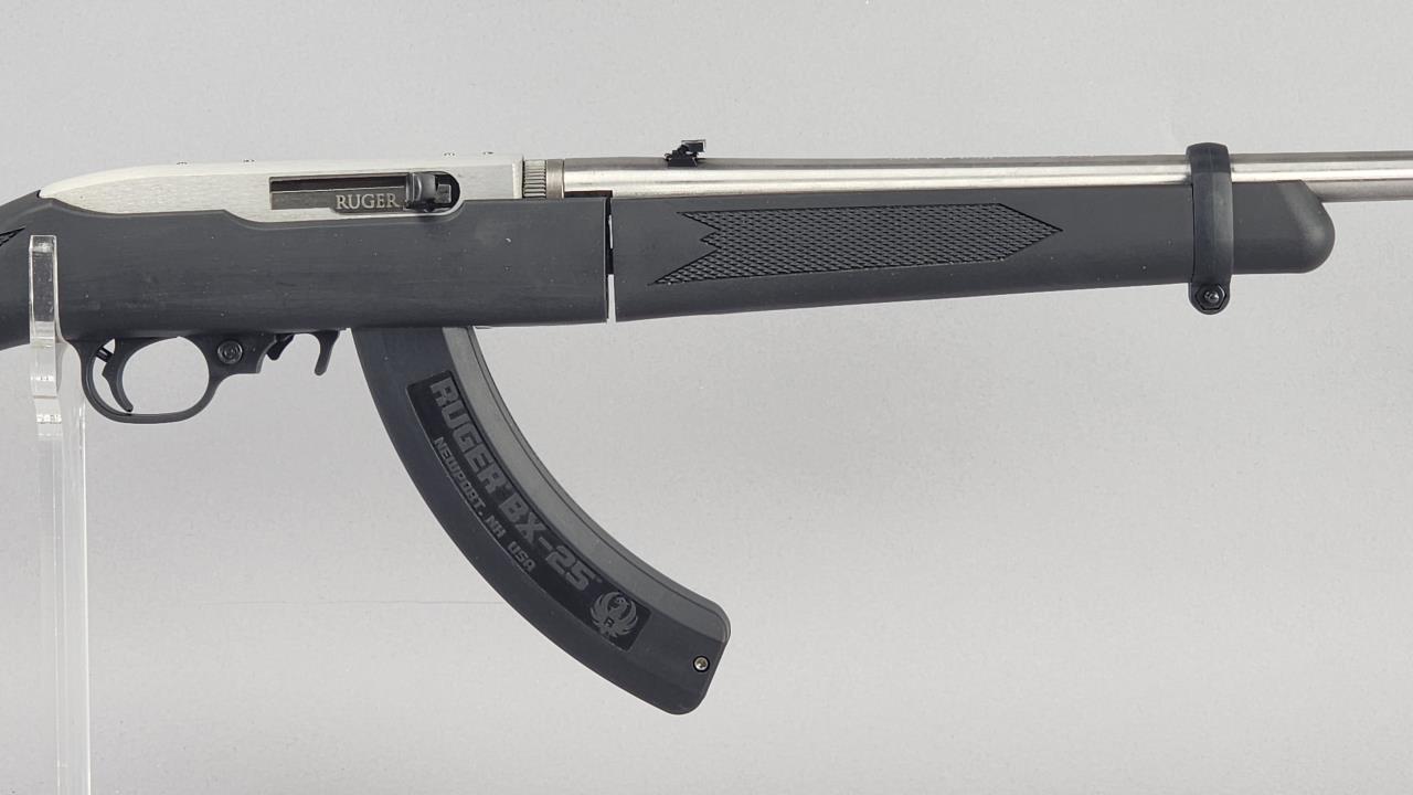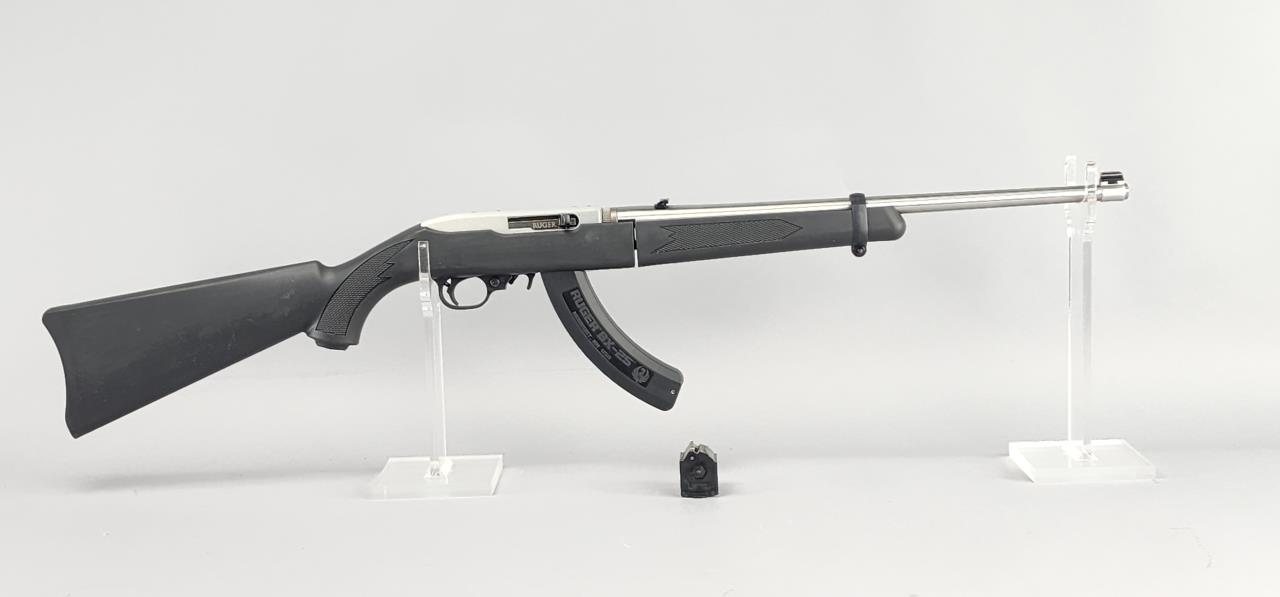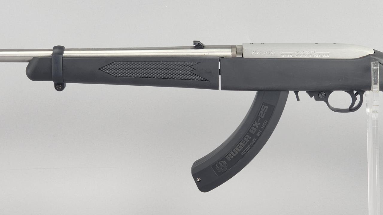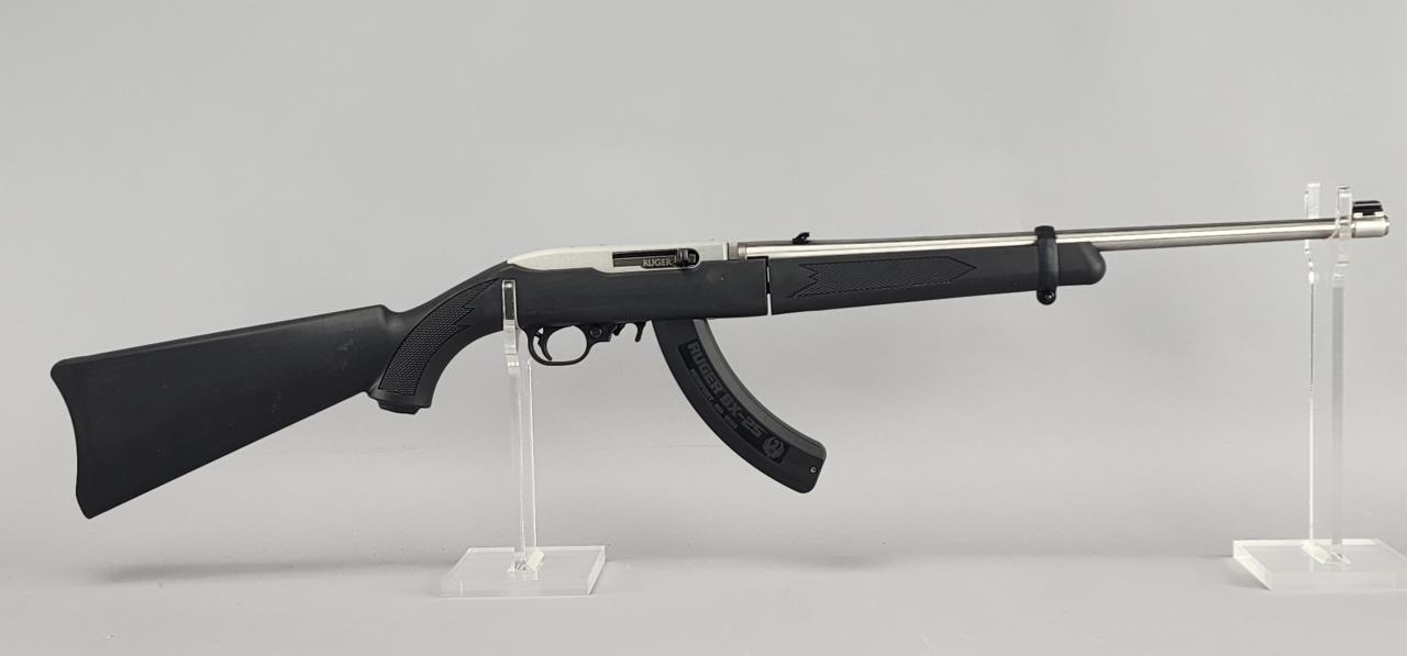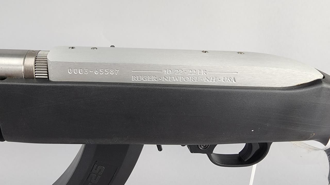 Ruger 10/22 Takedown semi-automatic rifle chambered in .22 LR. Features an 18.5-inch stainless steel barrel and a black synthetic stock with texturing on the grip and forearm for improved handling. The receiver is finished in matte stainless and marked with the serial number 0003-65587 and ‘RUGER · NEWPORT, NH · USA.’ Includes a 25-round Ruger BX-25 magazine and an additional 10-round magazine, both marked accordingly. This rifle is designed for easy disassembly and transport, making it ideal for takedown functionality. Equipped with a standard blade front sight and an adjustable rear sight. Complete with the original Ruger hard case and instruction manual. Background check required for transfer.