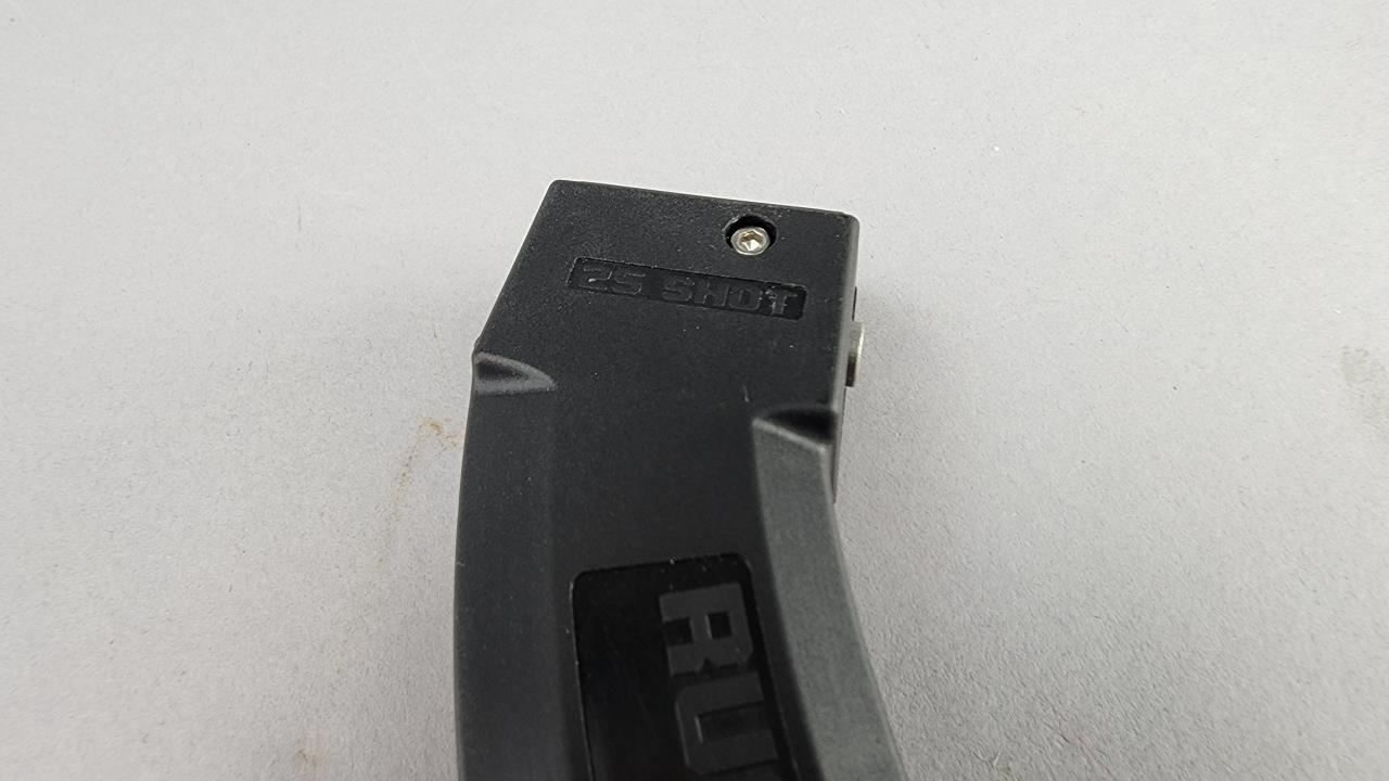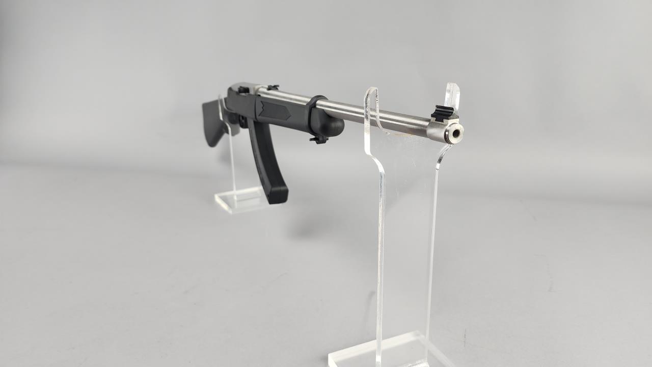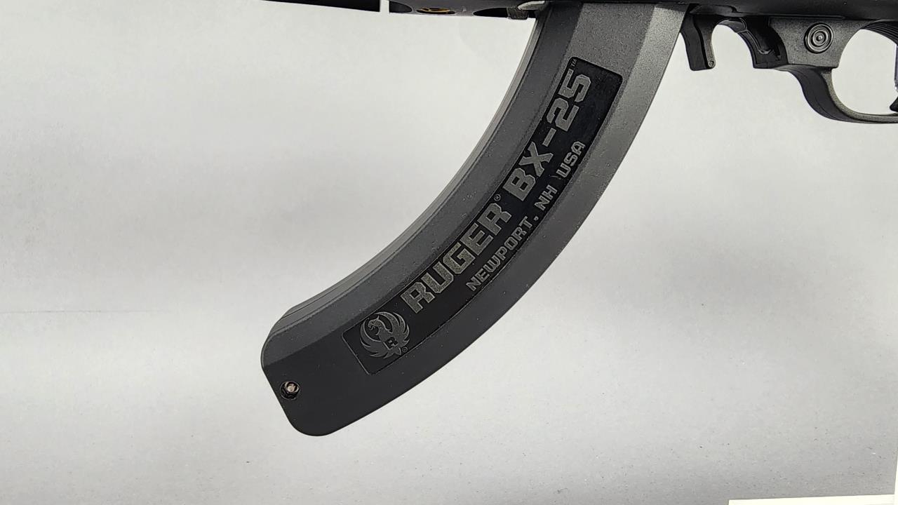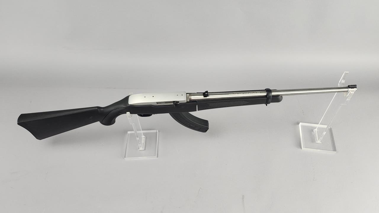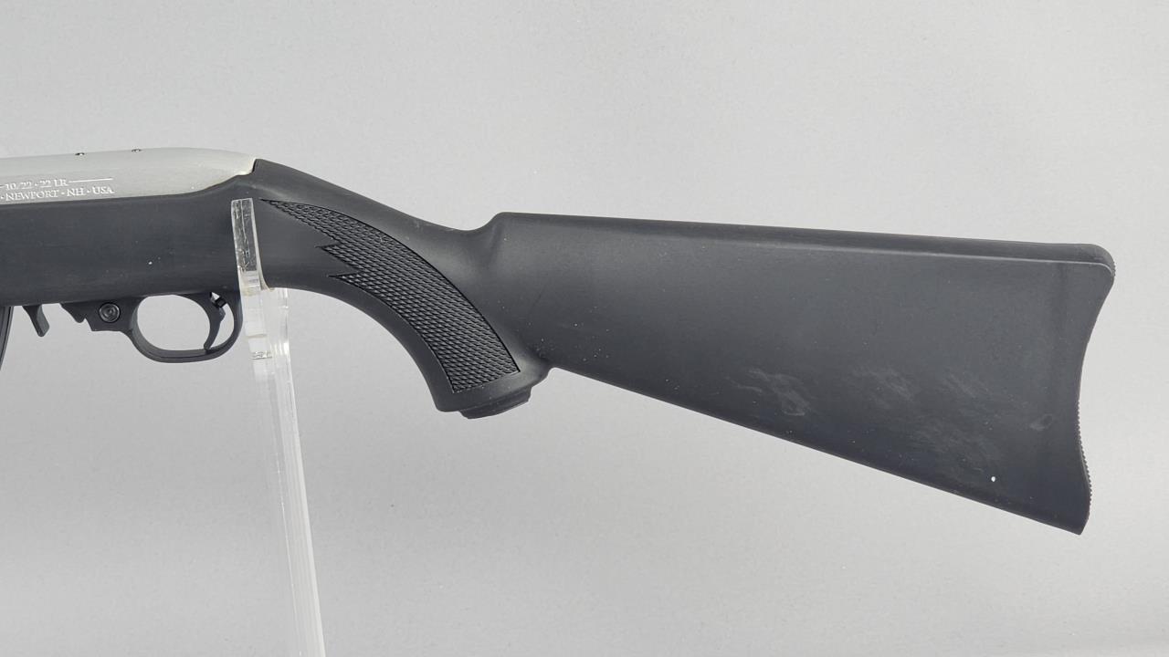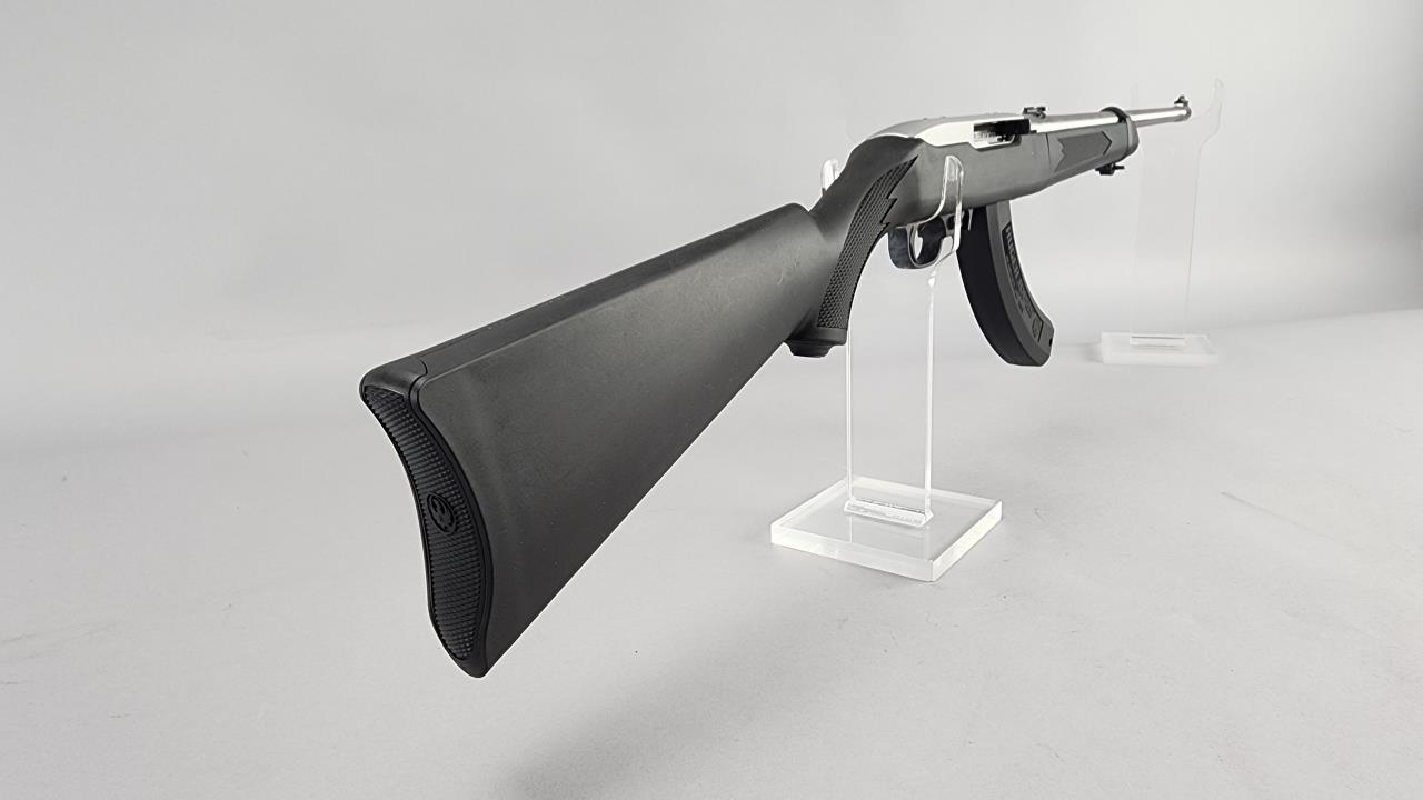 Ruger 10/22 Takedown semi-automatic rifle chambered in .22 LR. Features an 18.5-inch stainless steel barrel and a black synthetic stock with texturing on the grip and forearm for improved handling. The receiver is finished in matte stainless and marked with the serial number 0003-65587 and ‘RUGER · NEWPORT, NH · USA.’ Includes a 25-round Ruger BX-25 magazine and an additional 10-round magazine, both marked accordingly. This rifle is designed for easy disassembly and transport, making it ideal for takedown functionality. Equipped with a standard blade front sight and an adjustable rear sight. Complete with the original Ruger hard case and instruction manual. Background check required for transfer.