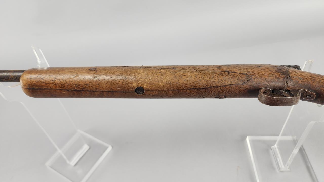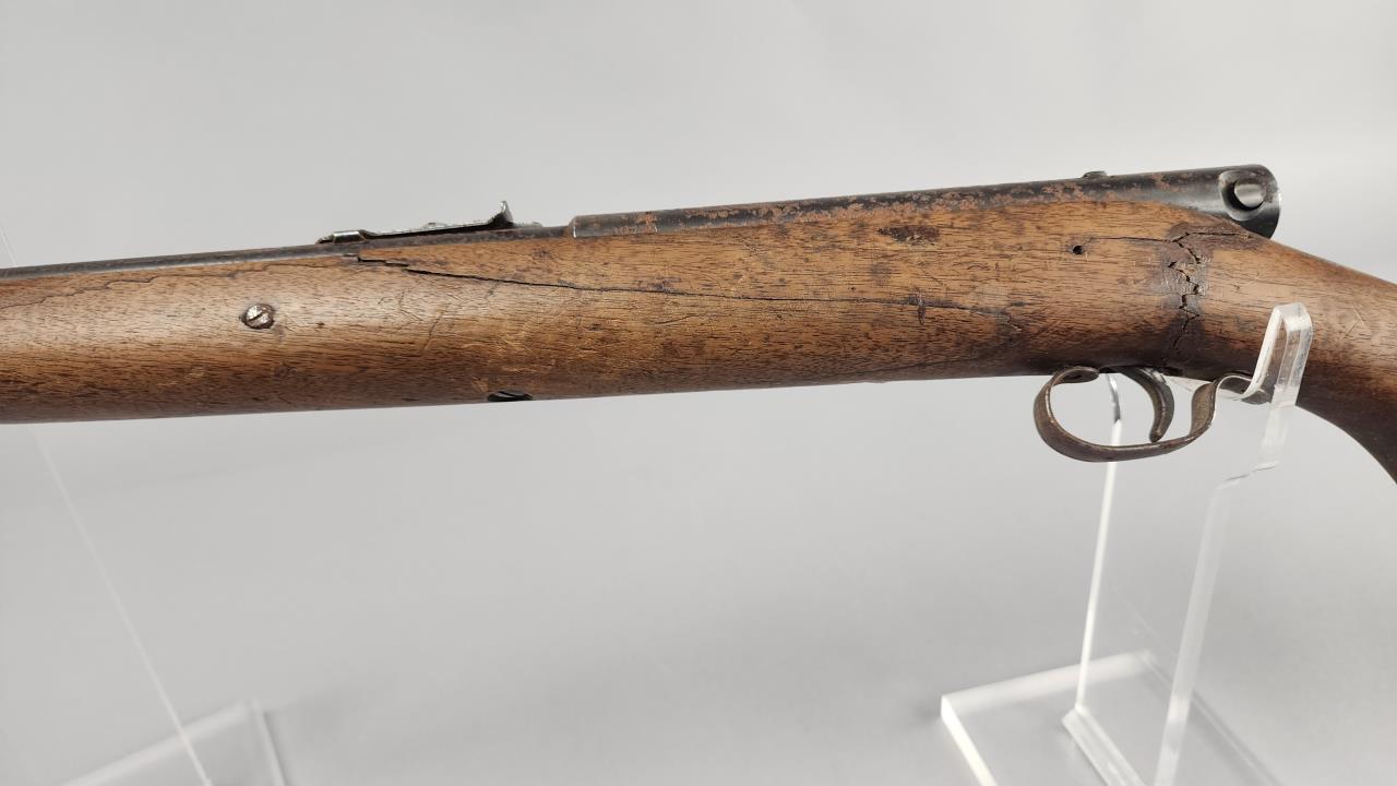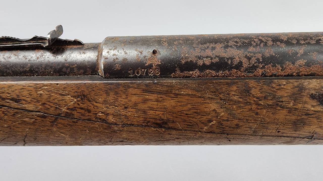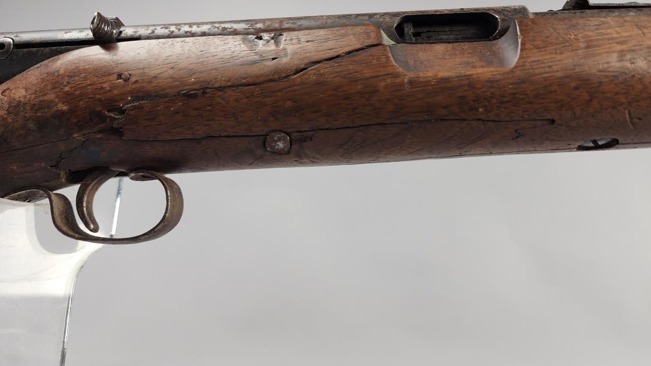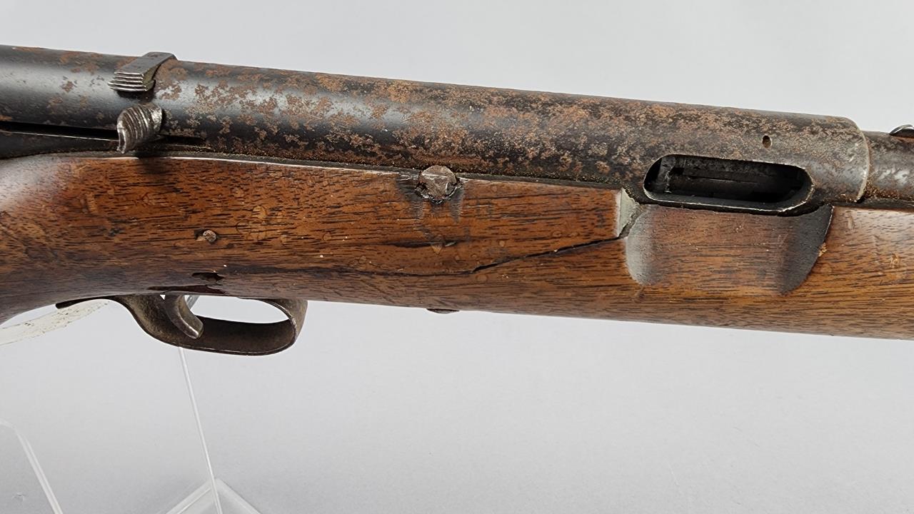 CONDITION: This rifle shows extensive surface wear. The metal components display significant patina and rust throughout. The wooden stock exhibits multiple large cracks, scratches, and wear consistent with long-term use and age. The stock’s buttplate appears worn but intact. The bore is described as darkening with intact rifling but no patina, according to provided notes. The action is reported as non-functional and does not open. This firearm has notable wear and structural compromises, requiring attention for restoration or repair.