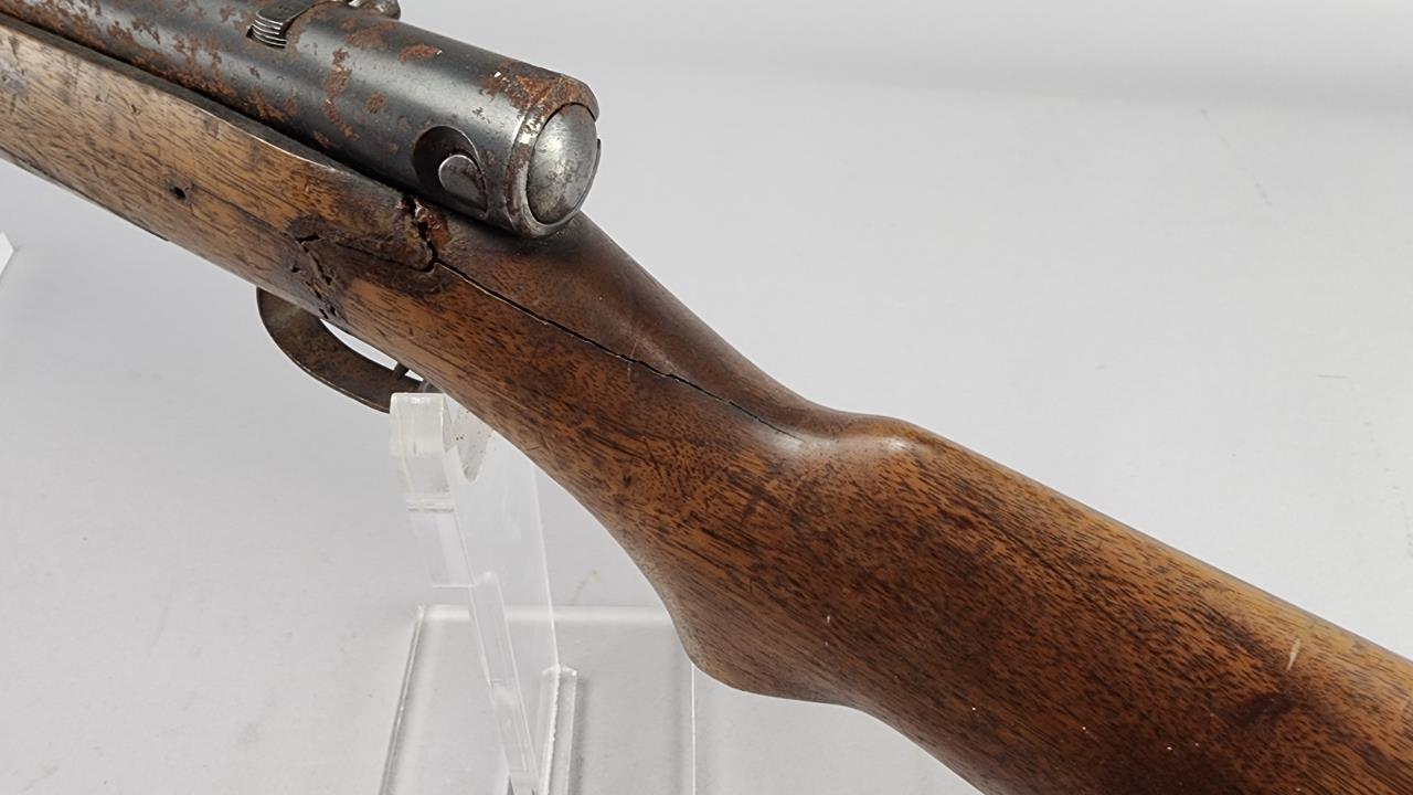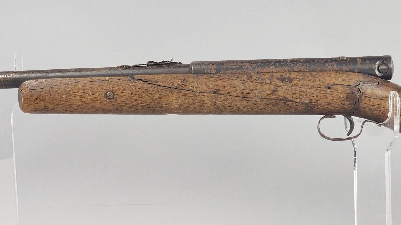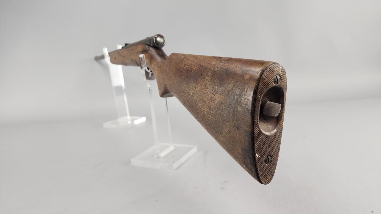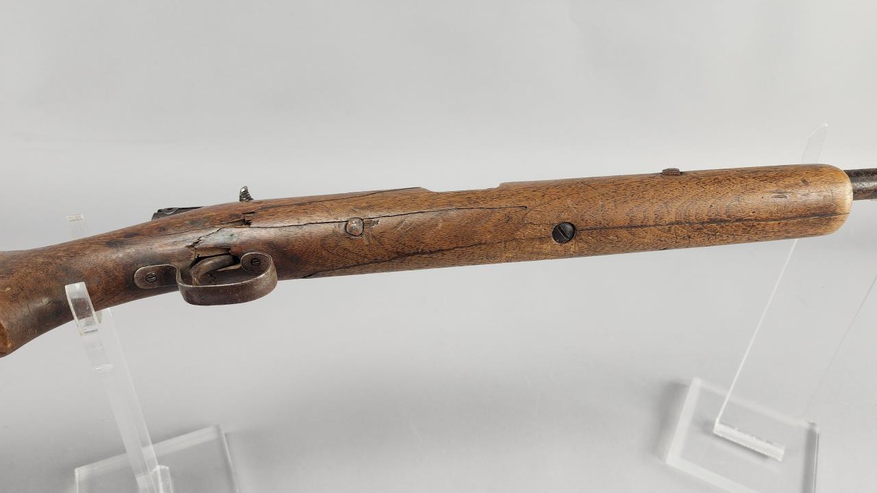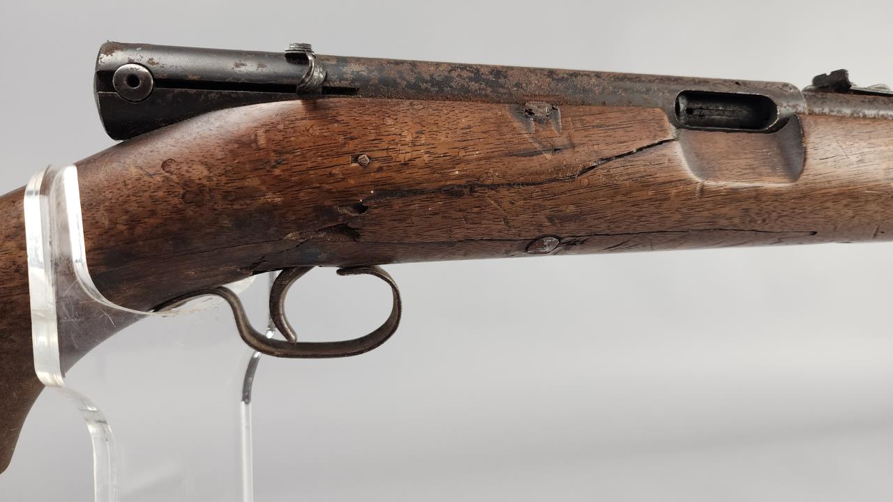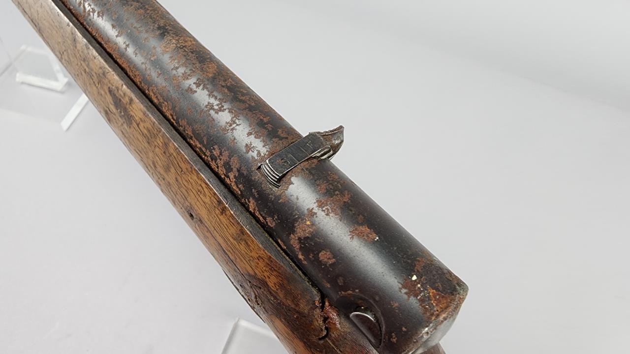 CONDITION: This rifle shows extensive surface wear. The metal components display significant patina and rust throughout. The wooden stock exhibits multiple large cracks, scratches, and wear consistent with long-term use and age. The stock’s buttplate appears worn but intact. The bore is described as darkening with intact rifling but no patina, according to provided notes. The action is reported as non-functional and does not open. This firearm has notable wear and structural compromises, requiring attention for restoration or repair.